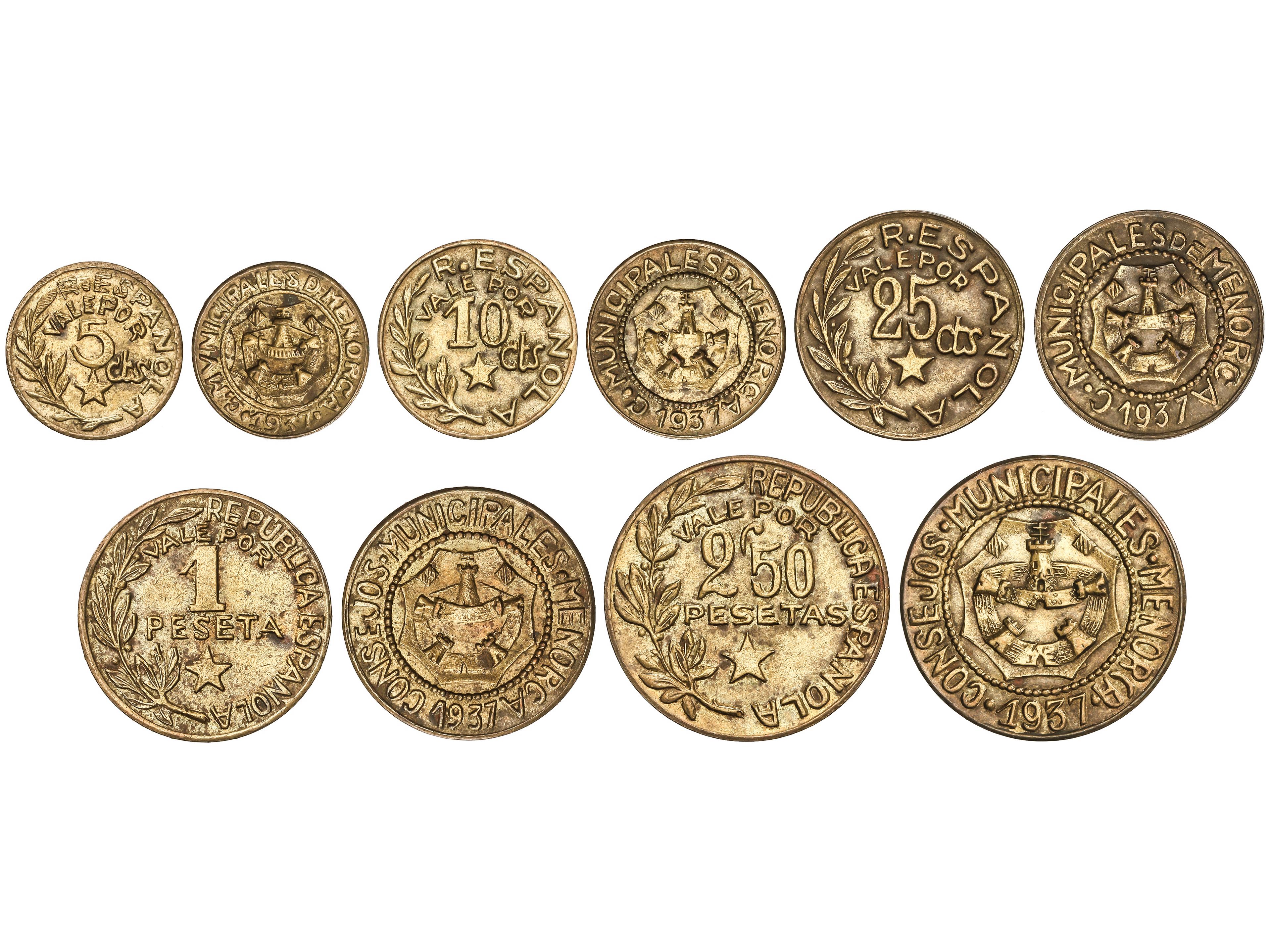 2275 imageSerie 5 monedas 5 Céntimos a 2, 50 Pesetas. 1937. C.M. de MENORCA. Latón. AC-20/24; HG-203/207; Vti-L6/L10. MBC+ a EBC-. (Image1)