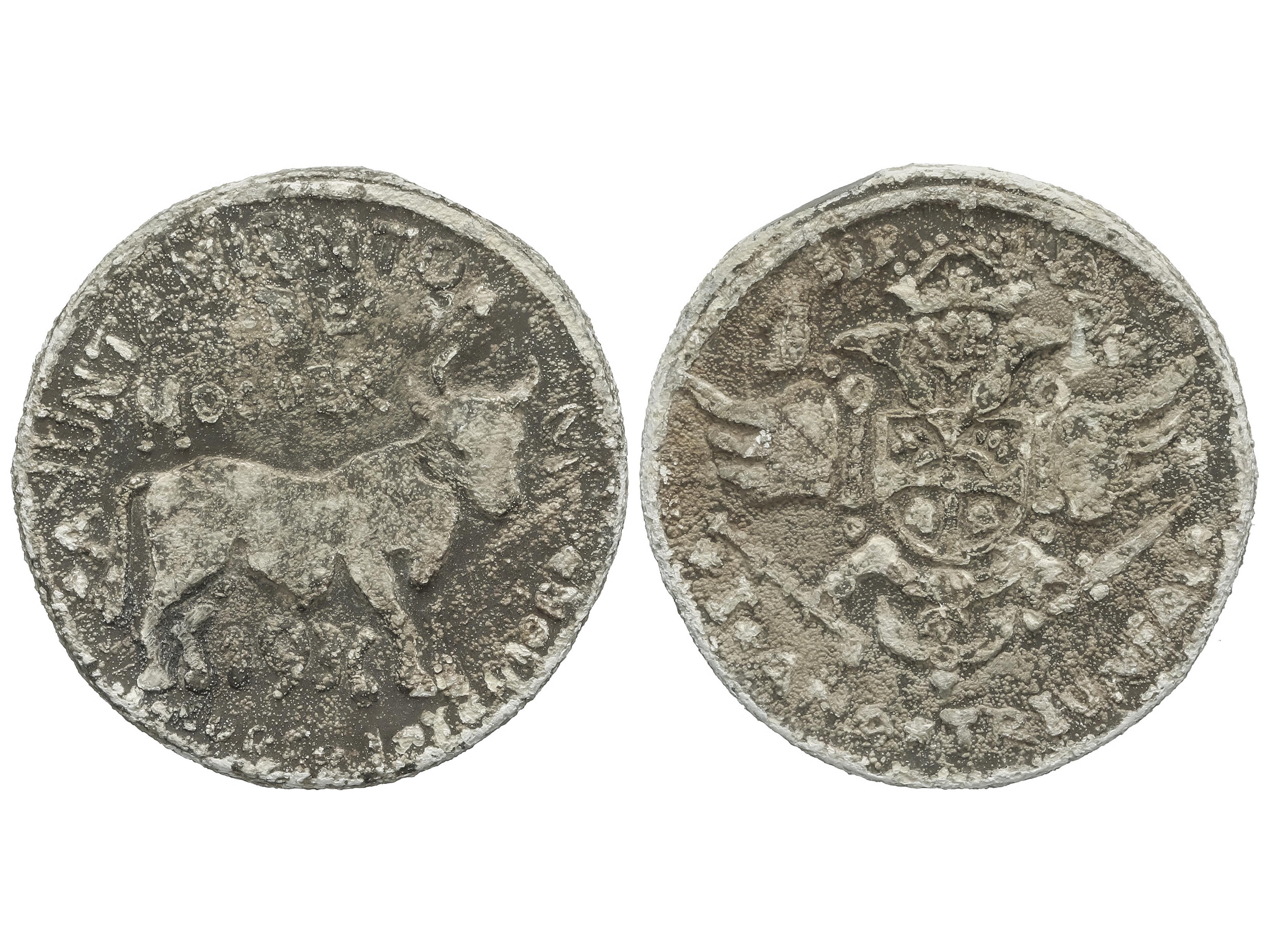 2276 image1 peseta. 1936. Aj. de MOGUER (Huelva). Plomo. I Año Triunfal. Algunos autores consideran estas piezas acuñadas con posterioridad a la Guerra Civil. (Oxidaciones). Vti-MCP/11. (MBC). (Image1)
