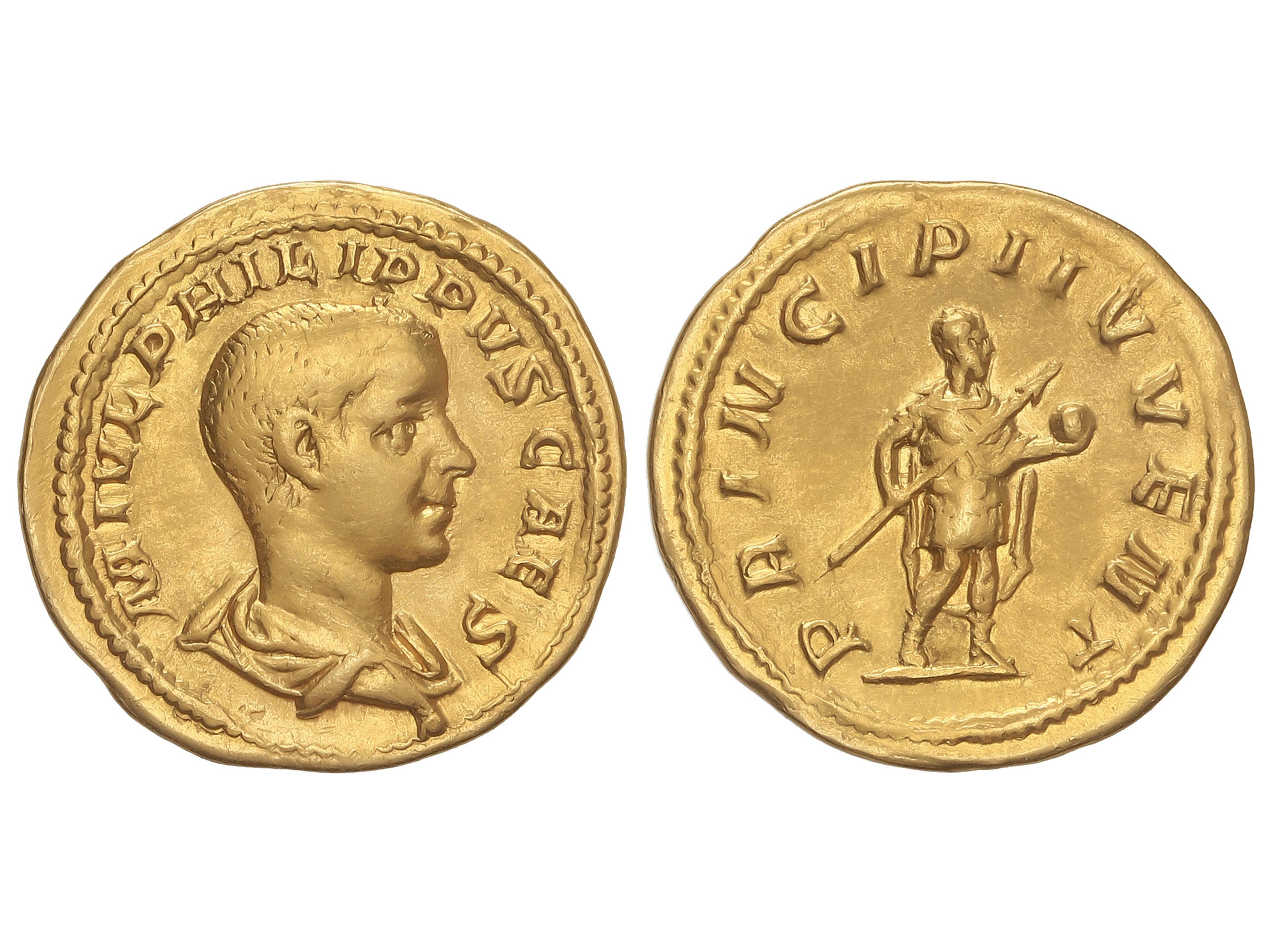 129 imageÁureo. 244-246 d.C. FILIPPO II. ROMA. Anv.: IVL. PHILIPPVS CAES. Su busto drapeado a derecha. Rev.: PRINCIPI IVVENT. Filipo II en pie a derecha, con lanza y globo. 4,32 grs. AU. (Perforación magistralmente reparada). RARA. C-52; RIC-216; XC-3276. MBC. Ex Soler y Llach y Martí Hervera 1088 - 15 octubre 2015, n. 259. (Image1)