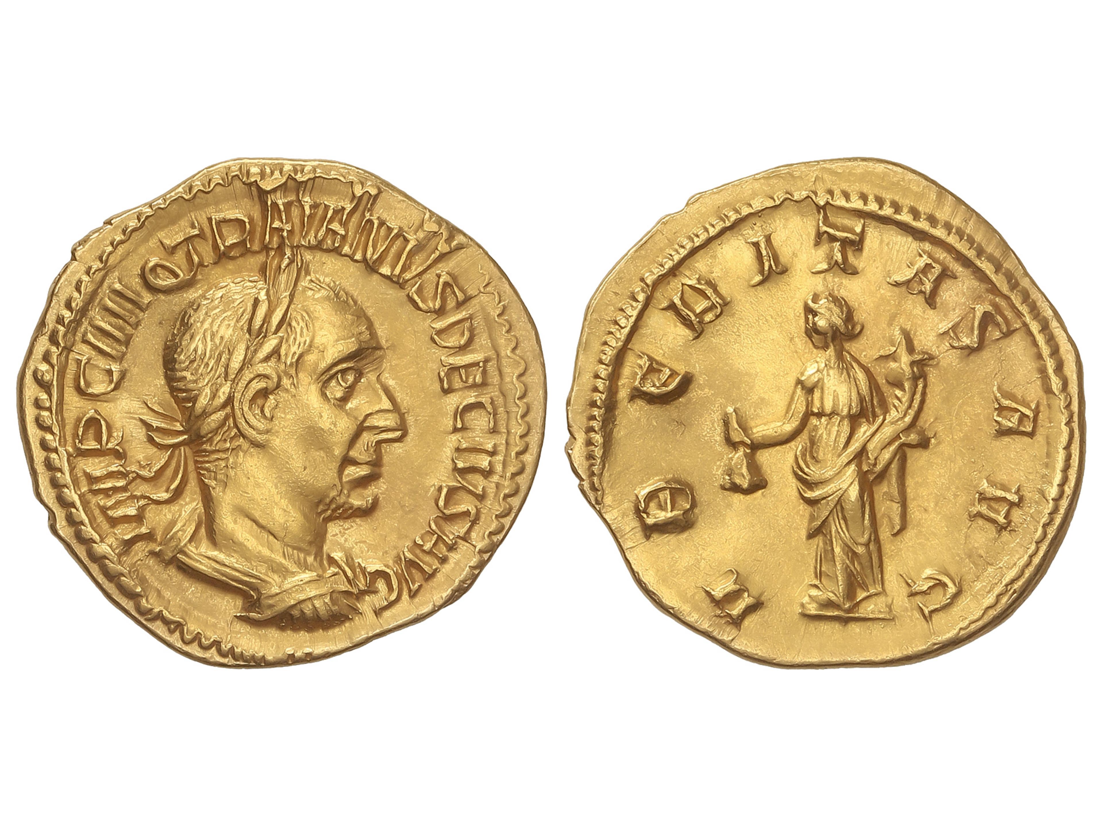 130 imageÁureo. 249-251 d.C. TRAJANO DECIO. Anv.: IMP. C. M. Q. TRAIANVS DECIVS AVG. Busto laureado y drapeado a derecha. Rev.: VBERITAS AVG. La Fertilidad en pie a izquierda con bolsa y cornucopia. 4,45 grs. AU. (Perforación en la parte posterior de la cabeza magistralmente reparada según CNG, totalmente imperceptible). Bello ejemplar. RARA. C-104 anv.; RIC-28; XC-3299. (EBC). Ex CNG 412 - 17 enero 2018, n. 651. (Image1)