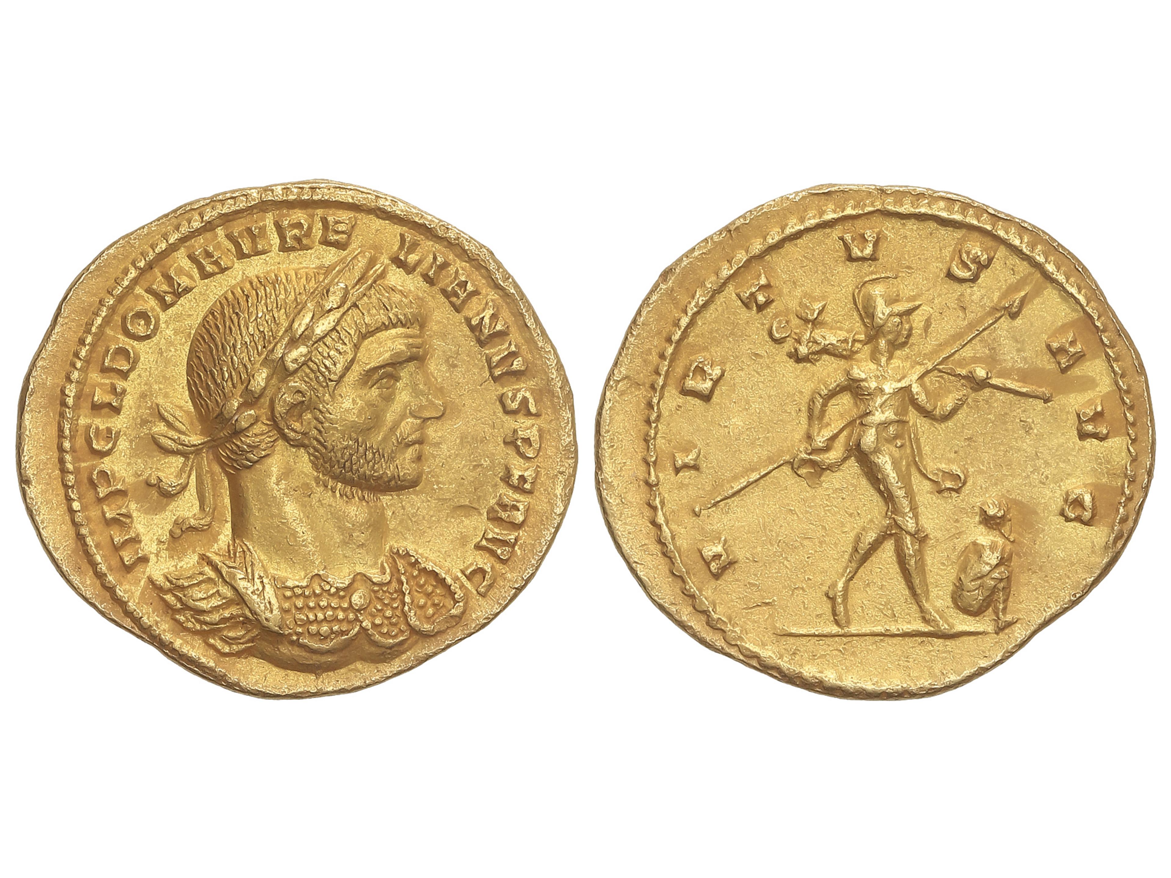 131 imageÁureo. 270-275 d.C. AURELIANO. Anv.: IMP. C. L. DOM. AVRELIANVS P. F. AVG. Busto laureado y acorazado a derecha. Rev.: VIRTVS AVG. Marte caminando a derecha con lanza y trofeo, a sus pies, cautivo sentado en el suelo. 4,34 grs. AU. (Pequeñas marquitas). Muy buen ejemplar. C-269; RIC-15; XC-4048. EBC+. (Image1)