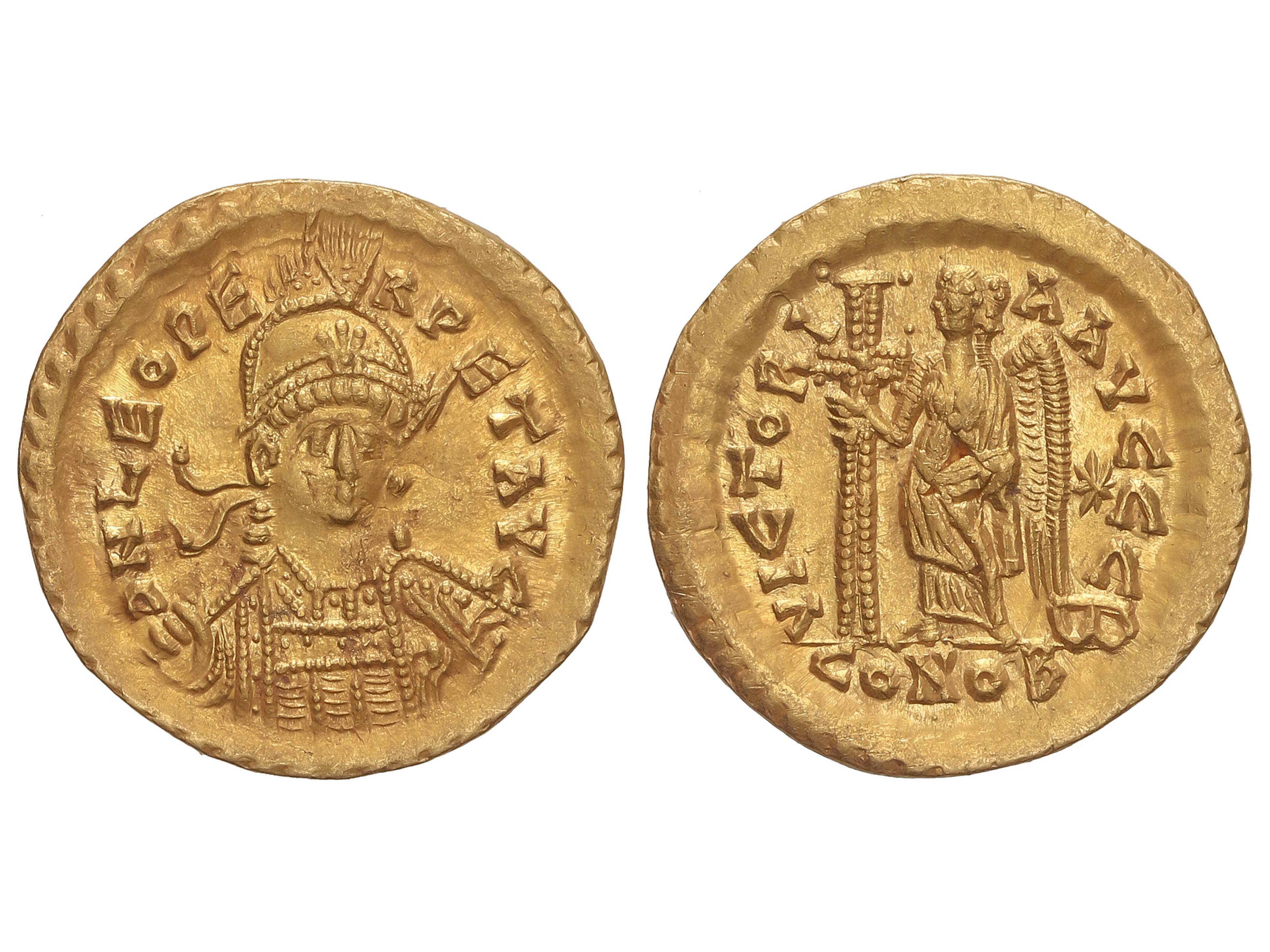 134 imageSólido. 457-474 d.C. LEÓN I. CONSTANTINOPLA. Anv.: D. N. LEO PERPET. AVG. Busto de frente con coraza, casco, lanza y escudo. Rev.: VICTORIA AVGGG. I. En exergo: CONOB. Victoria en pie a izquierda con cruz, estrella en campo. 4,51 grs. AU. RIC-605. EBC-. (Image1)