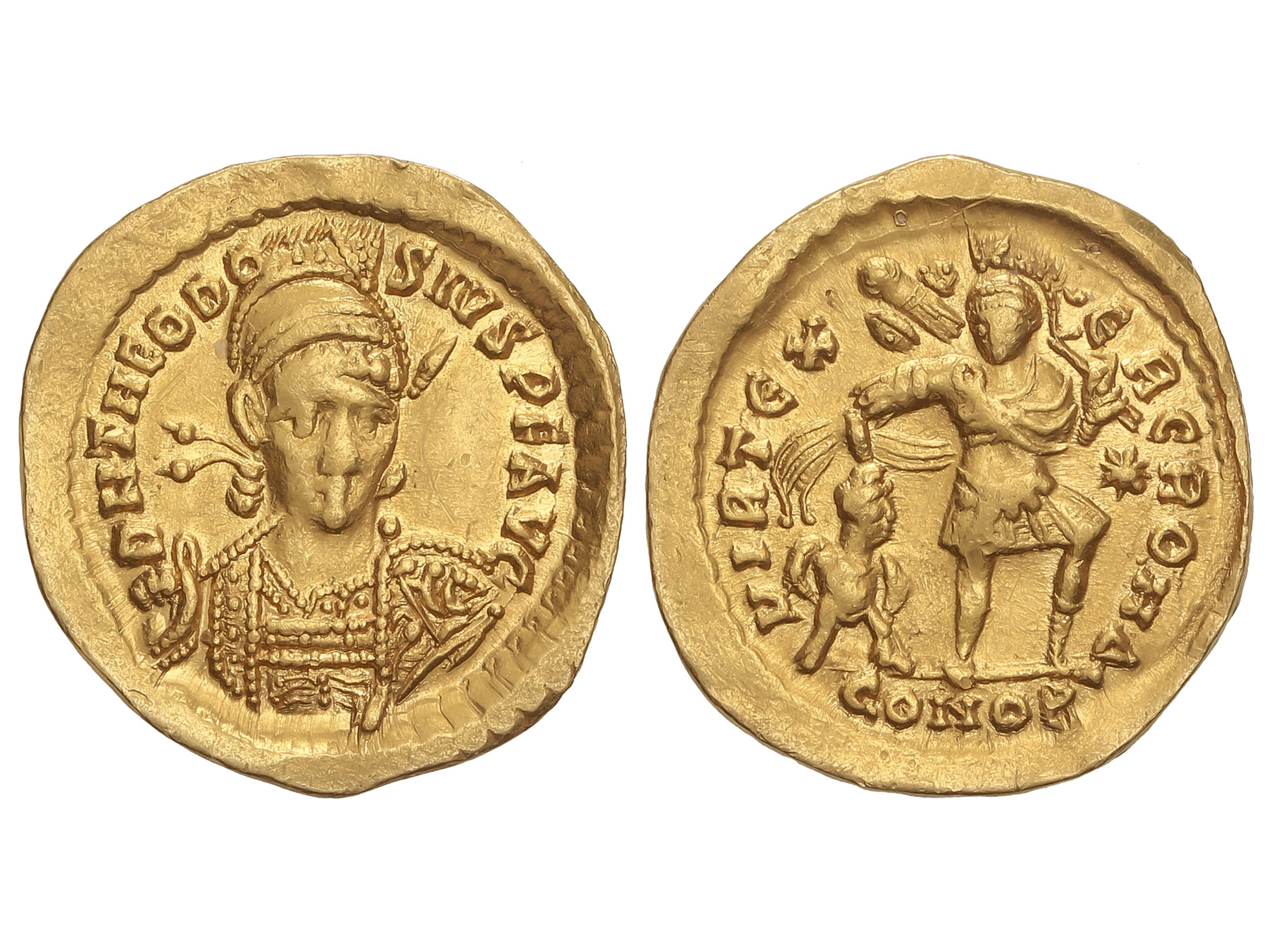 132 imageSólido. 402-450 d.C. TEODOSIO II. CONSTANTINOPLA. Anv.: DN THEODO-SIVS PF AVG. Busto con casco, escudo y lanza de frente. Rev.: VIRTEX-ERC ROMA. Soldado avanzando hacia derecha, arrastrando a un cautivo y sosteniendo un trofeo sobre el hombro; estrella en campo derecho, CONOB en exergo. 4,20 grs. AU. RIC 284. MBC+. (Image1)