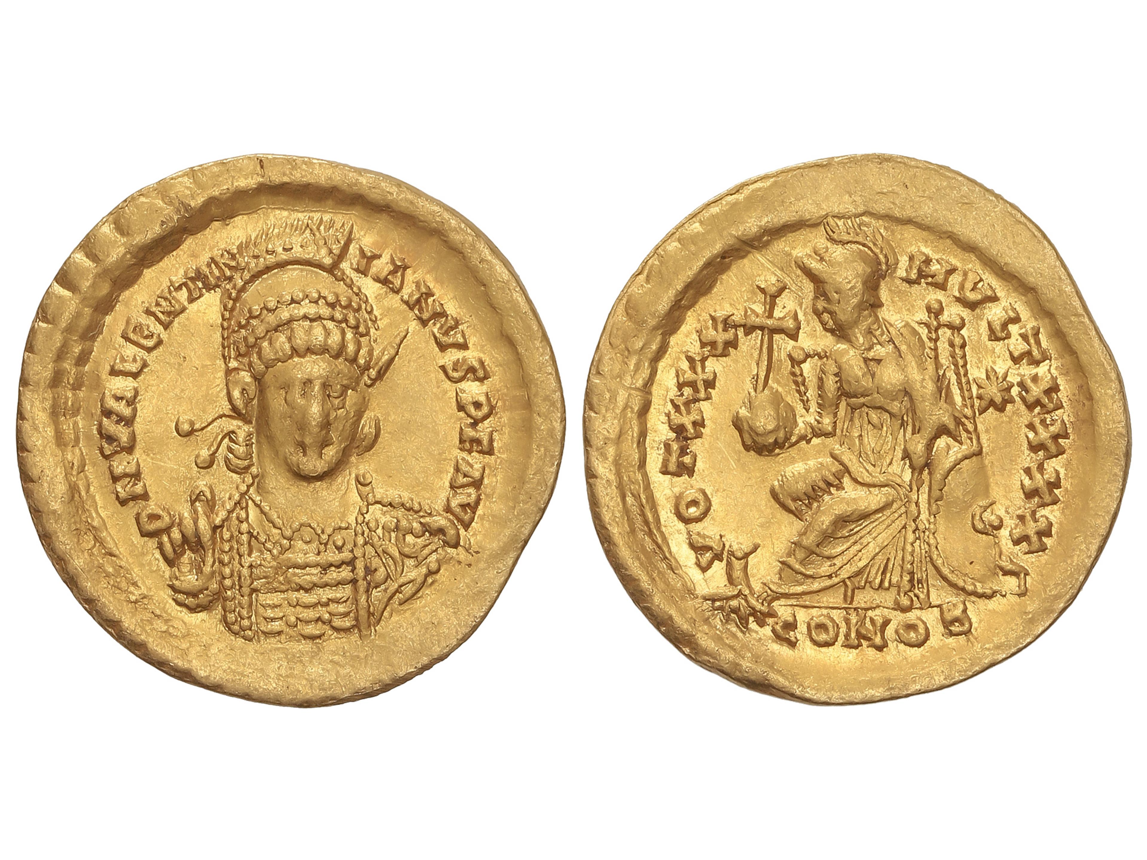 133 imageSólido. 425-455 d.C. VALENTINIANO III. CONSTANTINOPLA. Anv.: DN VALENTIN-IANVS PF AVG. Busto con casco, escudo y lanza de frente. Rev.: VOT XXX MVLT XXXX B, CONOB en exergo. Constantinópolis, con casco y manto, sentado a izquierda, sosteniendo el globo crucífero en la mano derecha y cetro en la izquierda; escudo junto al trono. 4,43 grs. AU. ESCASA. RIC-260. MBC+. (Image1)