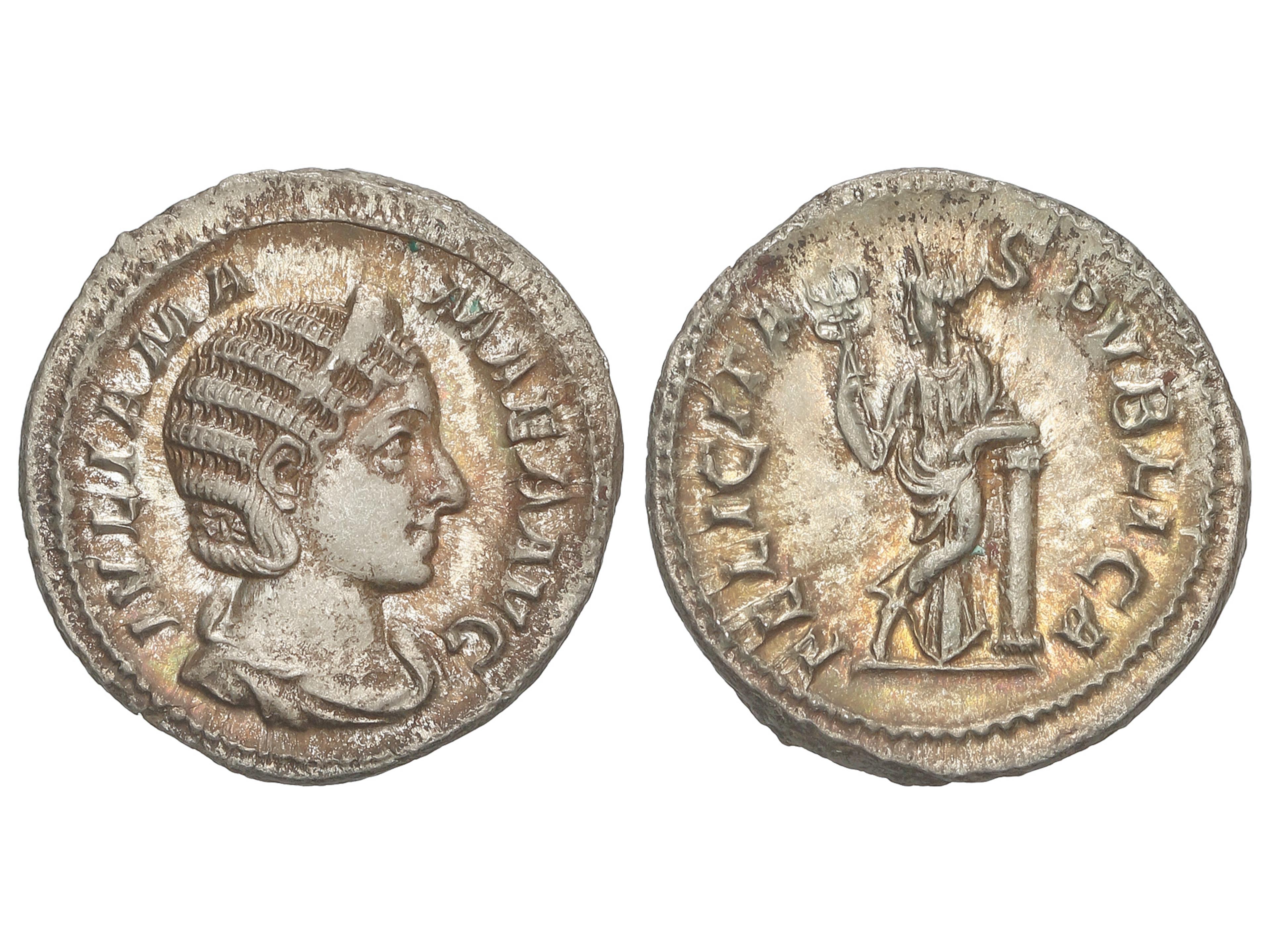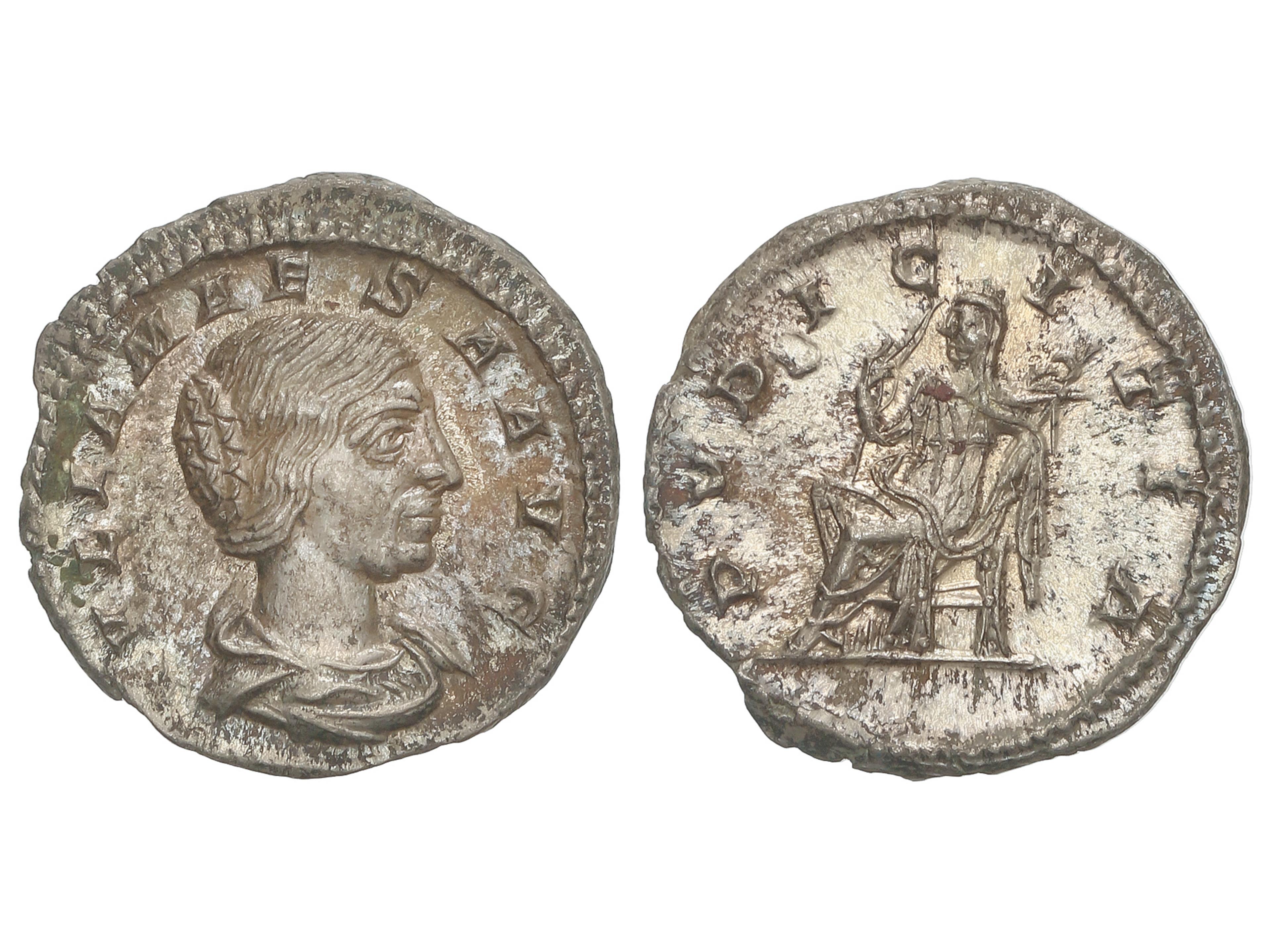 122 imageDenario. 235 d.C. JULIA MAMAEA. Anv.: IVLIA MAMAEA AVG. Busto diademado de Julia Mamaea a derecha. Rev.: FELICITAS PVBLICA. Felicidad estante a izquierda. 3,57 grs. AR. Pátina, brillo original. C-17; RIC-335. EBC. (Image1)