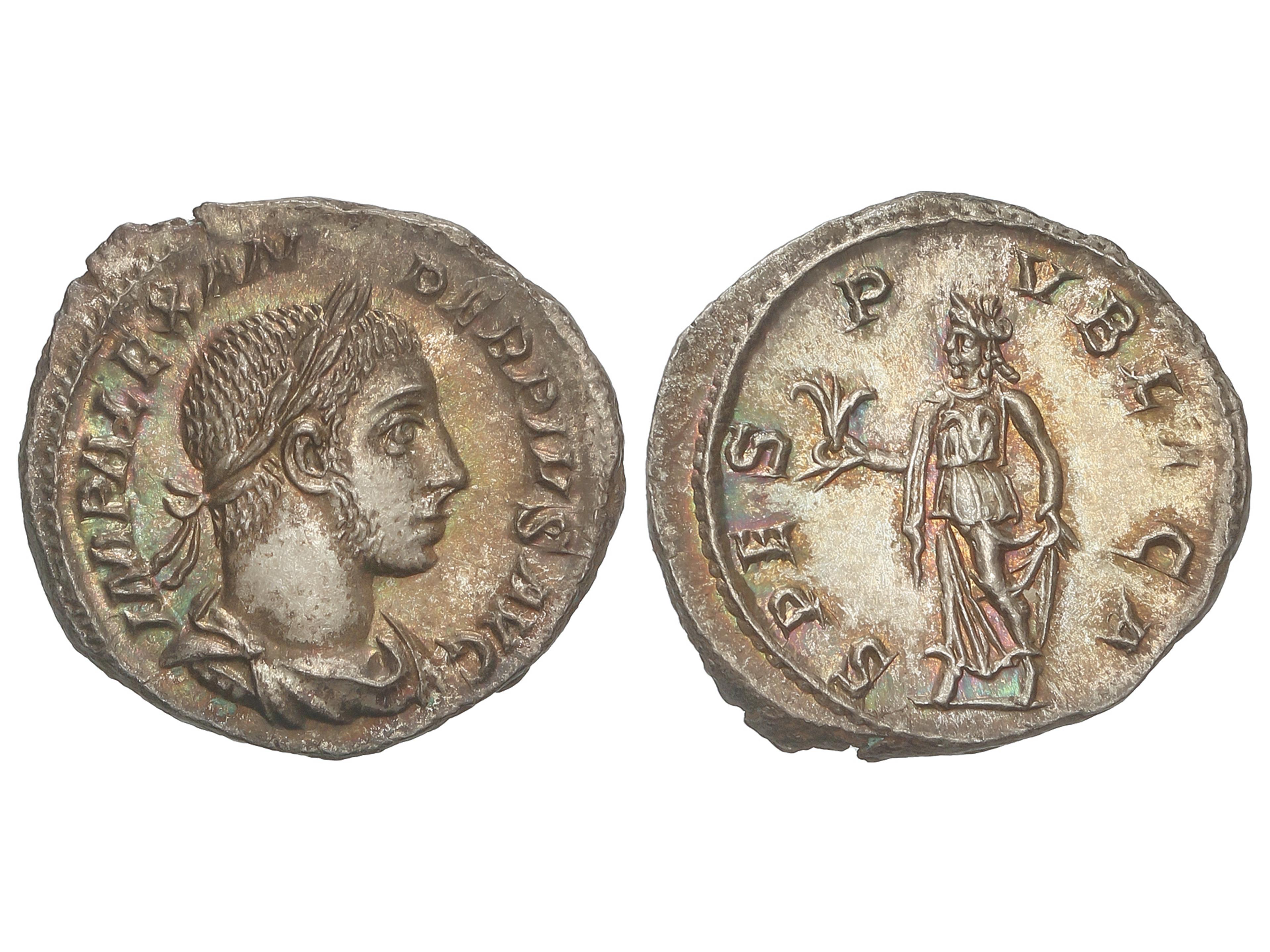 125 imageDenario. 231-235 d.C. ALEJANDRO SEVERO. Anv.: IMP. ALEXANDER PIVS AVG. Busto laureado a derecha. Rev.: SPES PVBLICA. Esperanza en pie a izquierda. 3,43 grs. AR. Pátina con tonos irisados. C-546; RIC-254; BMC-987. EBC+. (Image1)