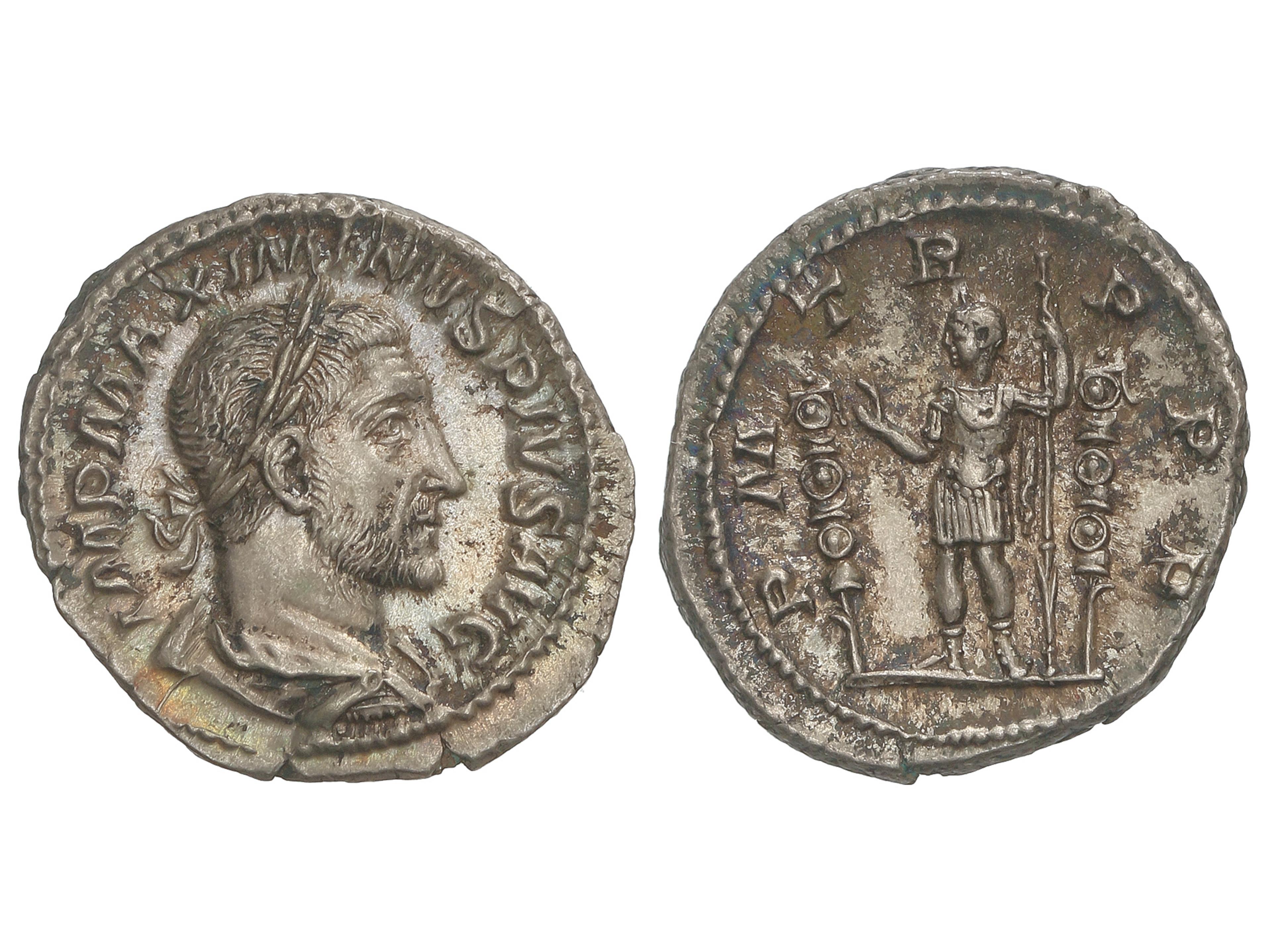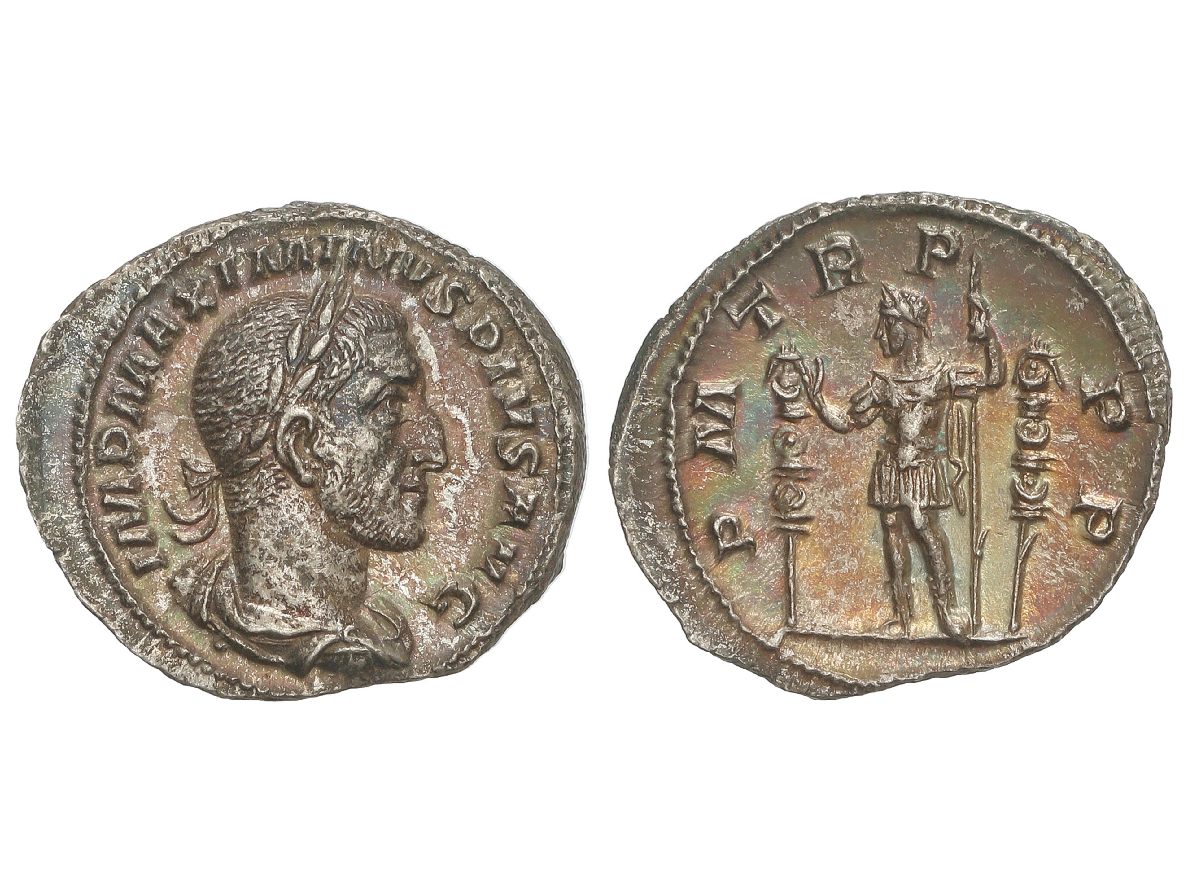 123 imageDenario. 235-238 d.C. ALEJANDRO SEVERO. Anv.: IMP. MAXIMINVS PIVS AVG. Busto laureado a derecha. Rev.: P. M. TR. P. P. P. Maximino en pie entre estandartes. 3,04 grs. AR. Bonita pátina irisada sobretodo en reverso. C-46; RIC-1; BMC-11. EBC/EBC+. (Image1)