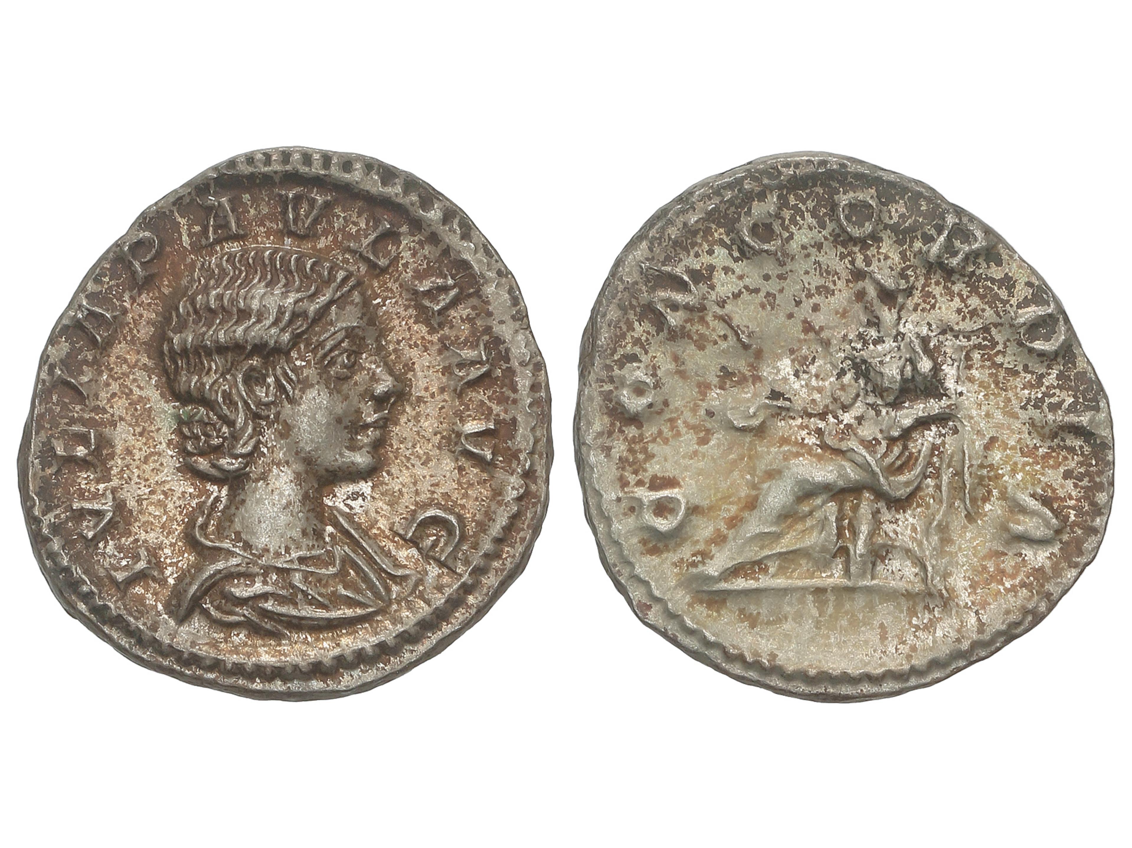 121 imageDenario. 219 d.C. JULIA PAULA. Anv.: IVLIA PAVLA AVG. Busto a derecha. Rev.: CONCORDIA. Concordia sentada a izquierda. 3,05 grs. AR. Pátina. C-6a; RIC-211; BMC-173. EBC-/MBC. (Image1)