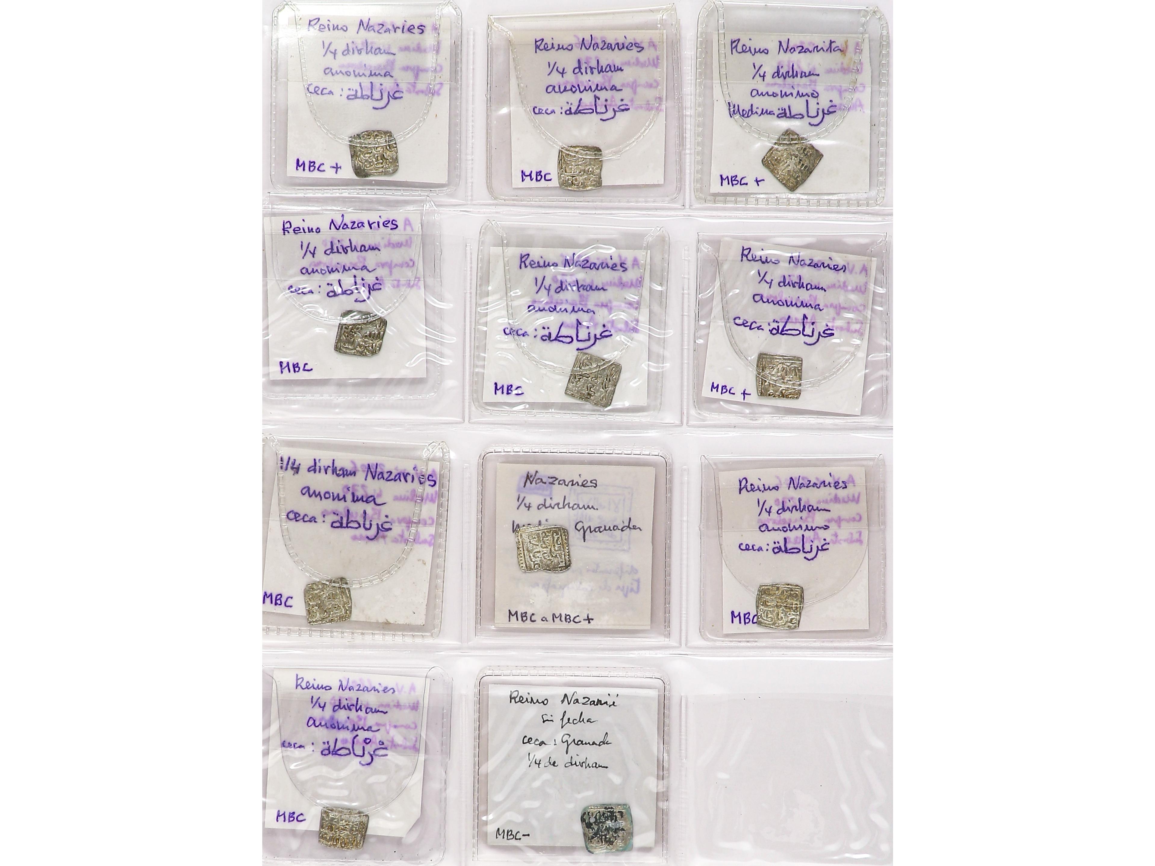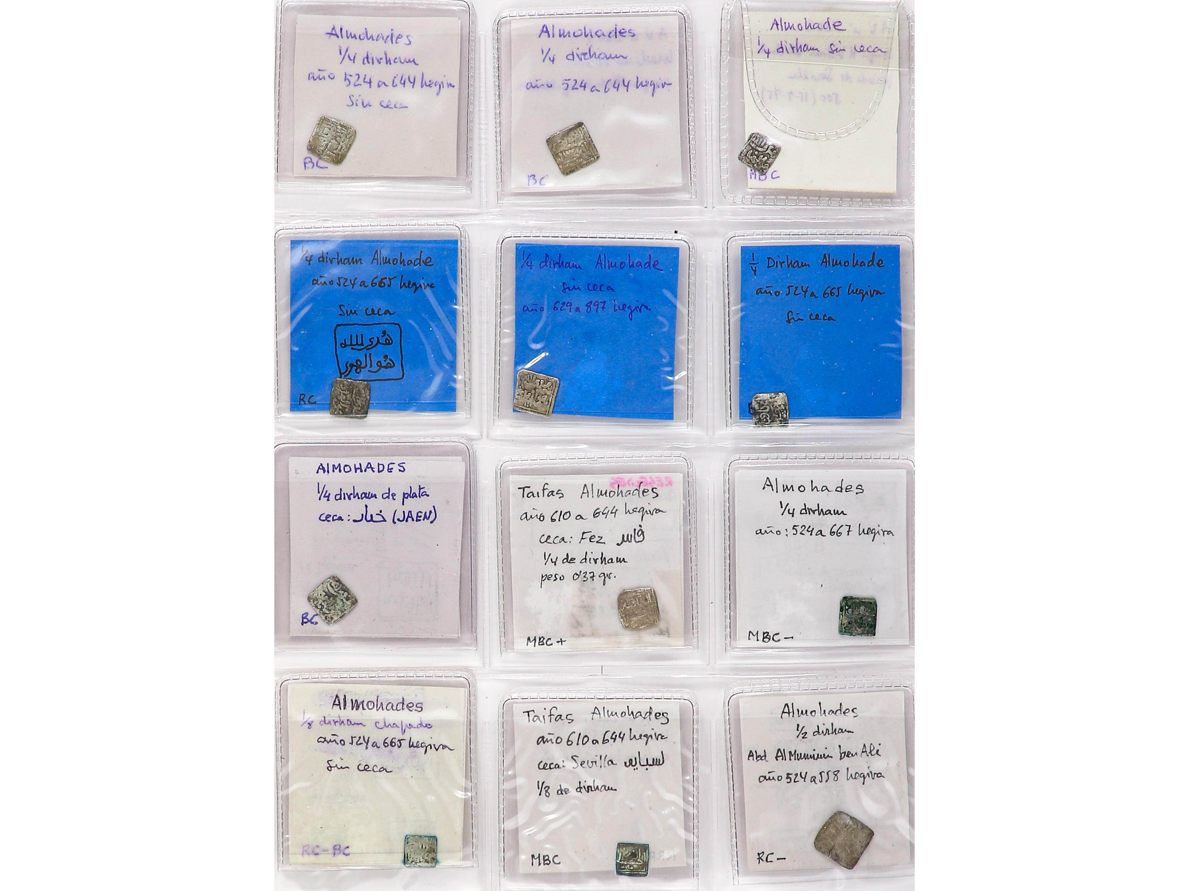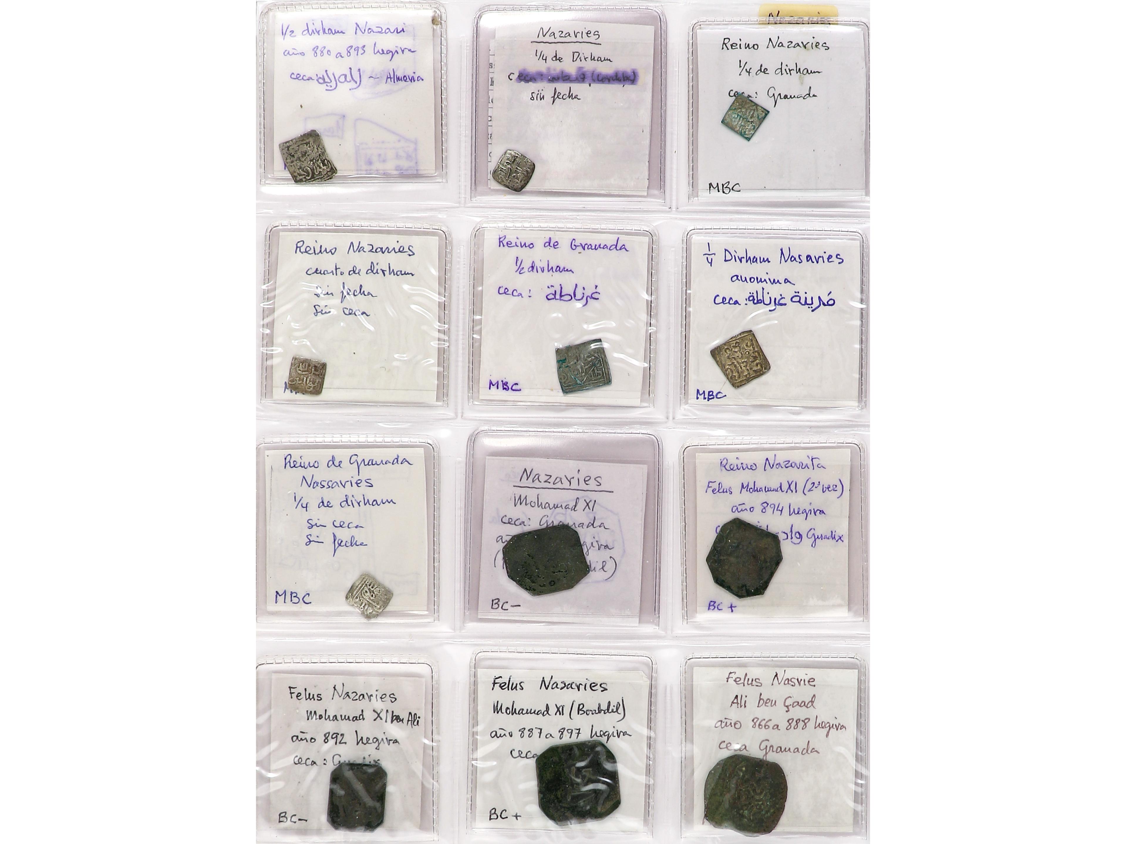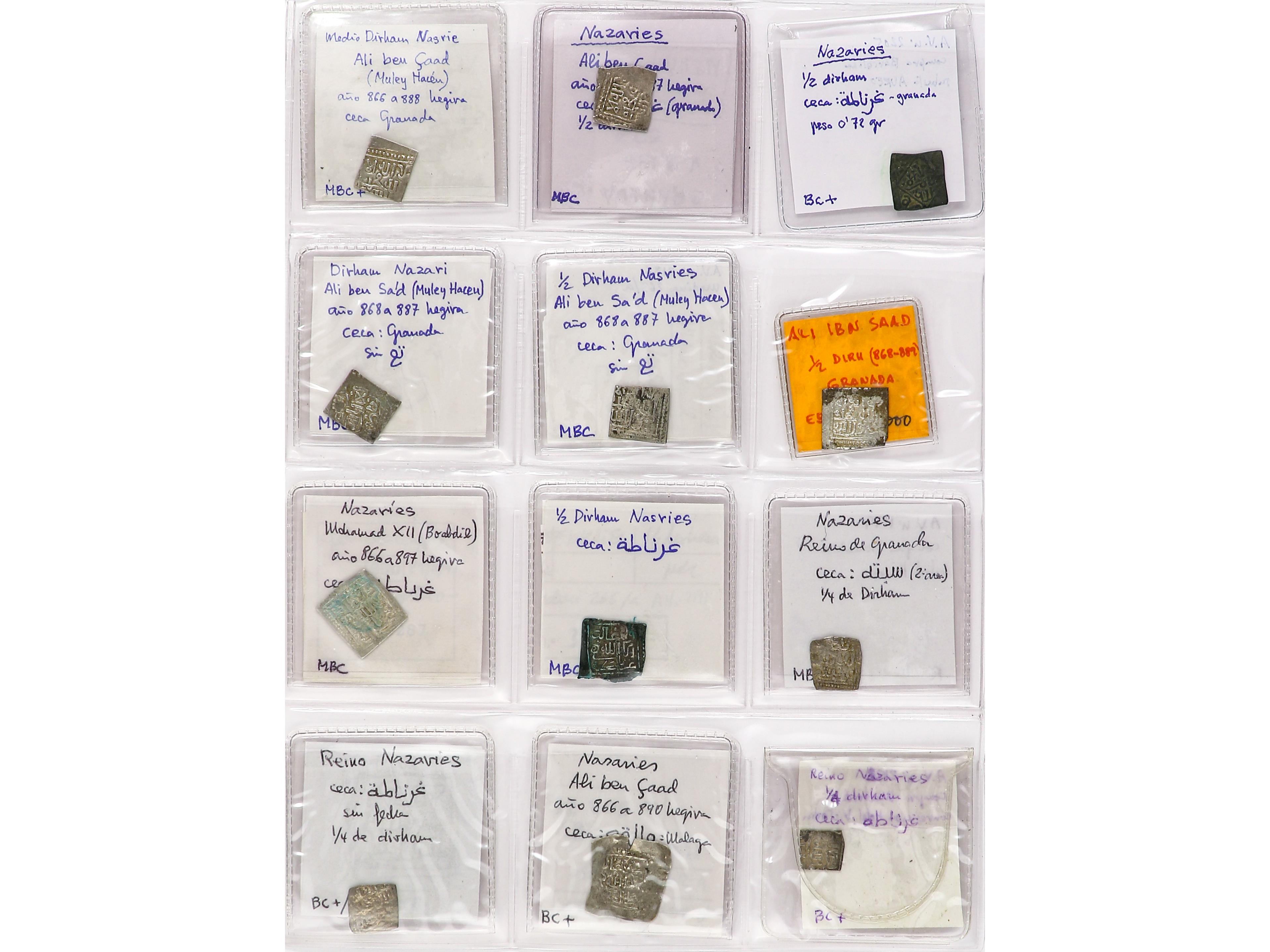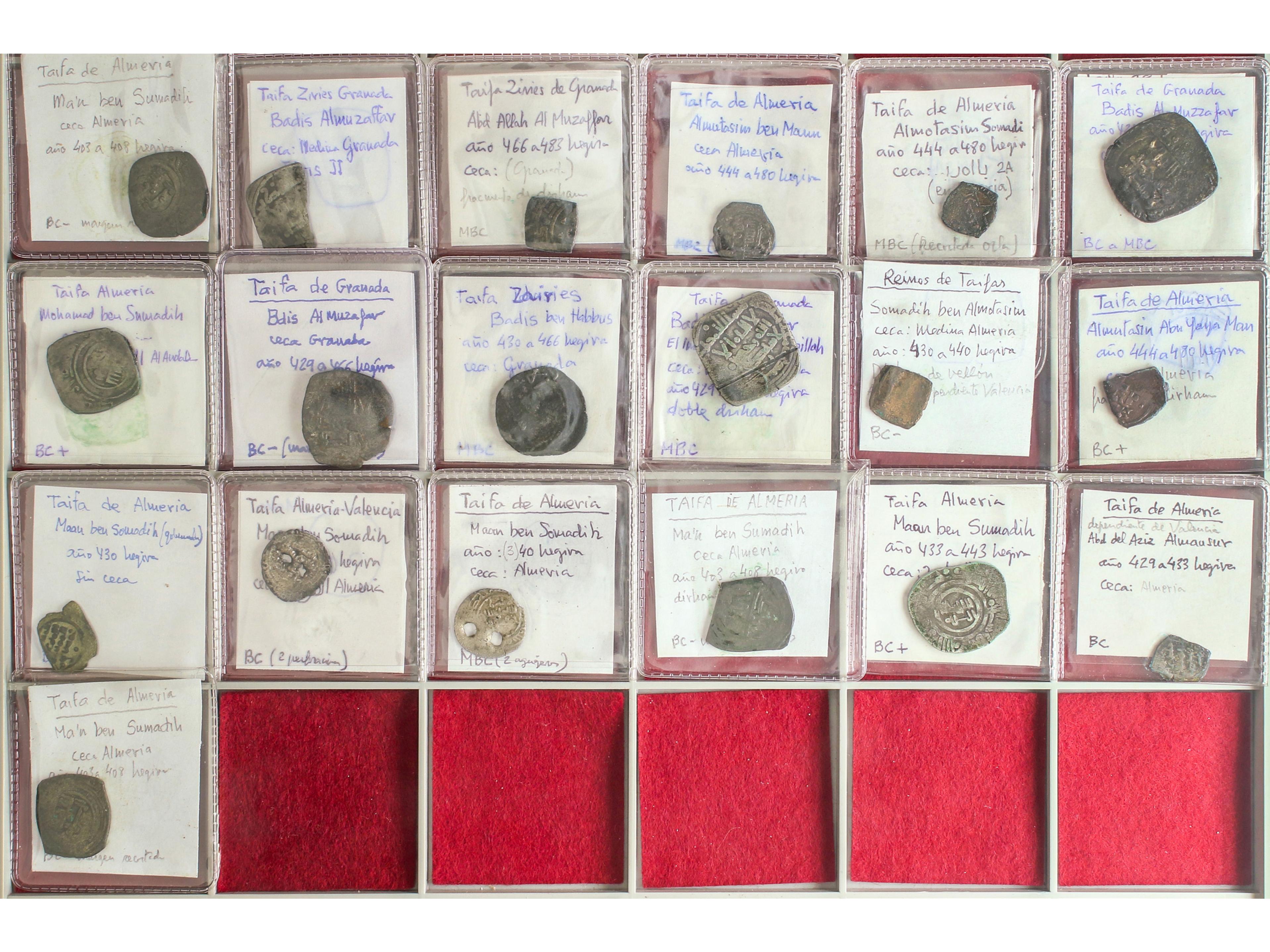 2422 imageLote 19 monedas. De diferentes reyes y en diferentes conservaciones de la Taifa de Almeria y de la Taifa de Sevilla. Incluye: (6) Dirhams y fracciones de Dirham de Granada; (13) Dirhams y fracciones de Dirham de Almeria, dos con perforaciones. Todas con etiquetas del coleccionista. Lote muy interesante. IMPRESCINDIBLE EXAMINAR. BC-/MBC-. (Image1)