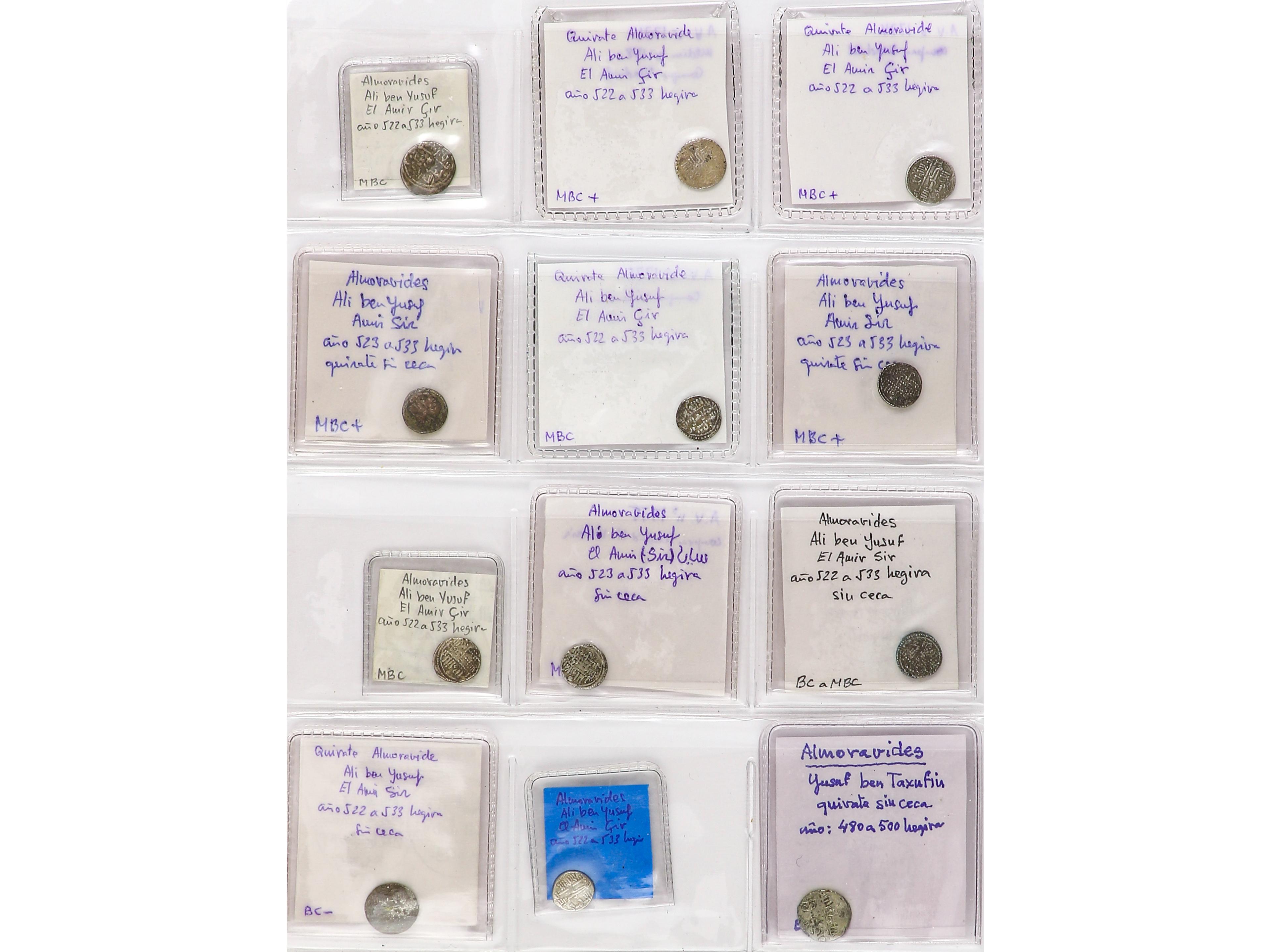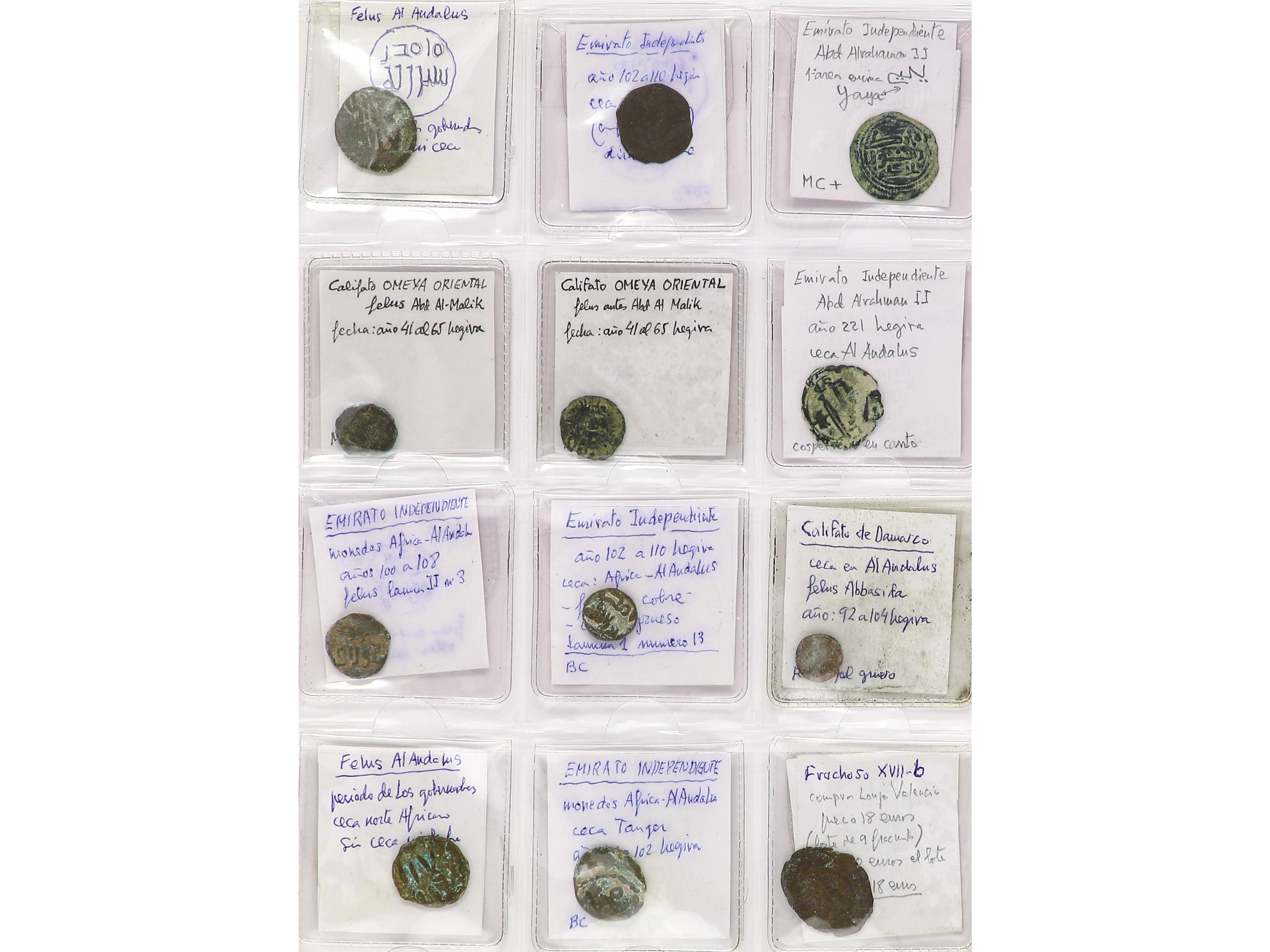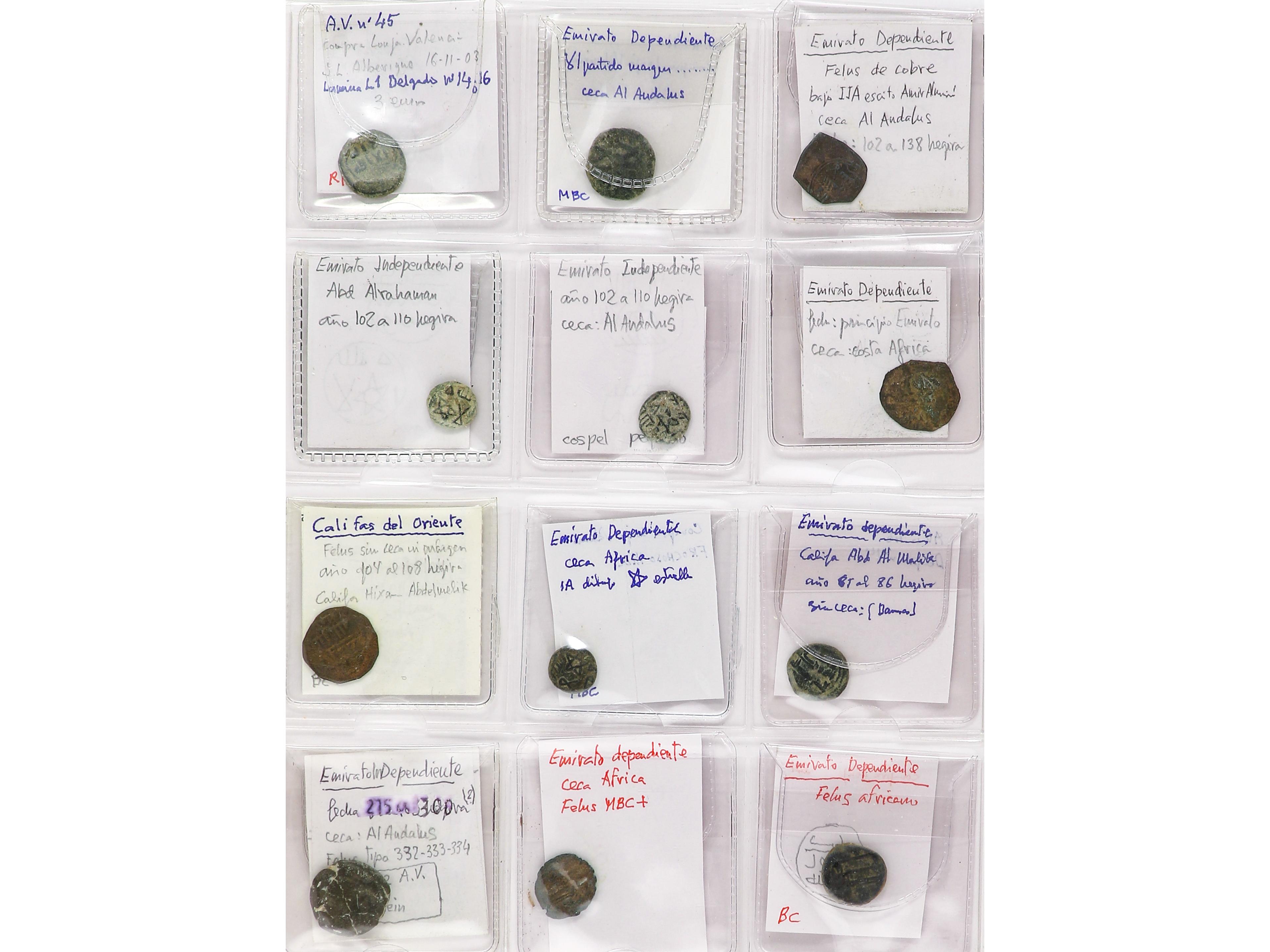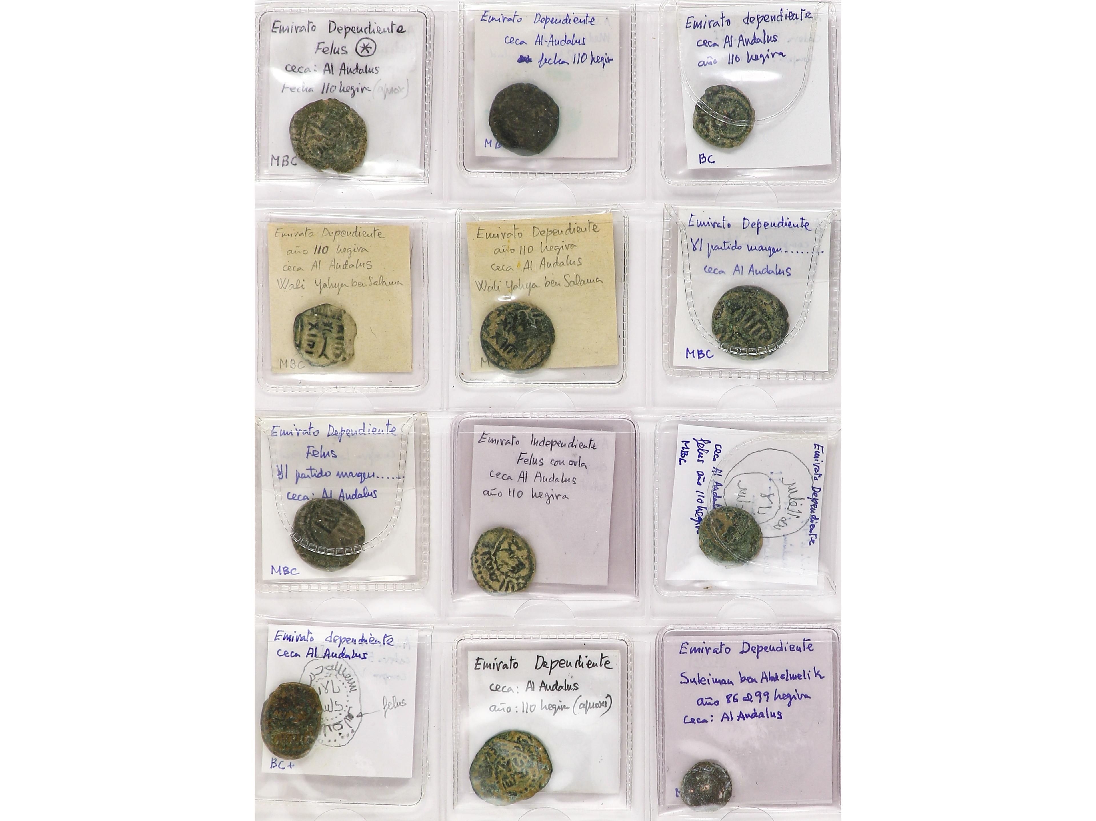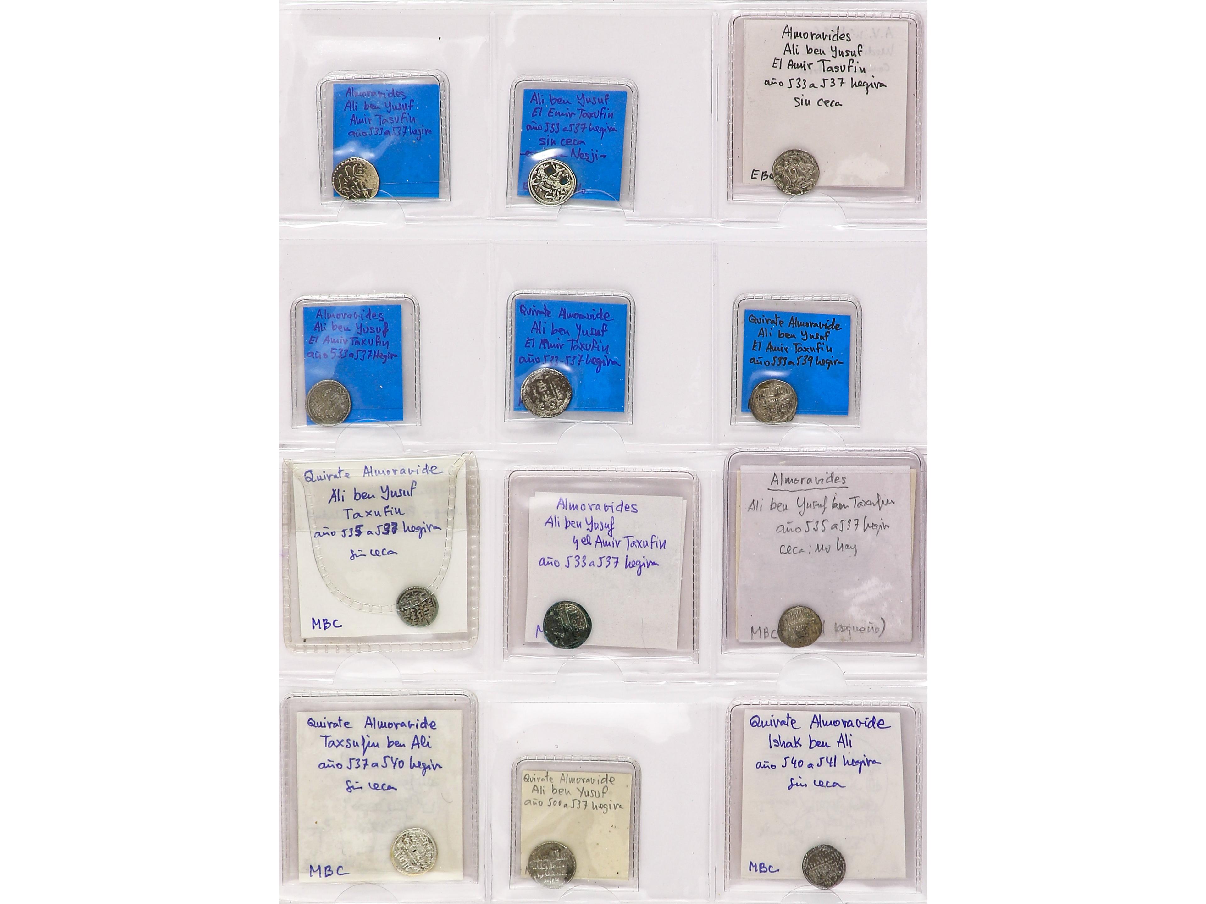 2422 imageLote 19 monedas. De diferentes reyes y en diferentes conservaciones de la Taifa de Almeria y de la Taifa de Sevilla. Incluye: (6) Dirhams y fracciones de Dirham de Granada; (13) Dirhams y fracciones de Dirham de Almeria, dos con perforaciones. Todas con etiquetas del coleccionista. Lote muy interesante. IMPRESCINDIBLE EXAMINAR. BC-/MBC-. (Image1)