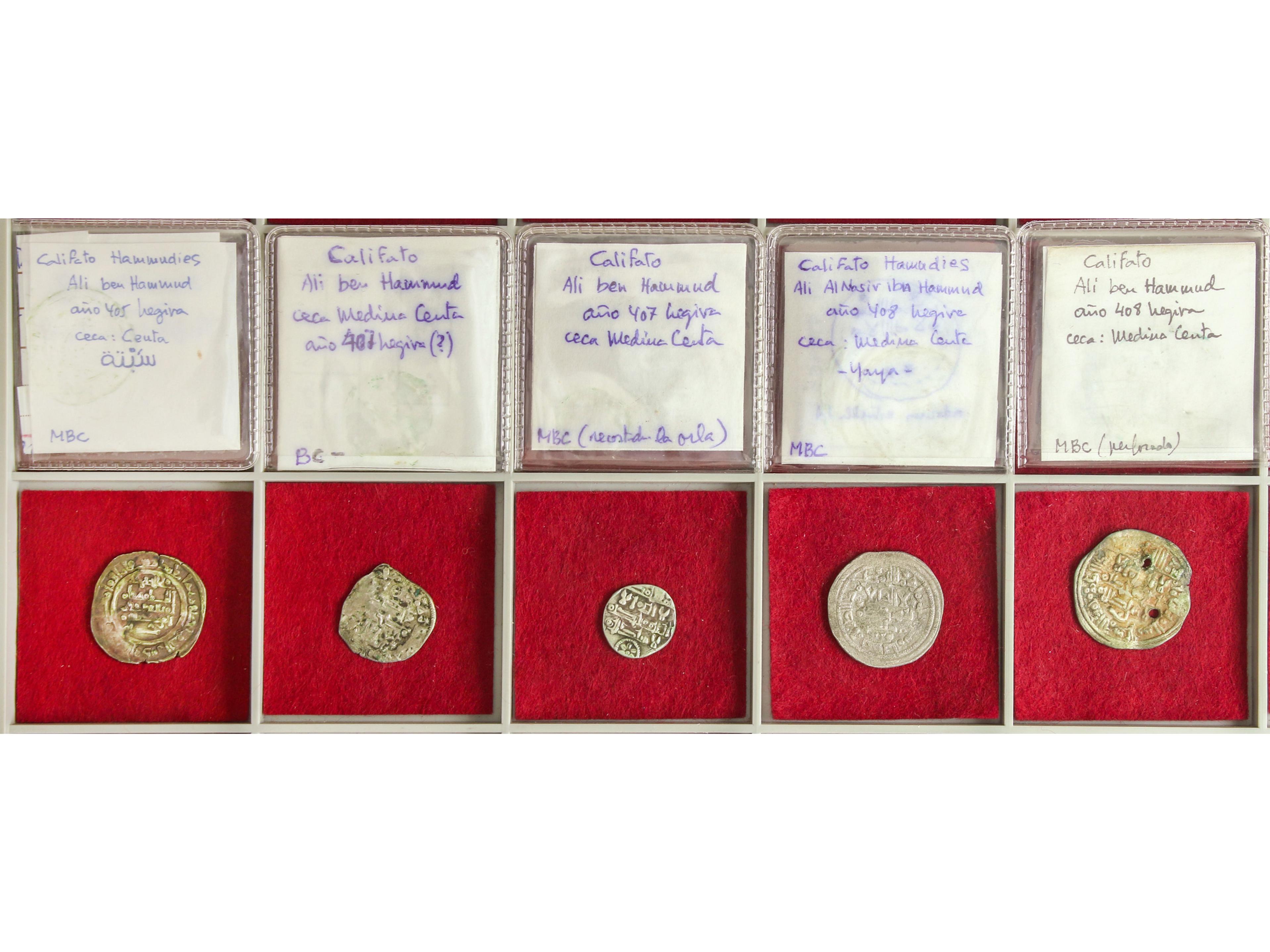 2415 imageLote 5 monedas Dirham. ALÍ BEN HAMMUD. MEDINA CEUTA. AR. Algún año repetido. A EXAMINAR. BC a MBC. (Image1) (Image2)