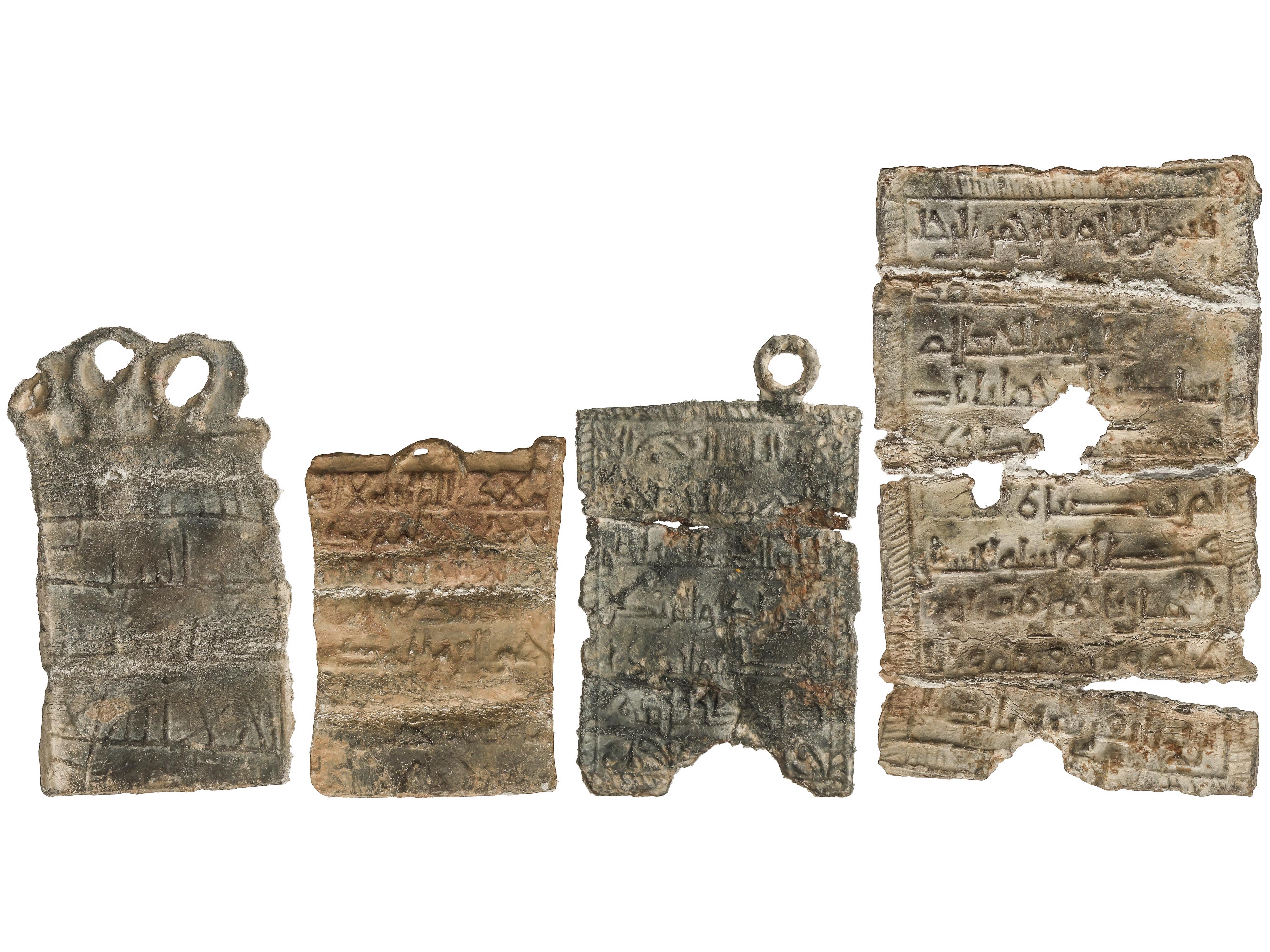 2433 imageLote de 4 amuletos de plomo de al-Andalus en forma de plaqueta rectangular. Pb. Señales de haber estado doblados, uno de ello con roturas. Todos con leyendas visibles. A EXAMINAR. BC+/MBC-. (Image1)