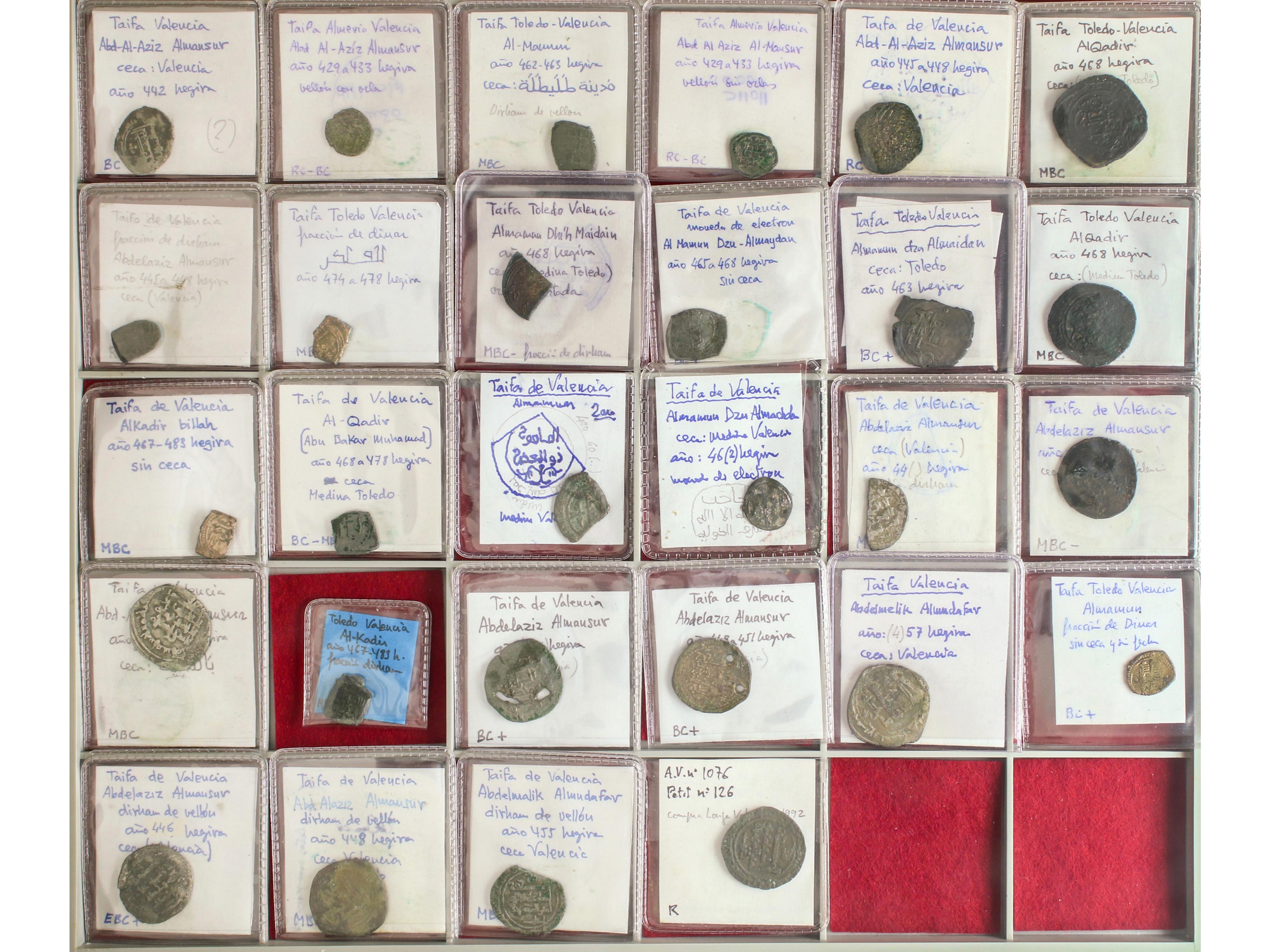 2426 imageLote 28 monedas. Diferentes reyes de la Taifa de Valencia. Incluye: (3) fracciones de Dinar en electrón de AL-QADIR y AL-MAMUN, (11) Dirhams de vellón en diferentes conservaciones, entre ellos dos con perforaciones, (14) fracciones de Dirhams de vellón. Todas con etiquetas del coleccionista. Lote muy interesante. IMPRESCINDIBLE EXAMINAR. BC/MBC-. (Image1)