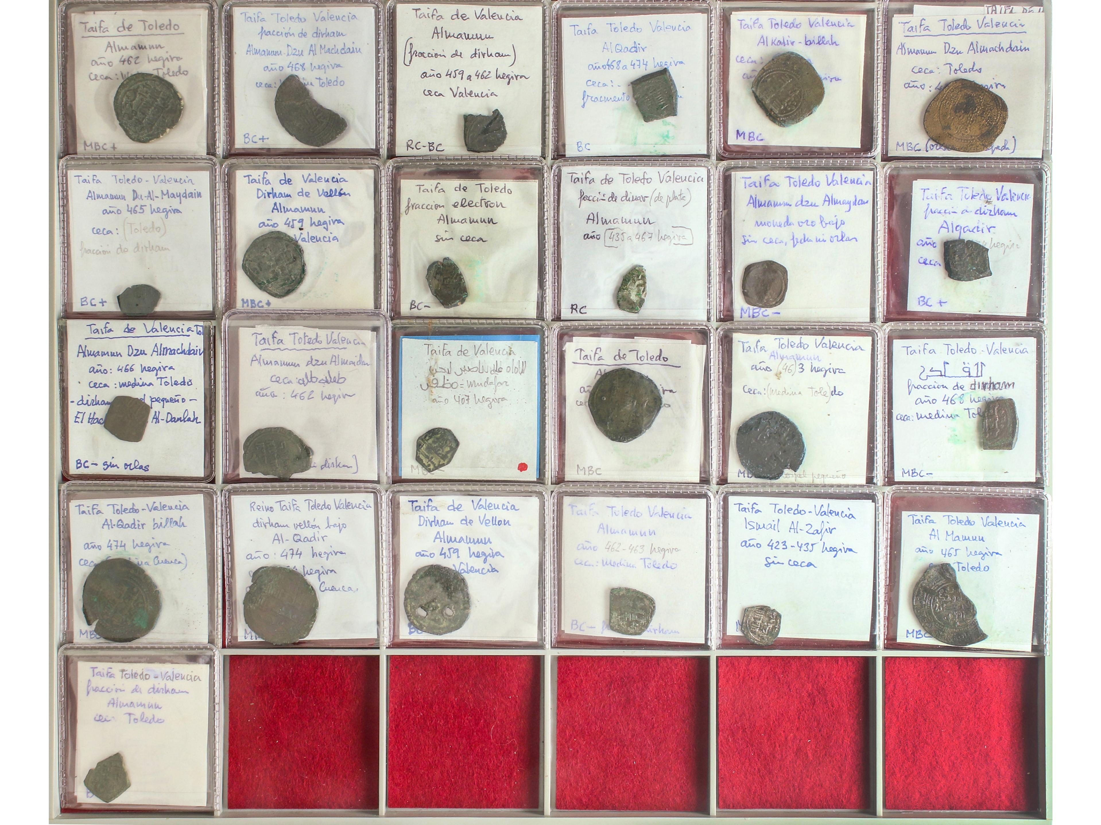 2424 imageLote 25 monedas. Taifa de Toledo y Valencia, en diferentes conservaciones. Incluye: (6) Dirhams de vellón, uno con perforaciones; (19) fracciones de Dirhams de vellón. Todas con etiquetas del coleccionista. Lote muy interesante. IMPRESCINDIBLE EXAMINAR. BC/MBC-. (Image1)