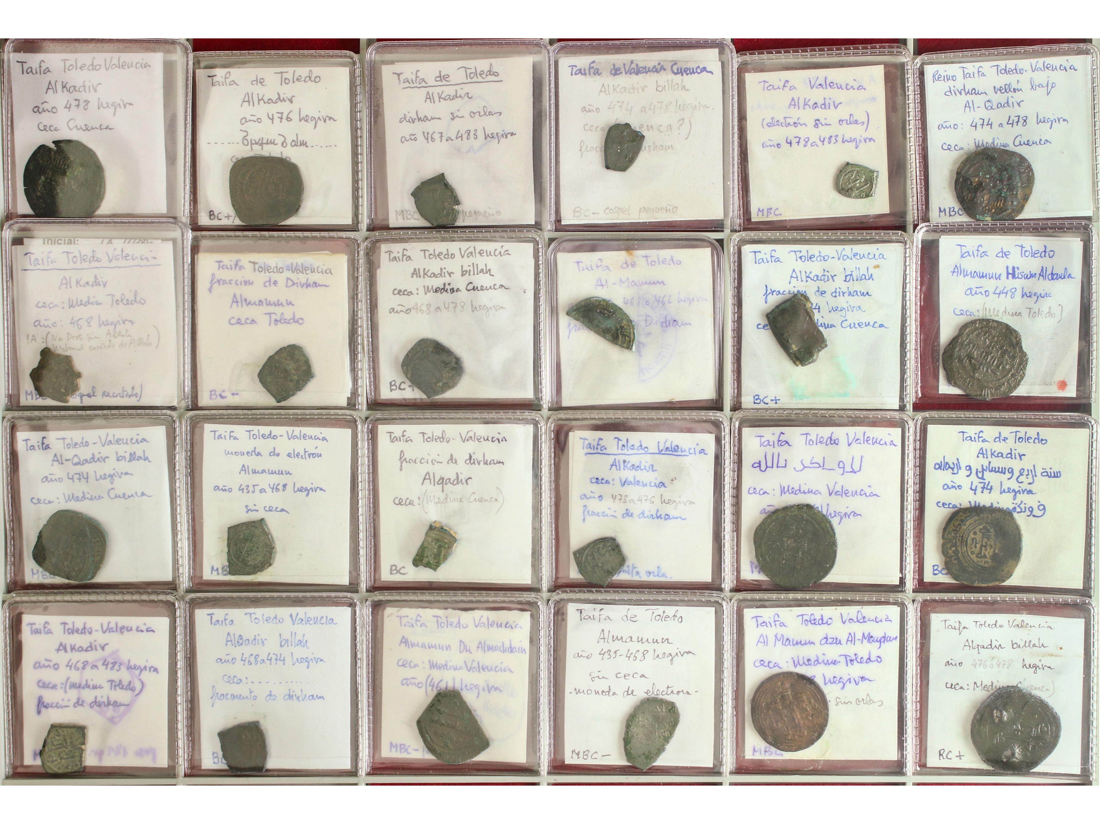 2425 imageLote 24 monedas. Taifa de Toledo y Valencia, en diferentes conservaciones. Incluye: (9) Dirhams de vellón, uno con perforaciones; (15) fracciones de Dirhams de vellón. Todas con etiquetas del coleccionista. Lote muy interesante. IMPRESCINDIBLE EXAMINAR. BC/MBC-. (Image1)