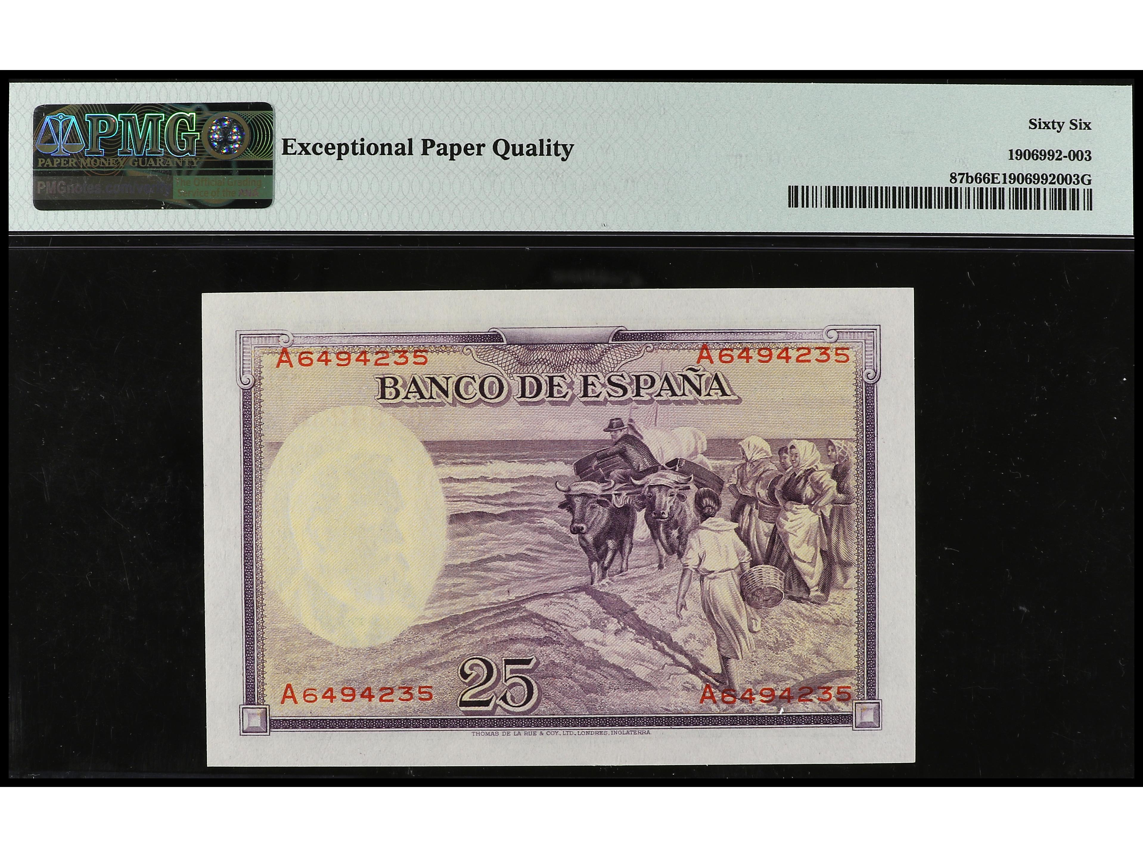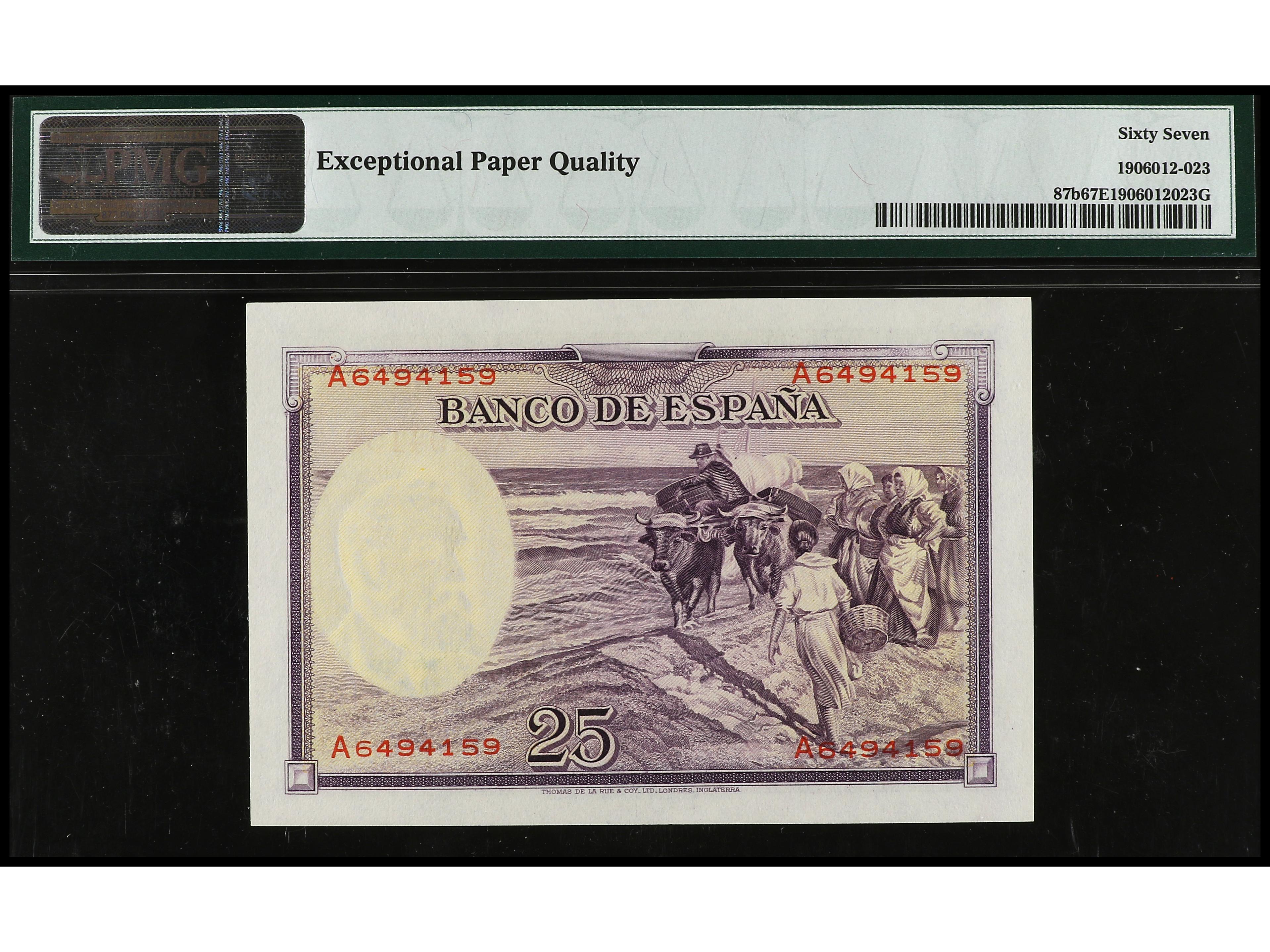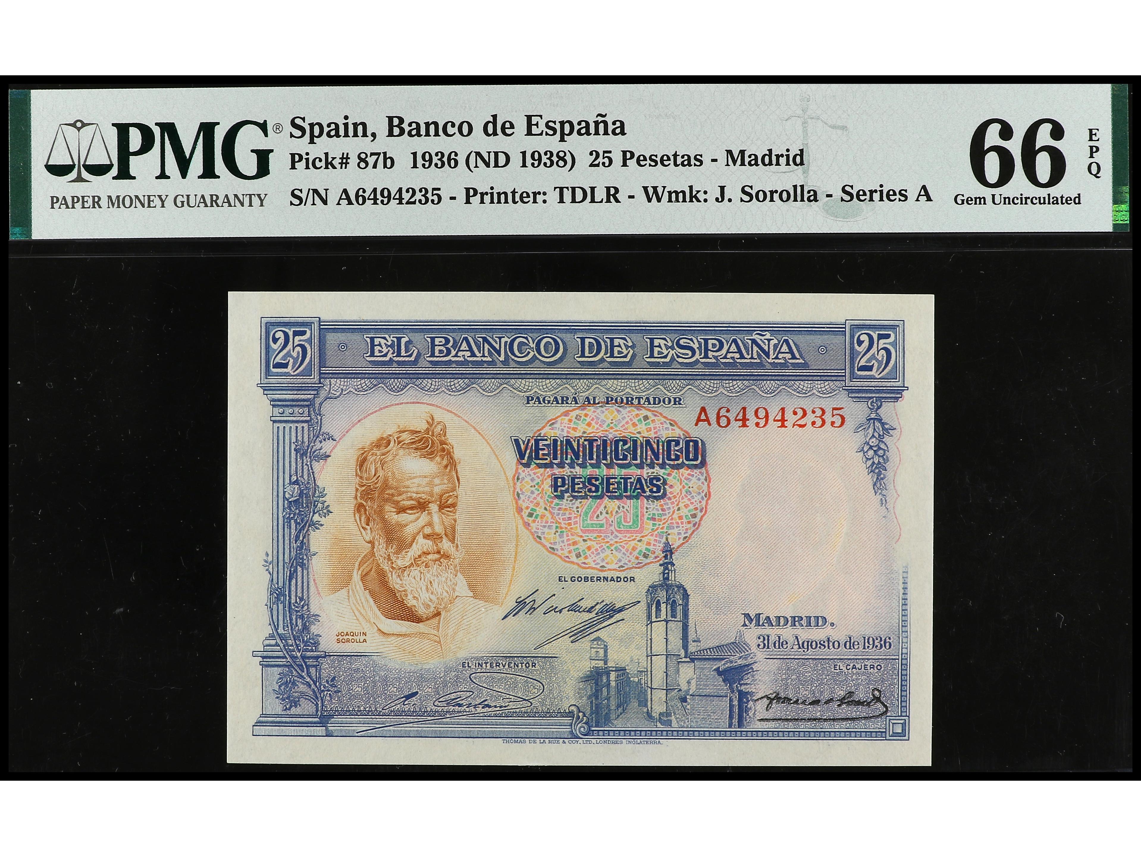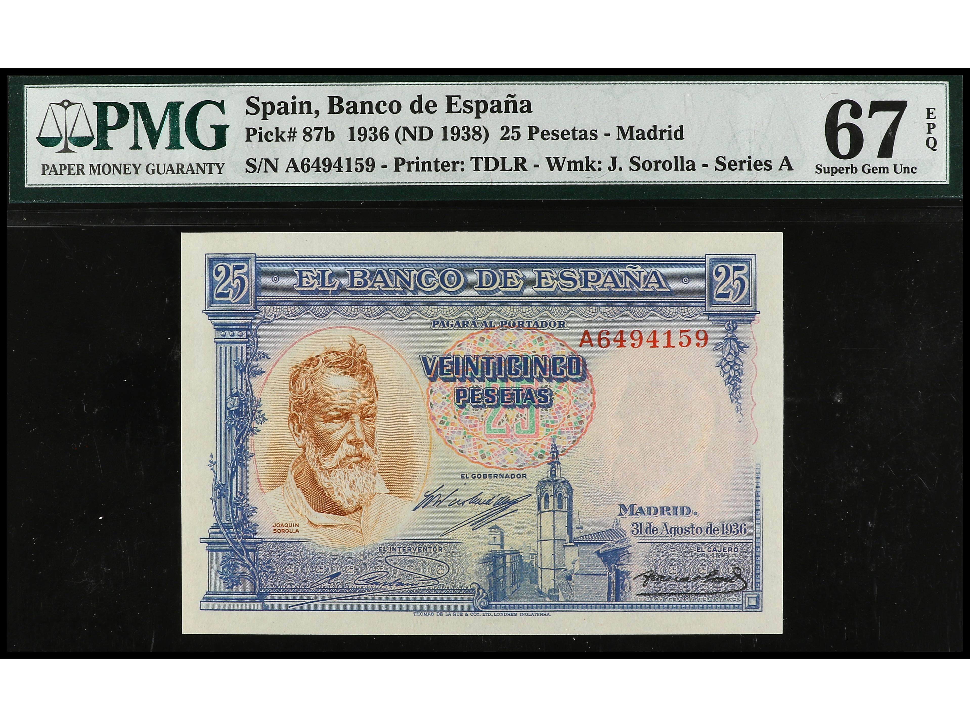 25 Pesetas. 31 agosto 1936. Sorolla. Serie A. Precintado y garantizado por PMG 67 EPQ Superb Gem UNC (1906012-023). Ed-367a. SC.