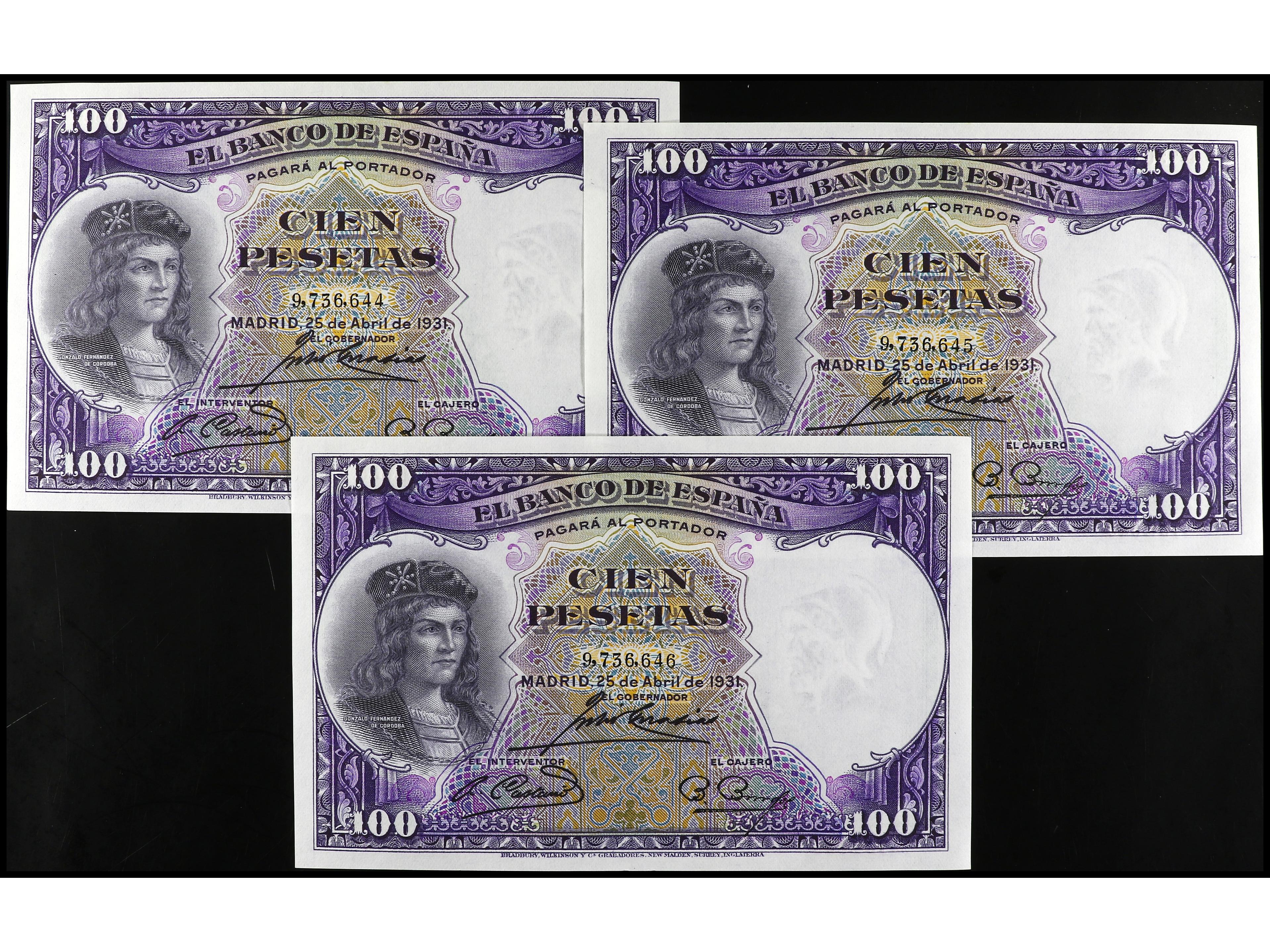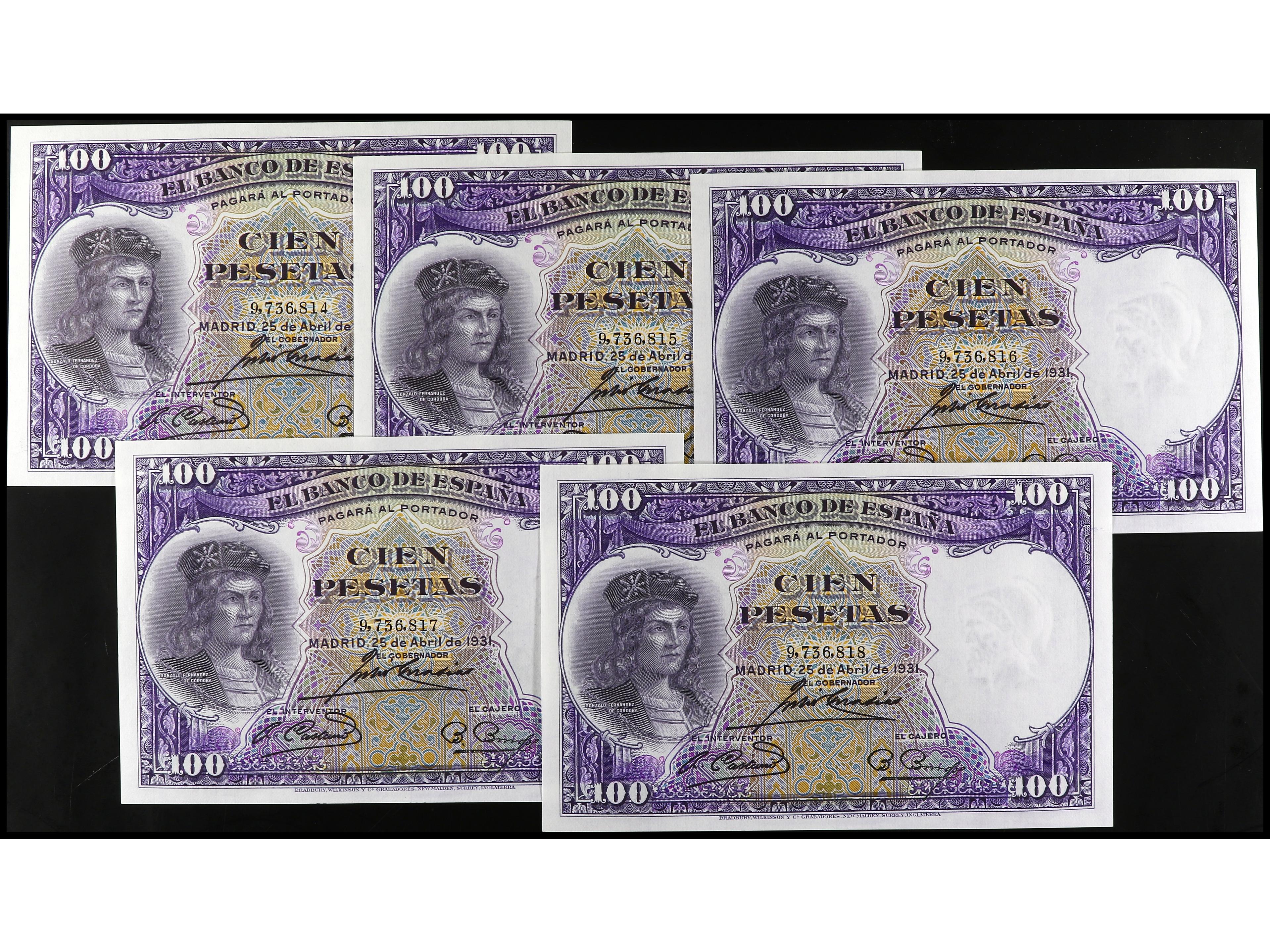 Lote 5 billetes 100 Pesetas. 25 Abril 1931. Fernández de Córdoba. Todos correlativos. Ed-360. SC. (Image1)