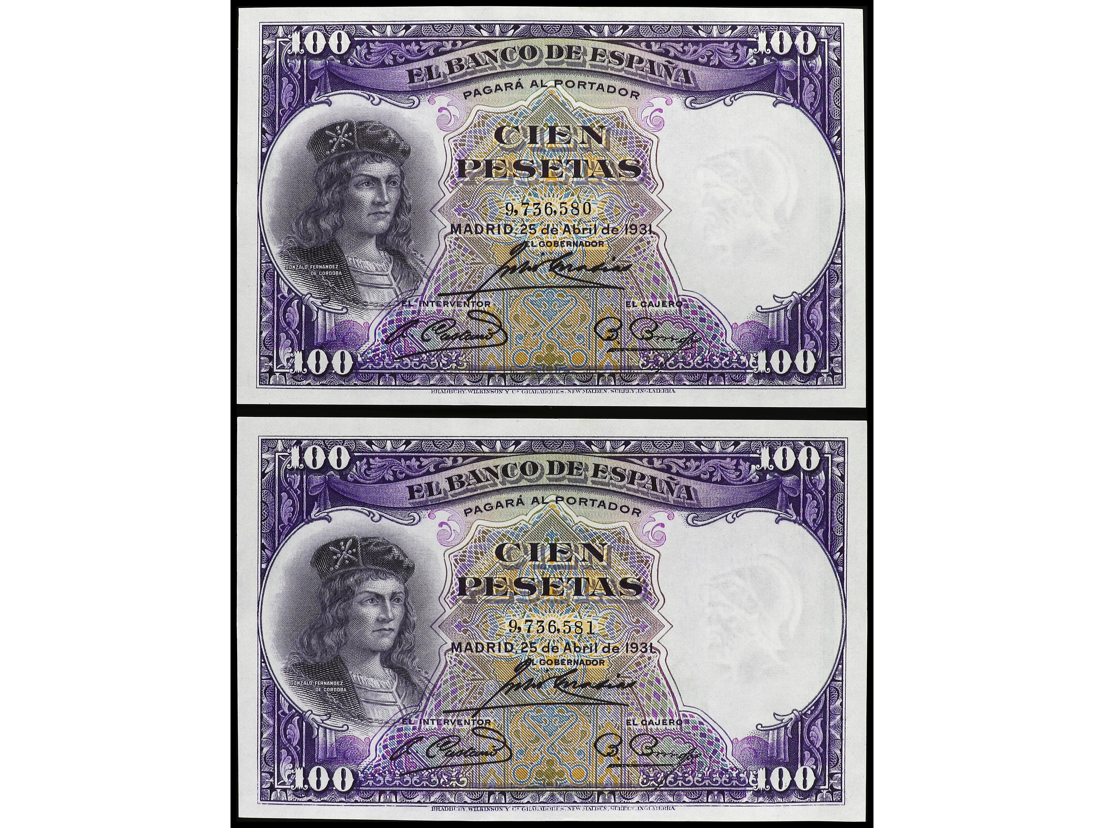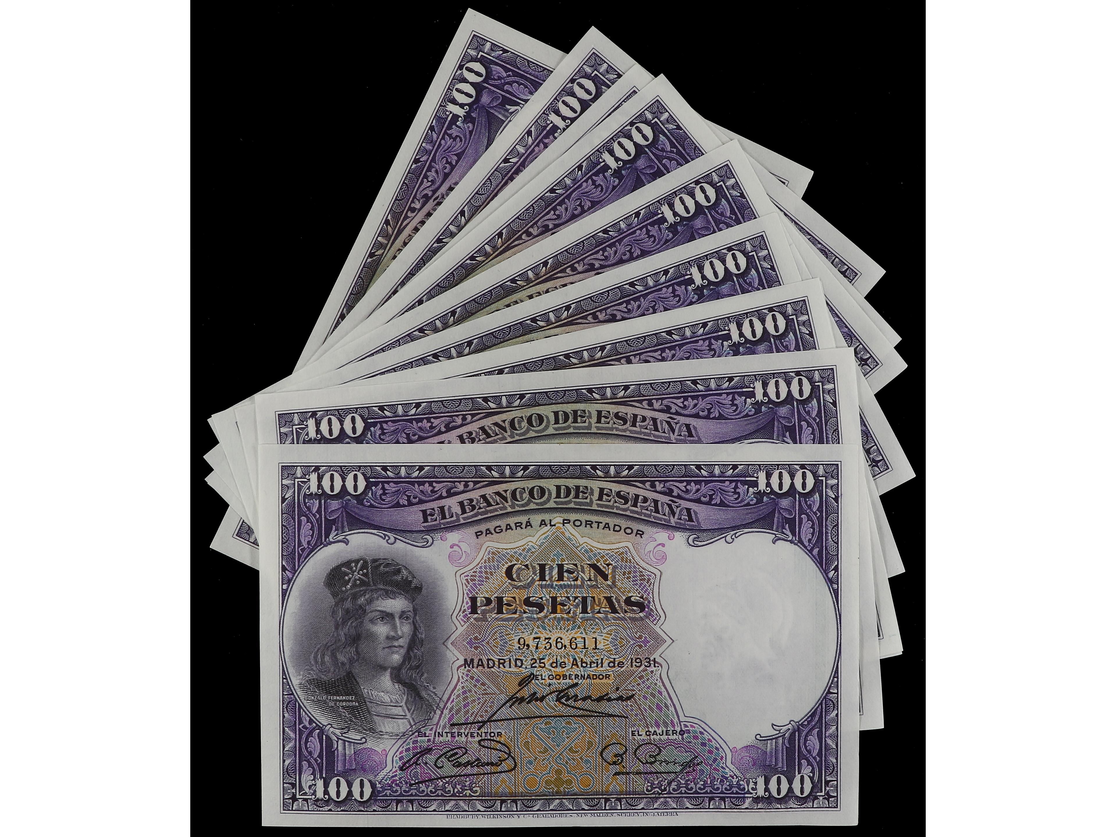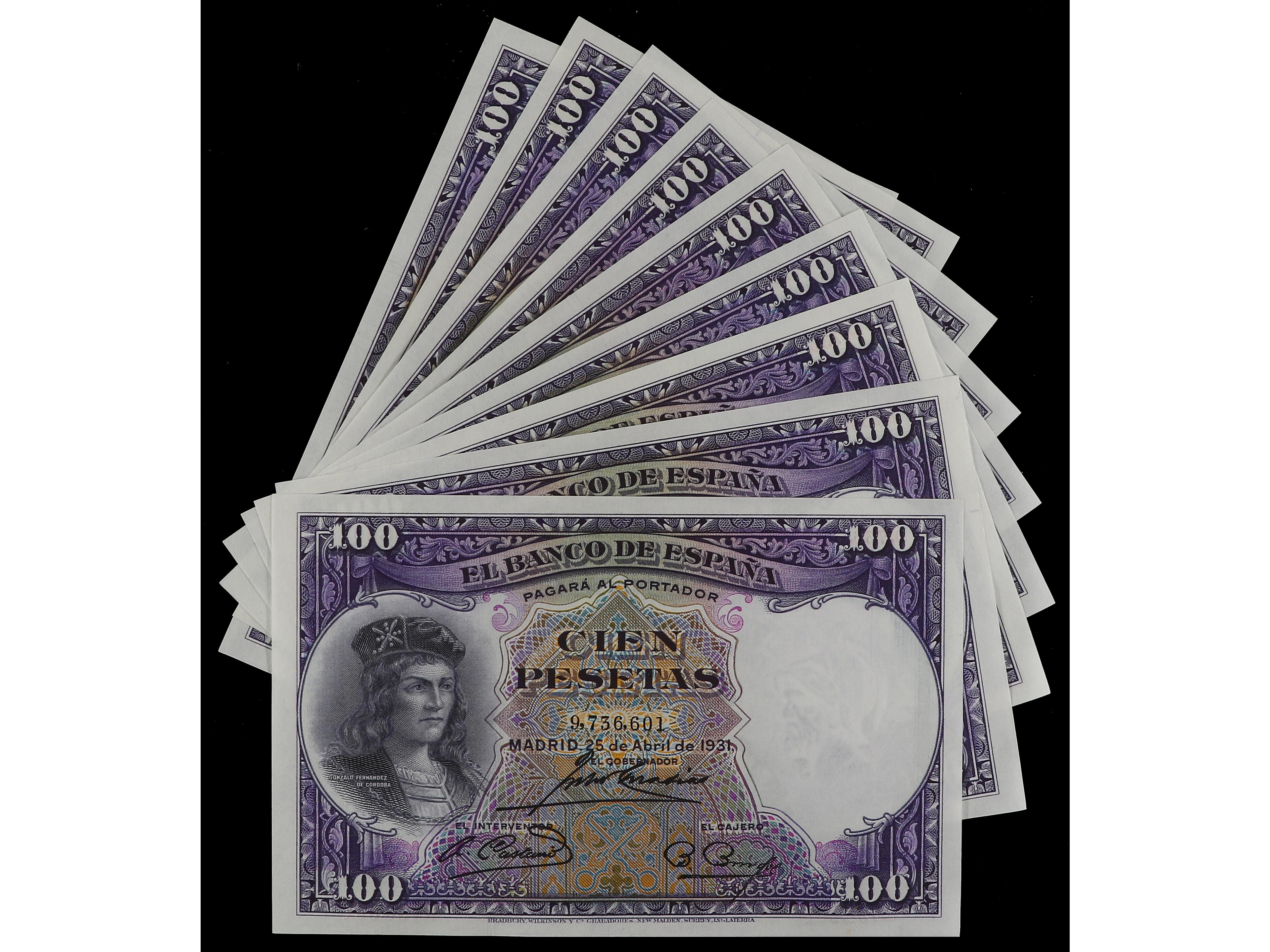Lote 10 billetes 100 Pesetas. 25 Abril 1931. Fernández de Córdoba. Numeraciones correlativas. (Leves ondulaciones). Ed-360. SC.