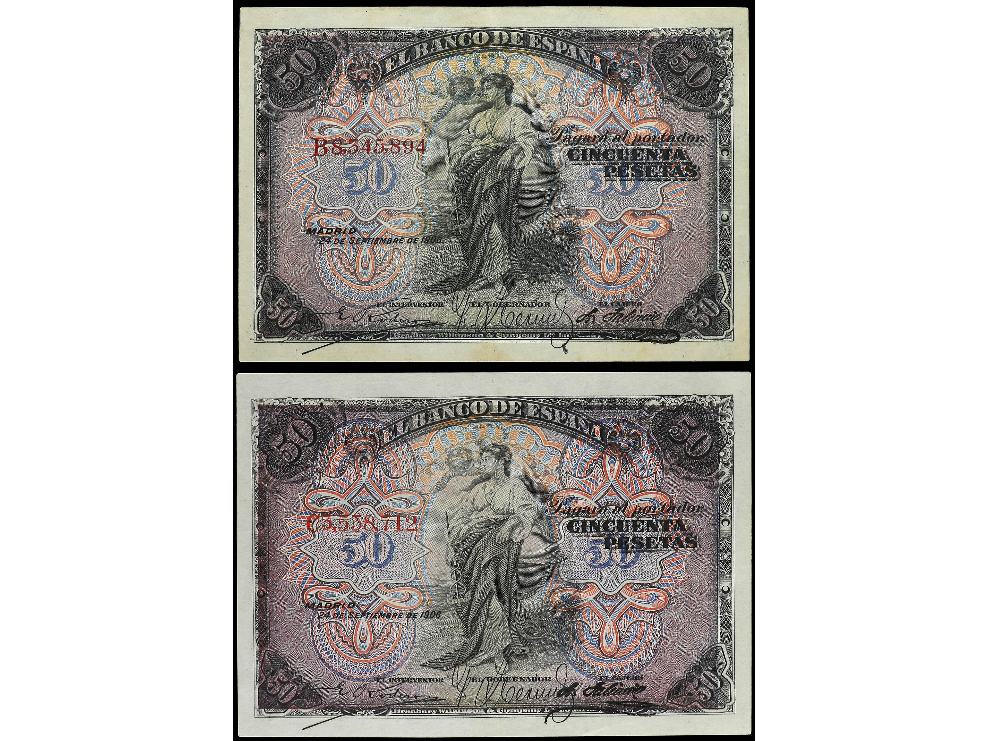Lote 2 billetes 50 Pesetas. 24 Septiembre 1906. Series B y C. (Uno con leves reparaciones). Ed-315a. MBC+. (Image1) (Image2)