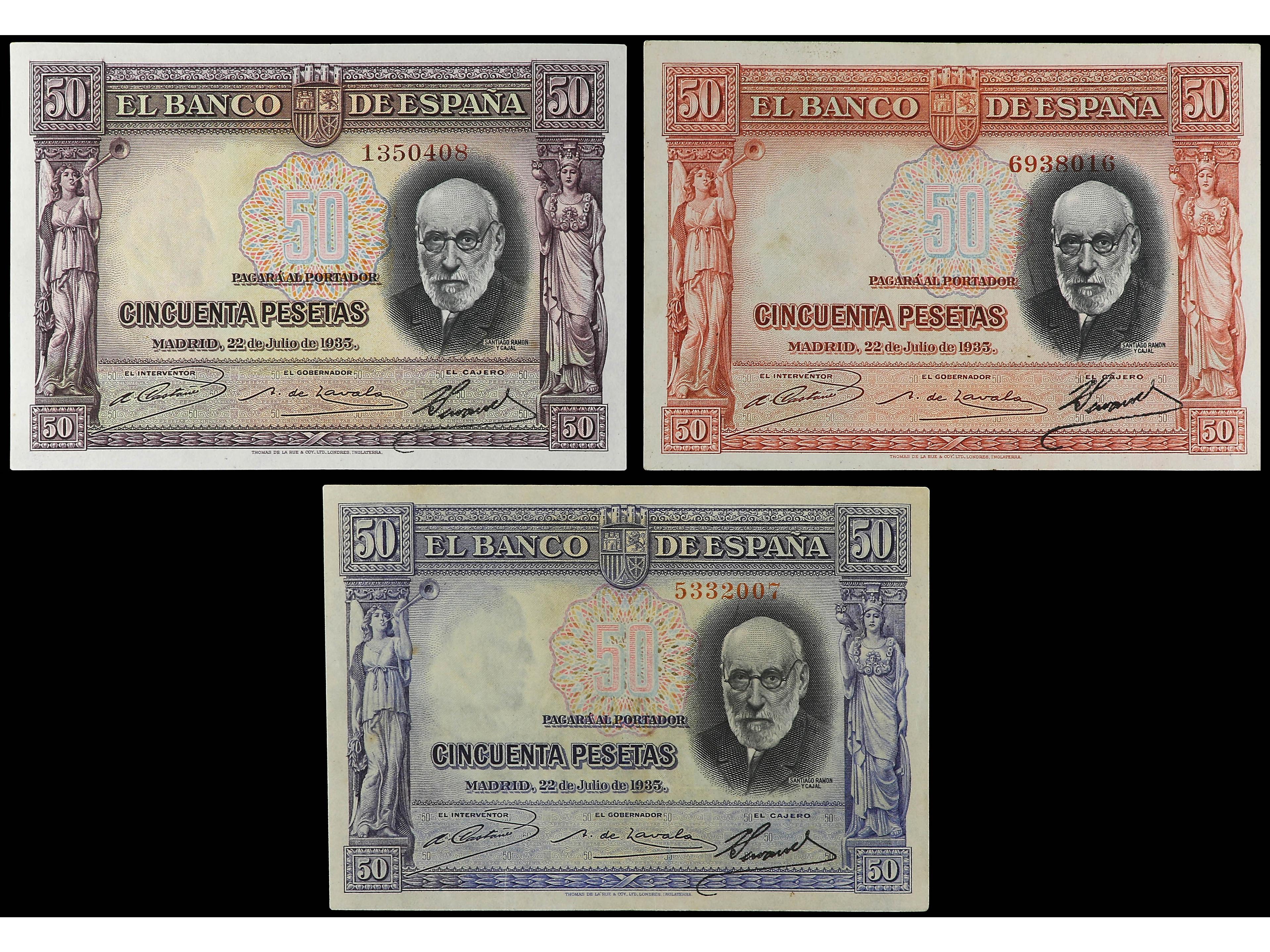 Lote 3 billetes 50 Pesetas. 22 Julio 1935. Ramón y Cajal. Sin Serie. Dos con color alterado químicamente. Ed-366. MBC+ a SC-.