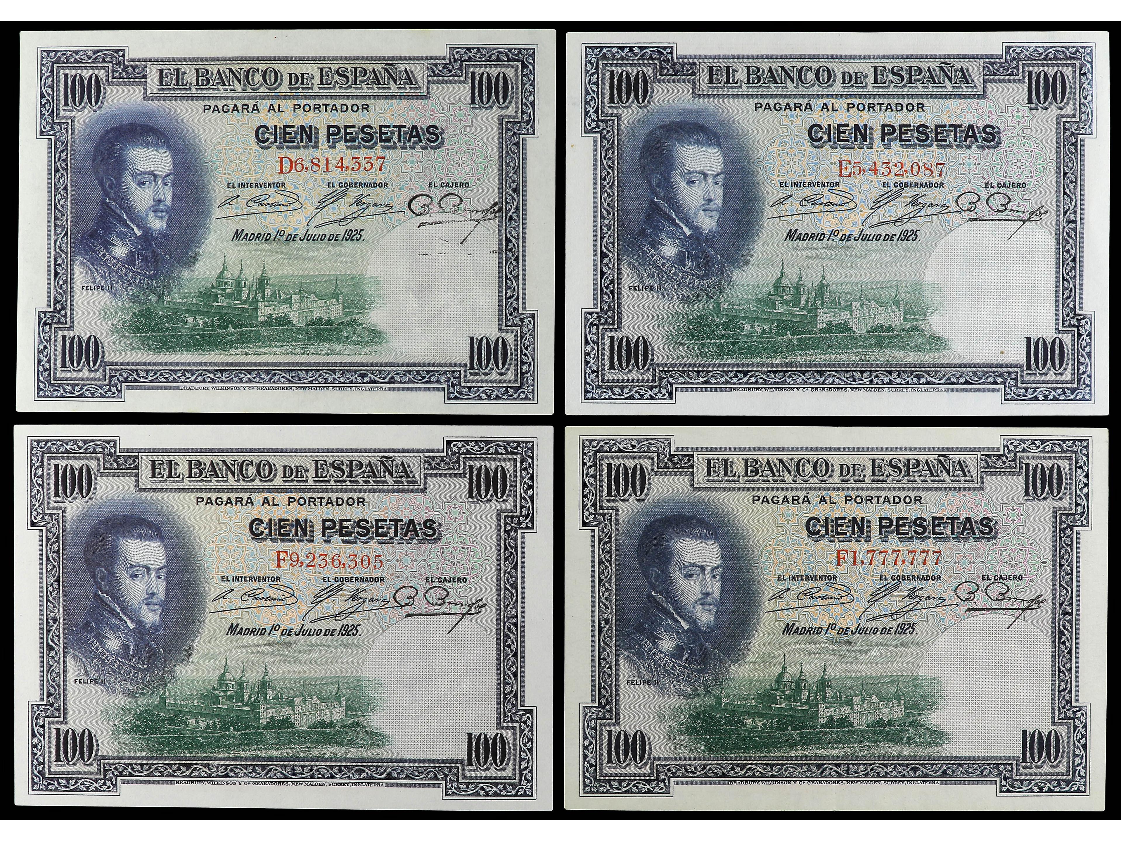 Lote 4 billetes 100 Pesetas. 1 Julio 1925. Felipe II. Series D, E y F (2). Ed-350. EBC a SC-. (Image1)