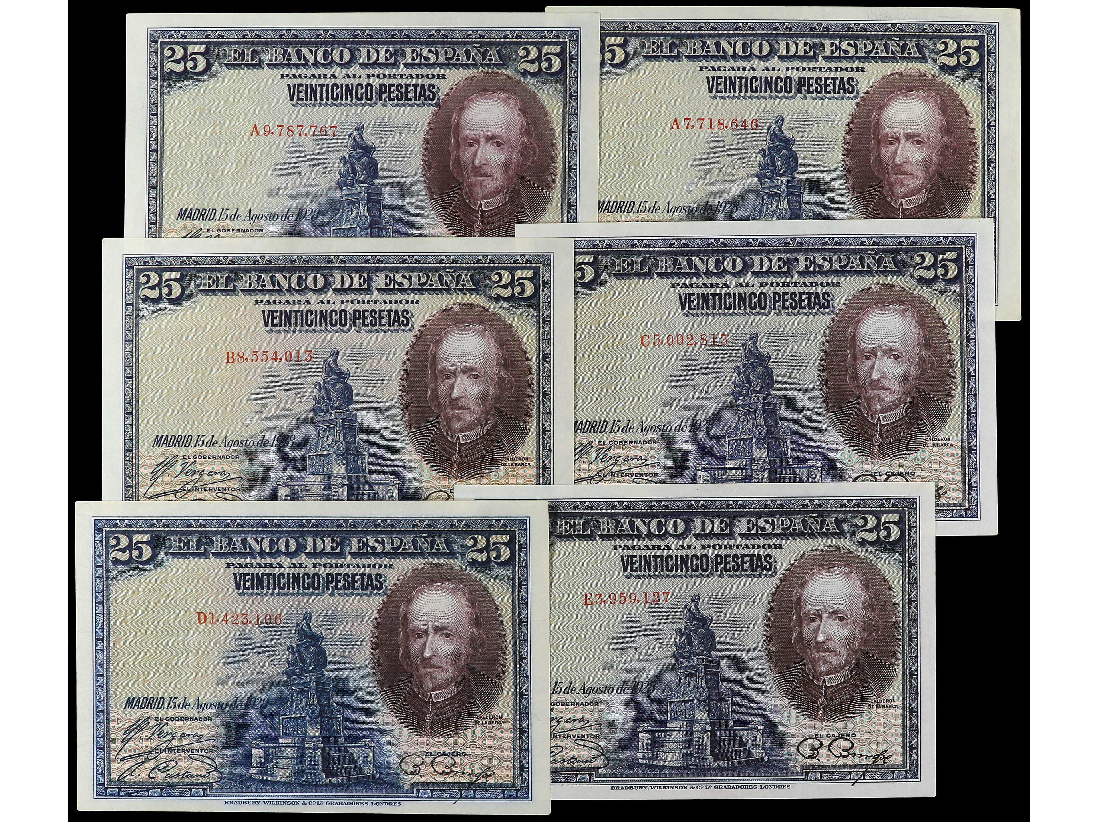 Lote 6 billetes 25 Pesetas. 15 Agosto 1928. Calderón de la Barca. Serie A (2), B, C, D y E. Ed-328, 353. EBC a SC-. (Image1)