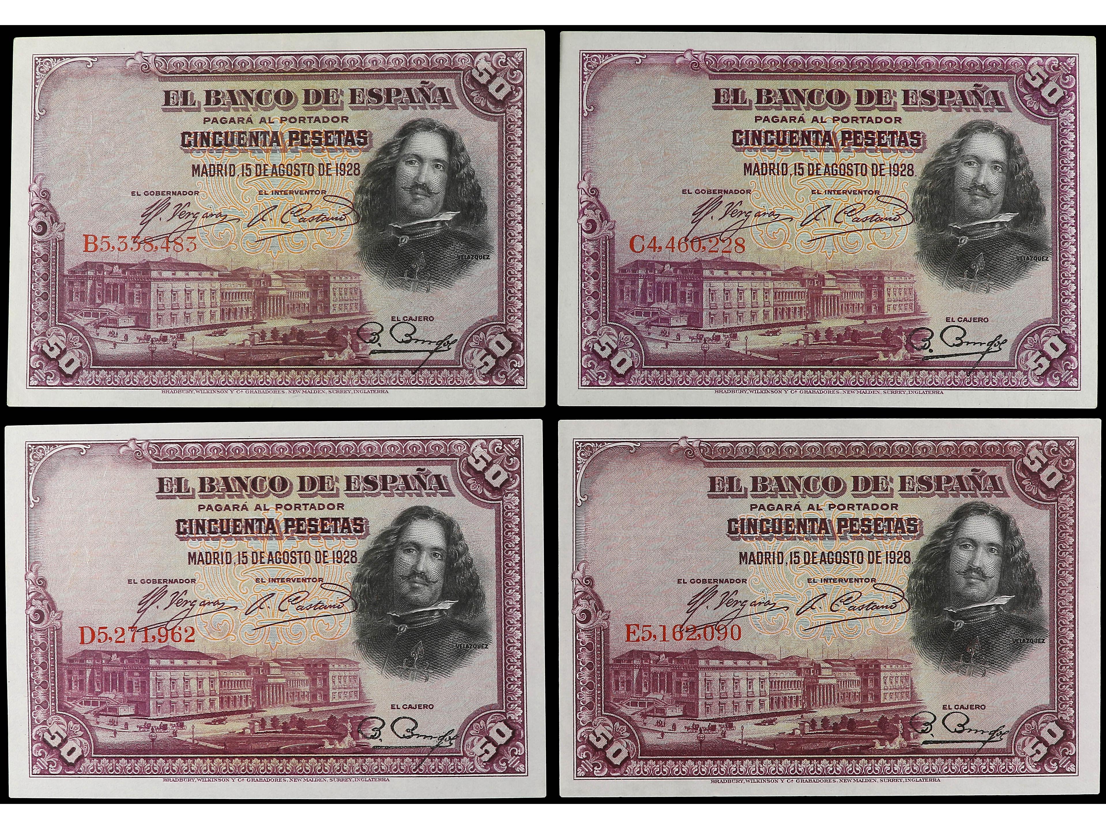 Lote 4 billetes 50 Pesetas. 15 Agosto 1928. Velázquez. Series B, C, D, E. Ed-354. EBC a SC-. (Image1)