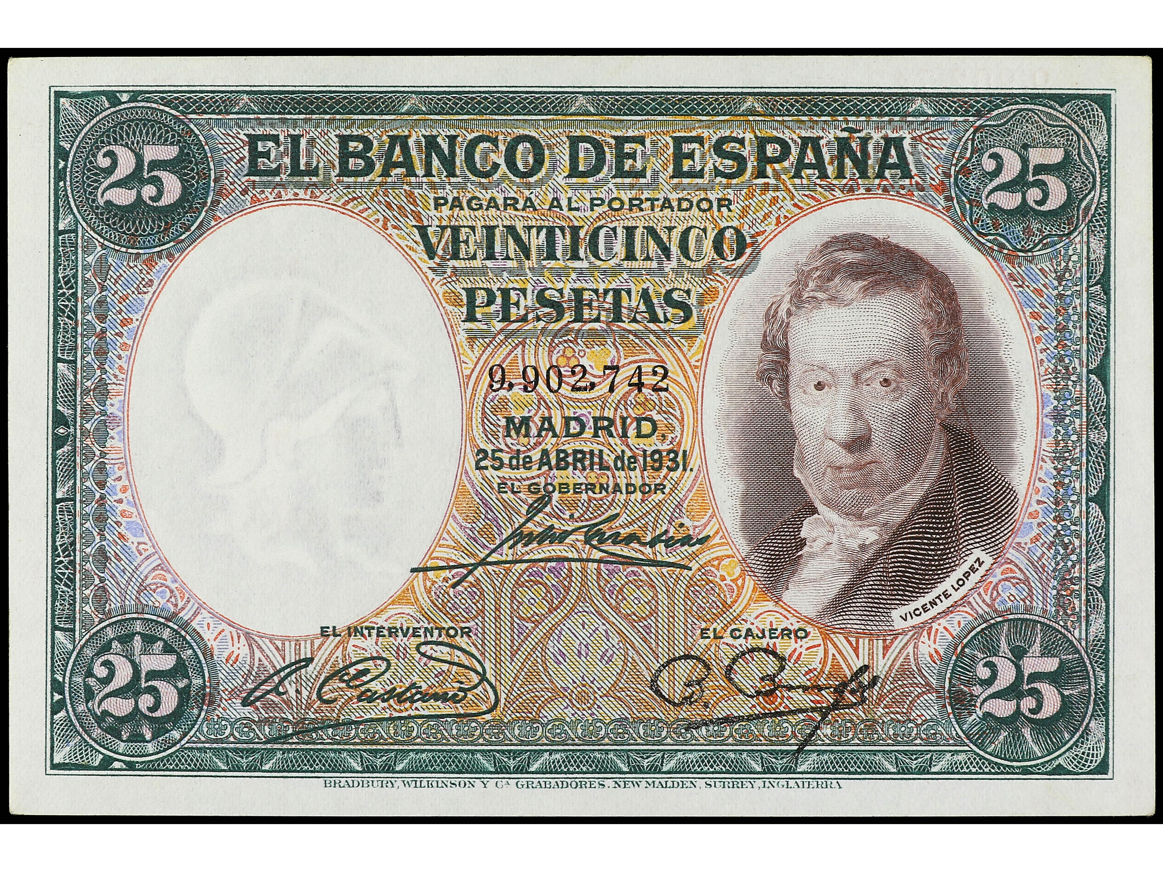 25 Pesetas. 25 Abril 1931. Vicente López. (Arrugas y esquinas tocadas). Ed-358. SC-. (Image1) (Image2)
