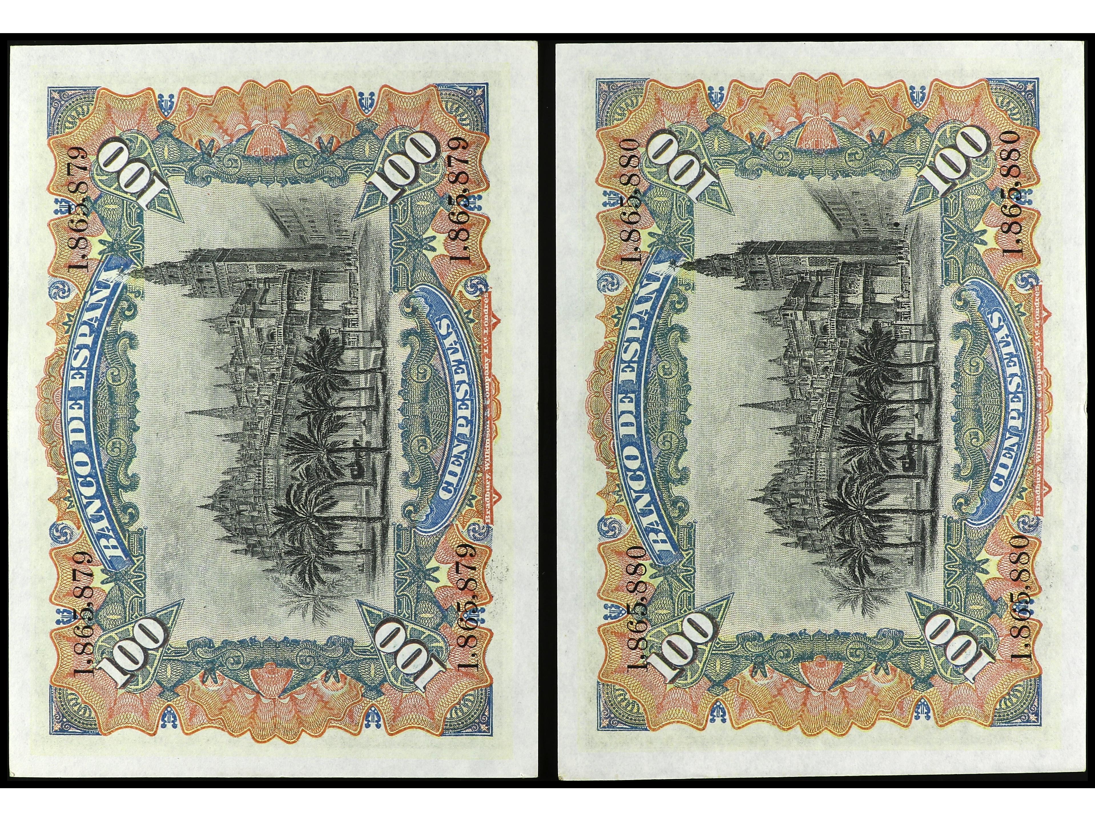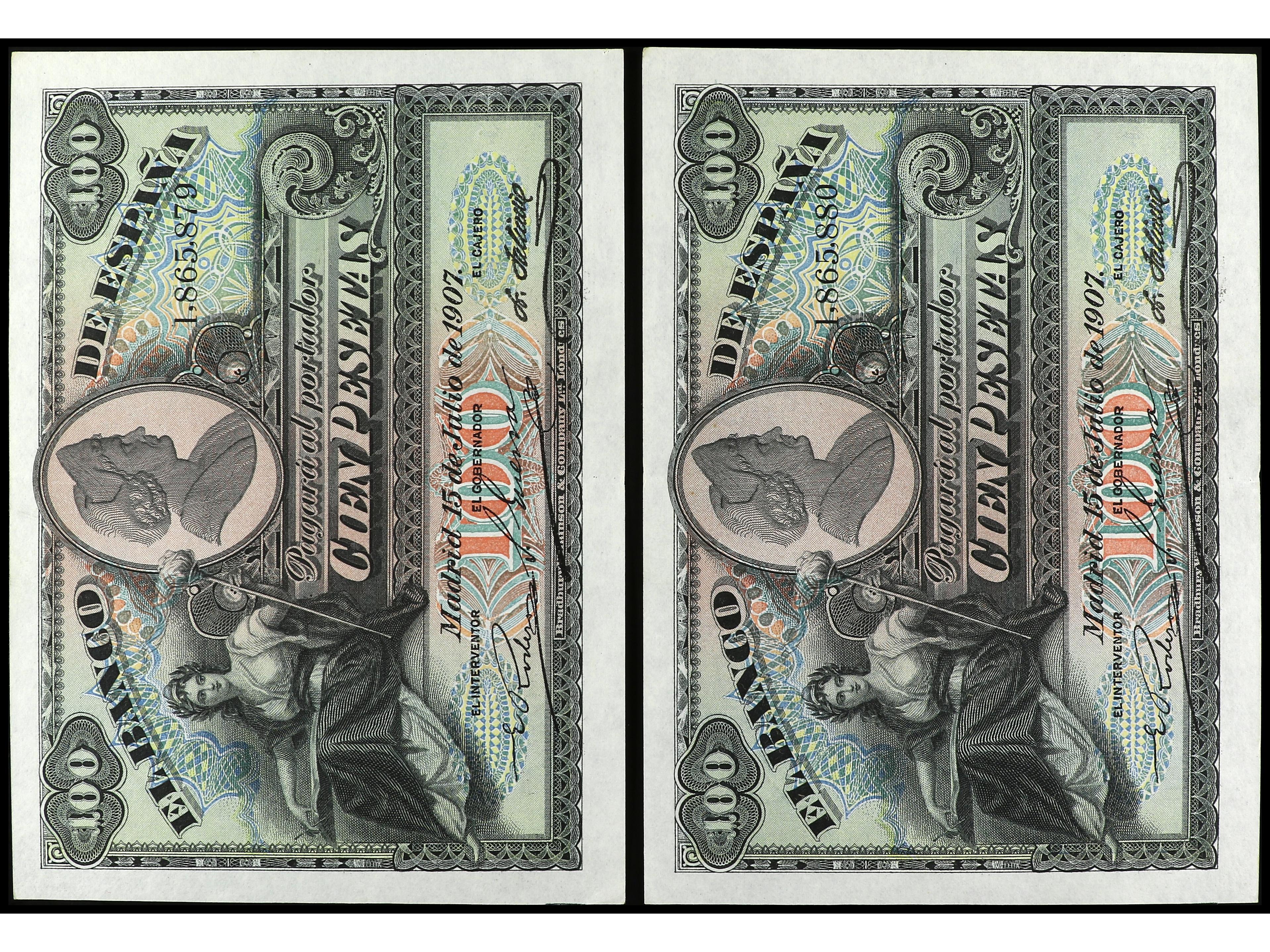 Lote 2 billetes 100 Pesetas. 15 Julio 1907. Catedral de Sevilla. Pareja correlativa. Ed-320. EBC-. (Image1) (Image2)