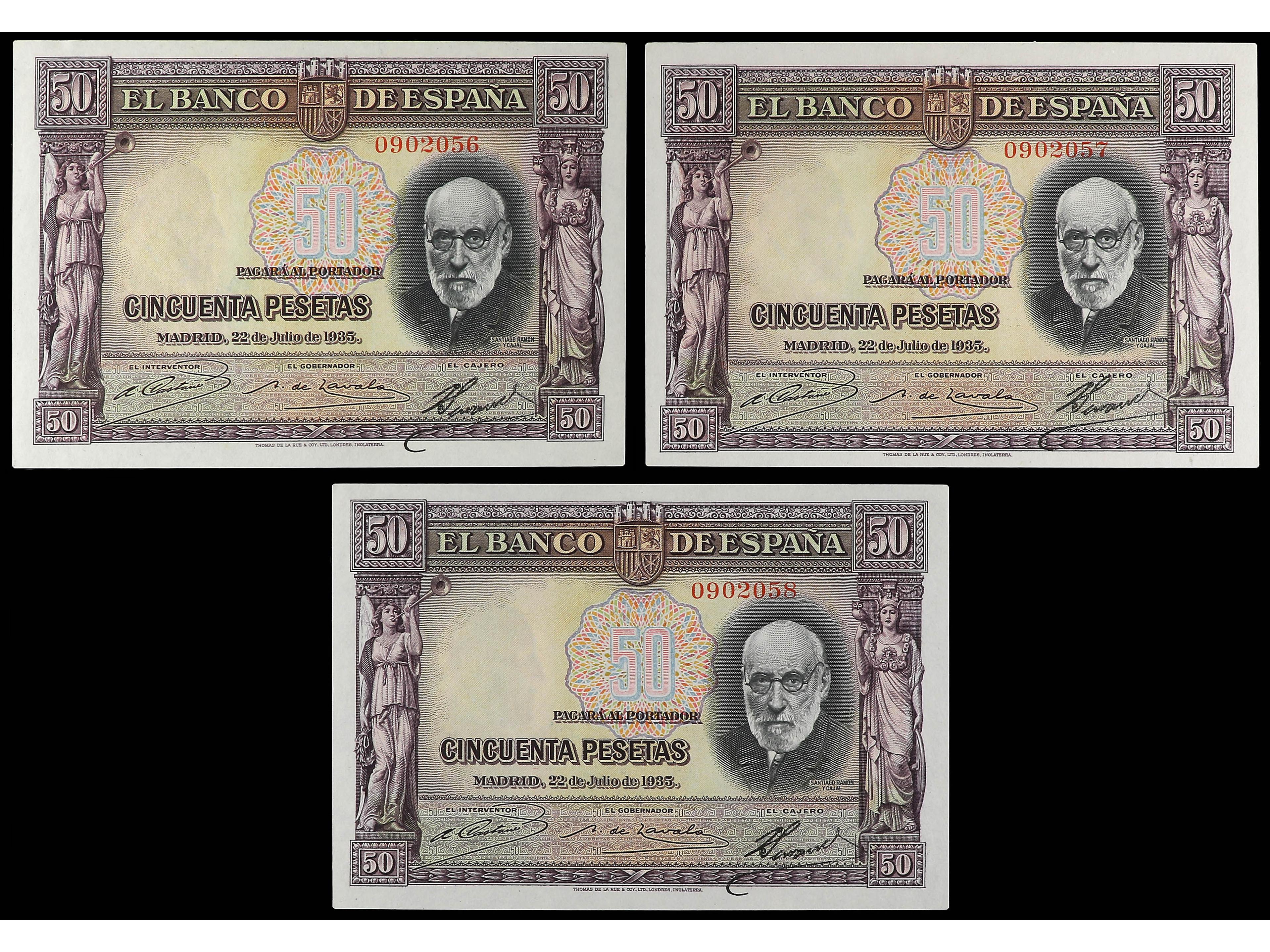 Lote 3 billetes 50 Pesetas. 22 Julio 1935. Ramón y Cajal. Sin Serie. Trío correlativo. Ed-366. SC- a SC. (Image1)