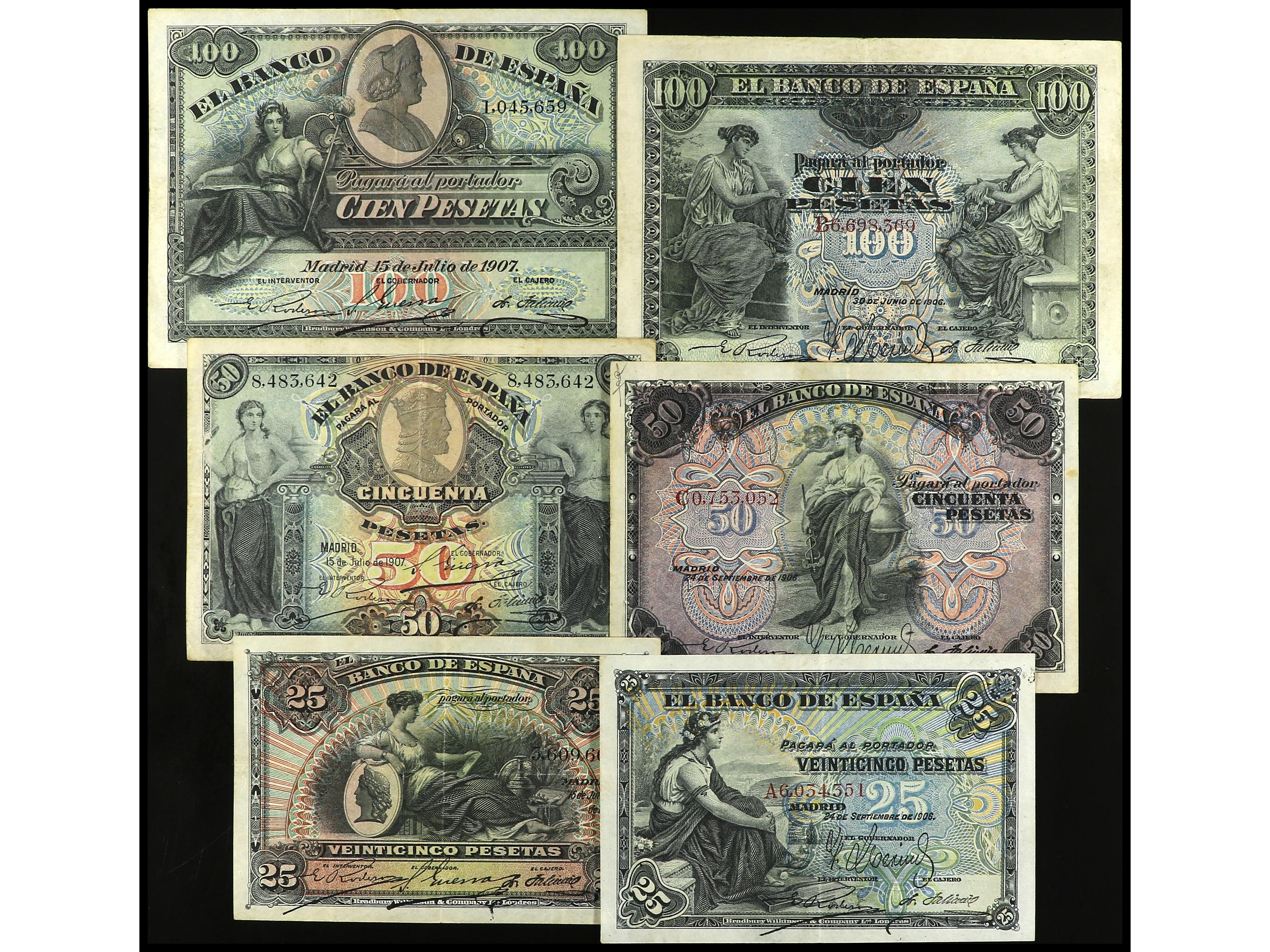 Lote 6 billetes 25 (2), 50 (2), 100 Pesetas (2). 1906 a 1907. A EXAMINAR. MBC- a MBC. (Image1)