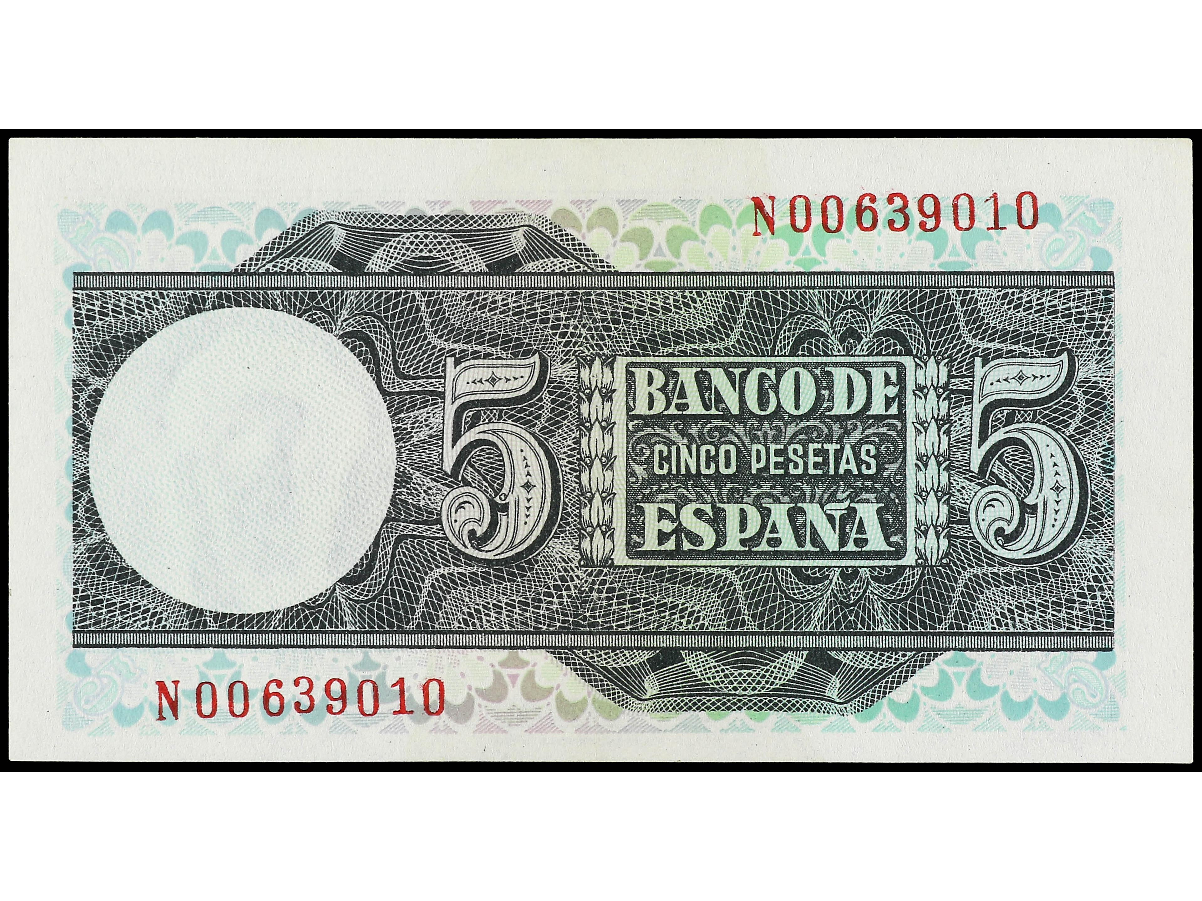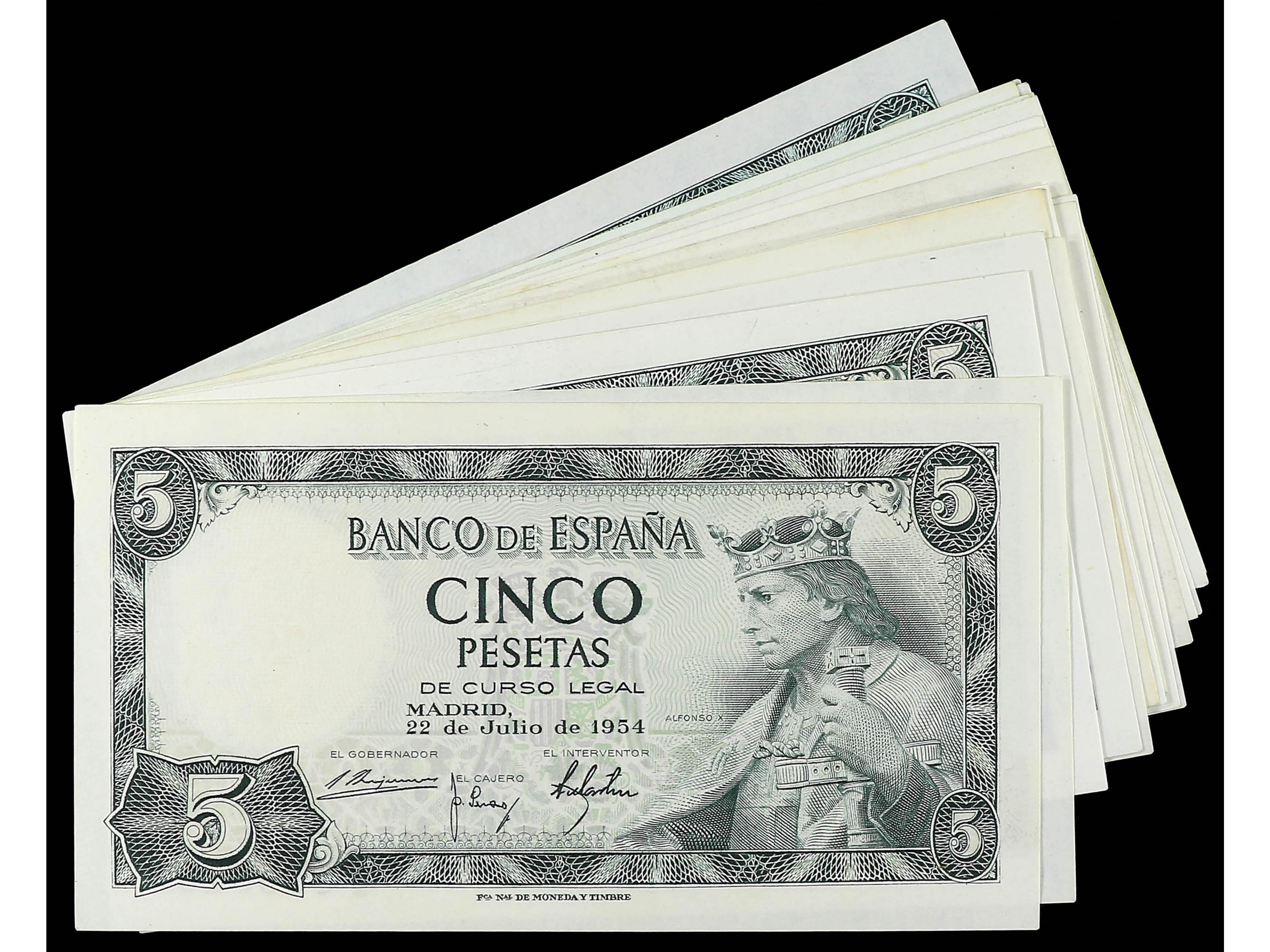 3133 imageLote 22 billetes 5 Pesetas. 22 Julio 1954. Alfonso X. Sin serie y Serie A, B, C, D, E, F, G, H, I, J, K, L, M, N, P, Q, R, S, T, U, V. Ed-466, 466a. EBC- a SC-. (Image1)