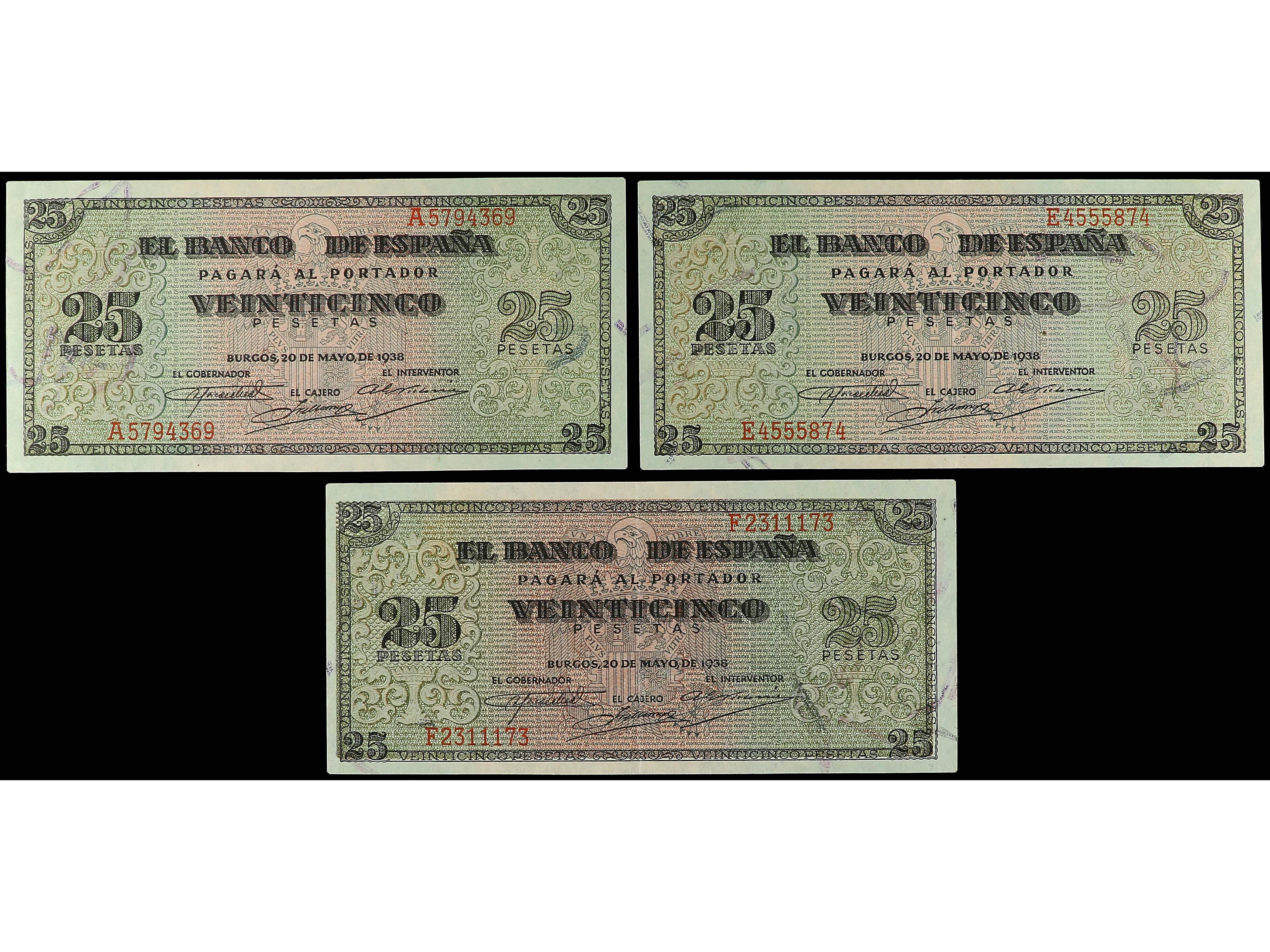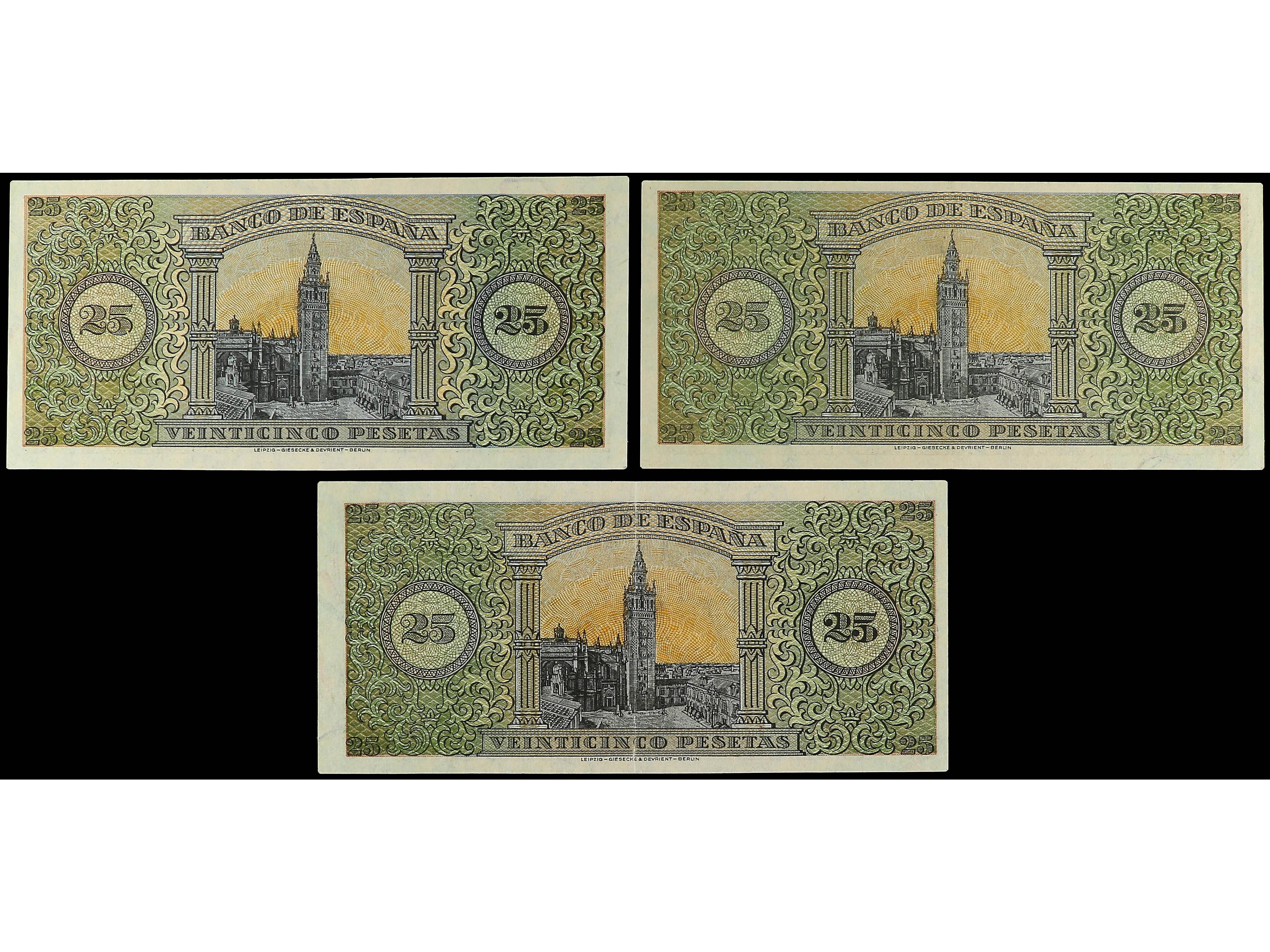 3144 imageLote 3 billetes 25 Pesetas. 20 Mayo 1938. Giralda de Sevilla. Series A, E, F. A EXAMINAR. Ed-430, 430a, 430b. EBC- a EBC+. (Image1) (Image2)