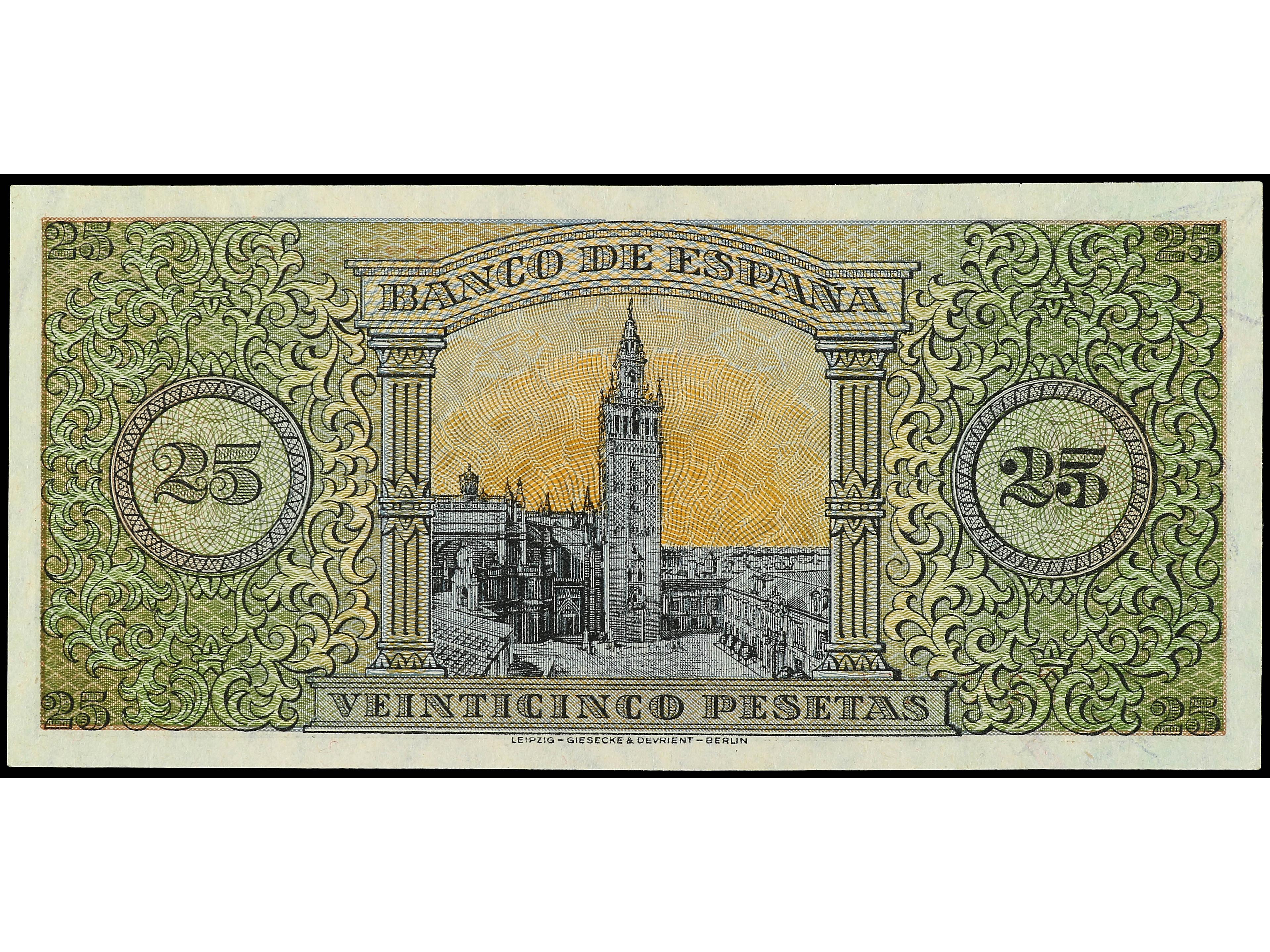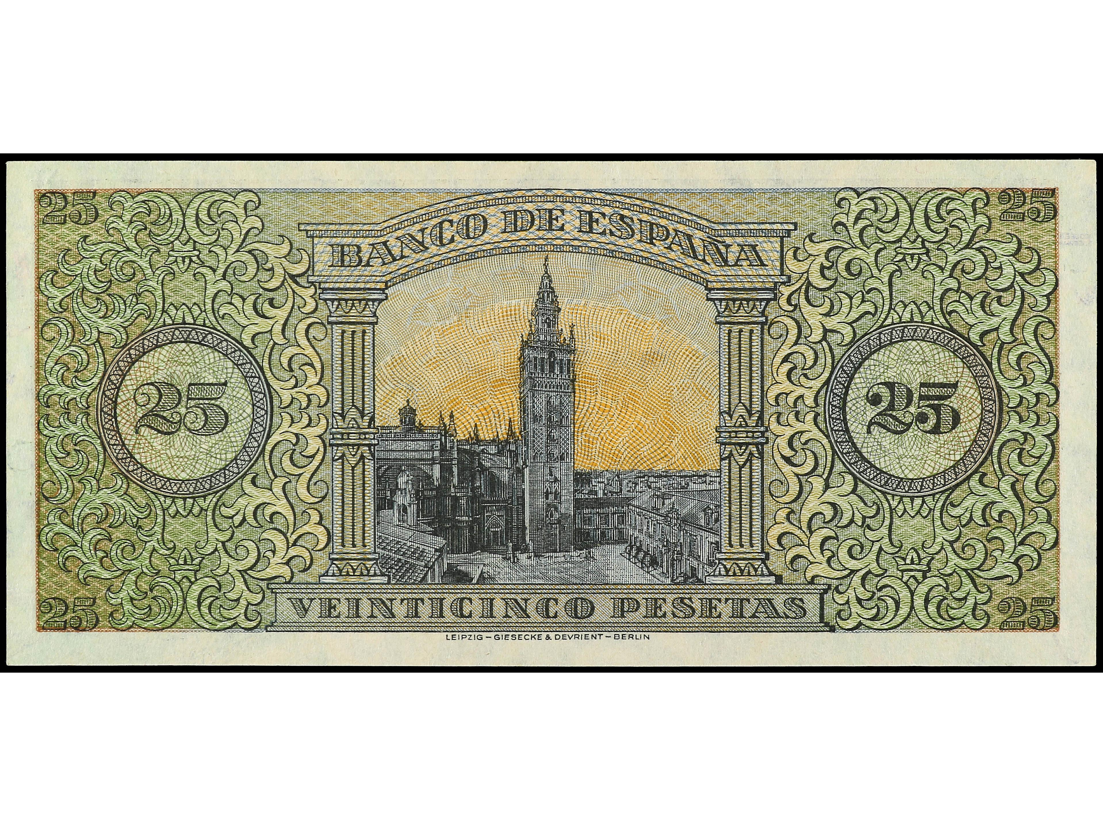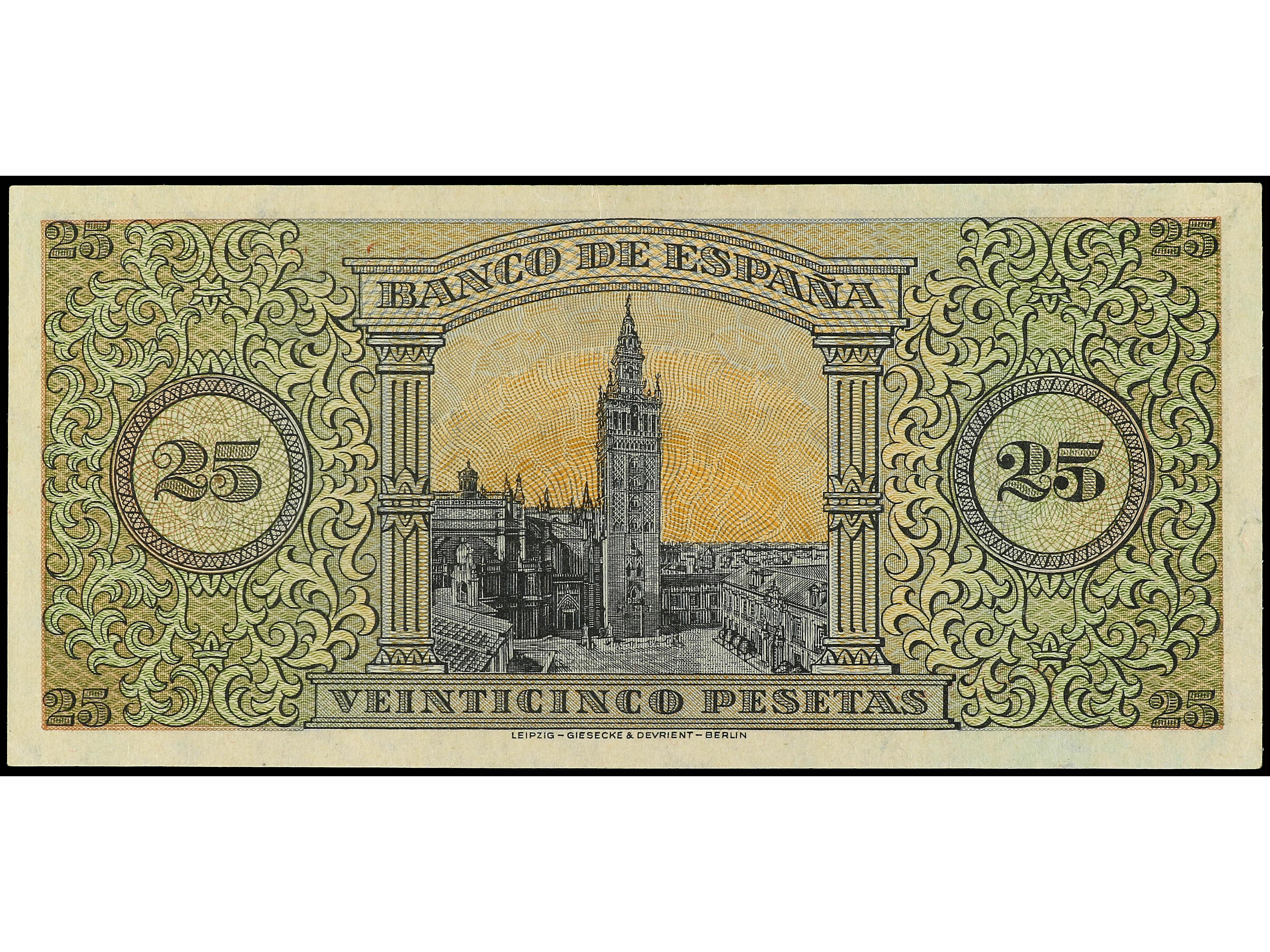 3142 image25 Pesetas. 20 Mayo 1938. Giralda de Sevilla. Serie B. Ed-430a. SC. (Image1) (Image2)