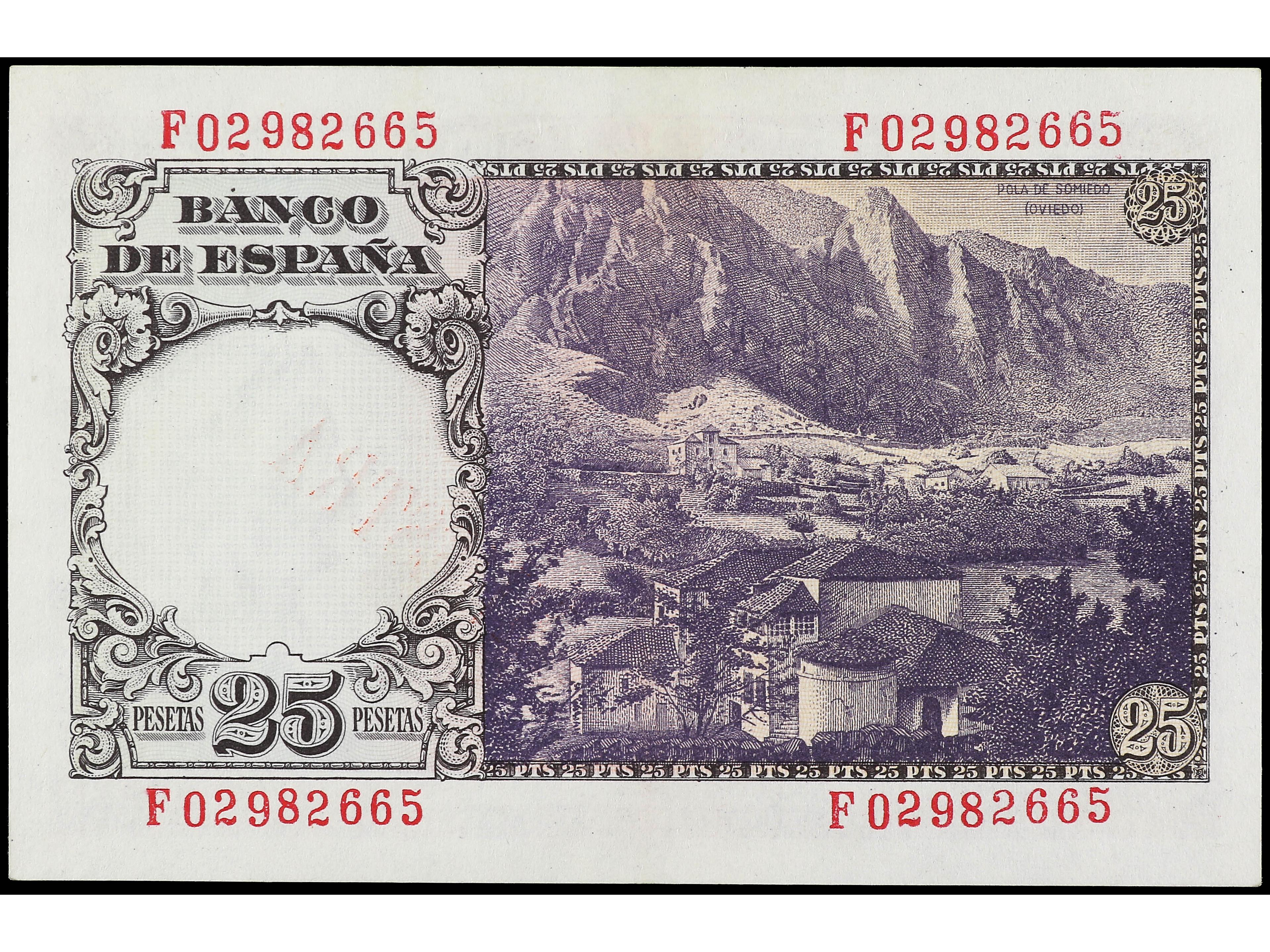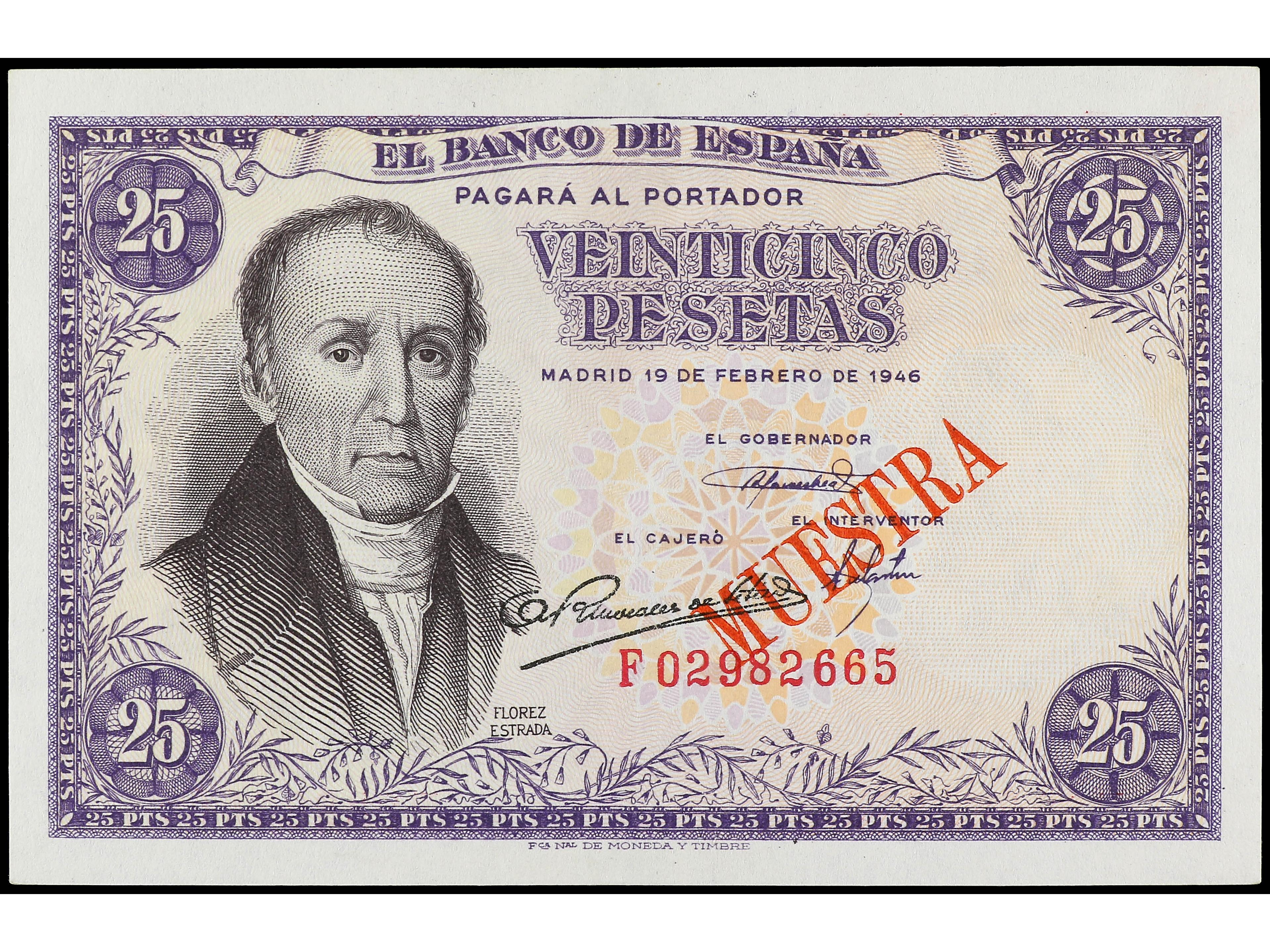3148 image25 Pesetas. 19 Febrero 1946. Flórez Estrada. Serie F. Sobrecarga tipográfica ´MUESTRA´ en rojo en anverso. Ed-No catalogado. EBC. (Image1) (Image2)