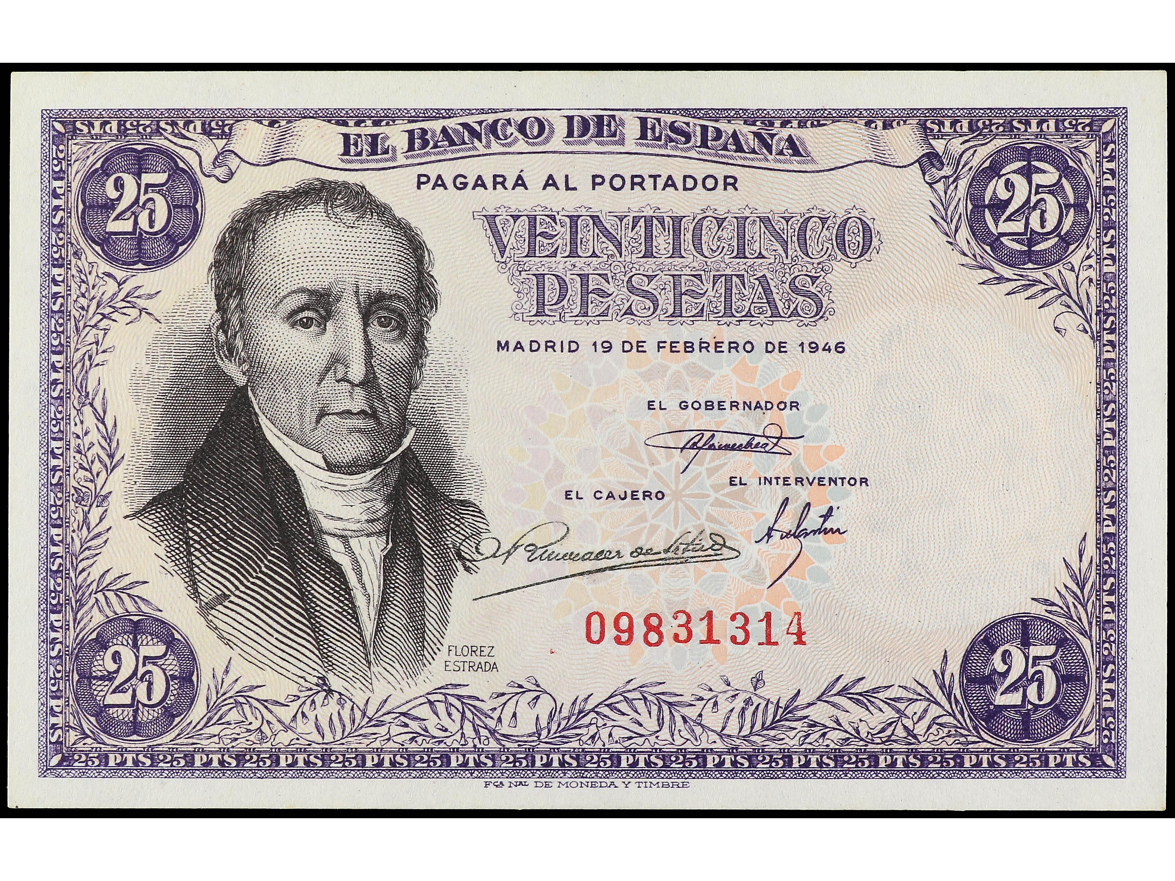 3147 image25 Pesetas. 19 Febrero 1946. Flórez Estrada. Sin Serie. (Leves arruguitas). Ed-450. SC-. (Image1) (Image2)