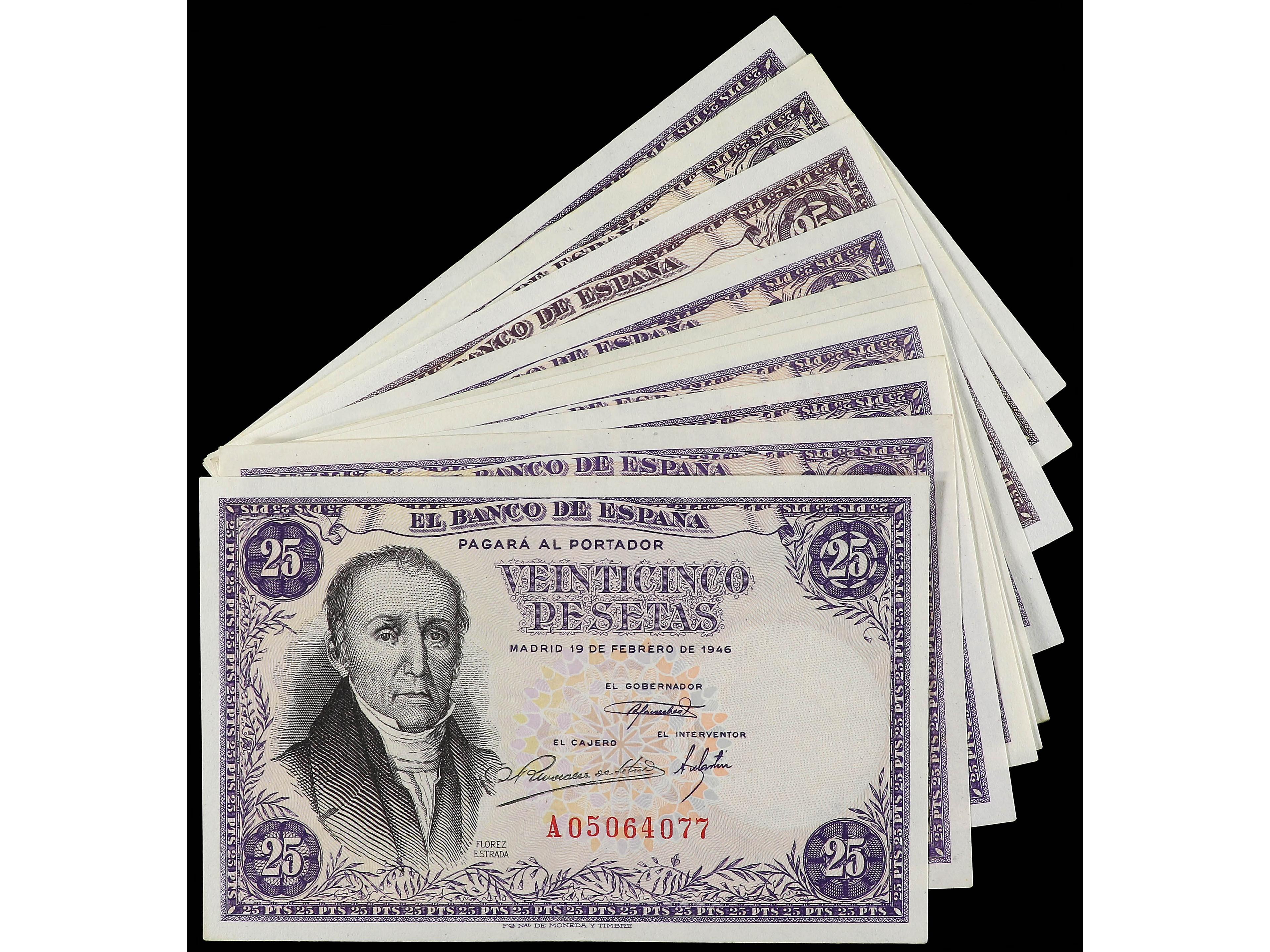 3149 imageLote 10 billetes 25 Pesetas. 19 Febrero 1946. Flórez Estrada. Series A, B, C, D, E, F, G, H, I, J. A EXAMINAR. Ed-450, 450a. EBC a SC. (Image1)