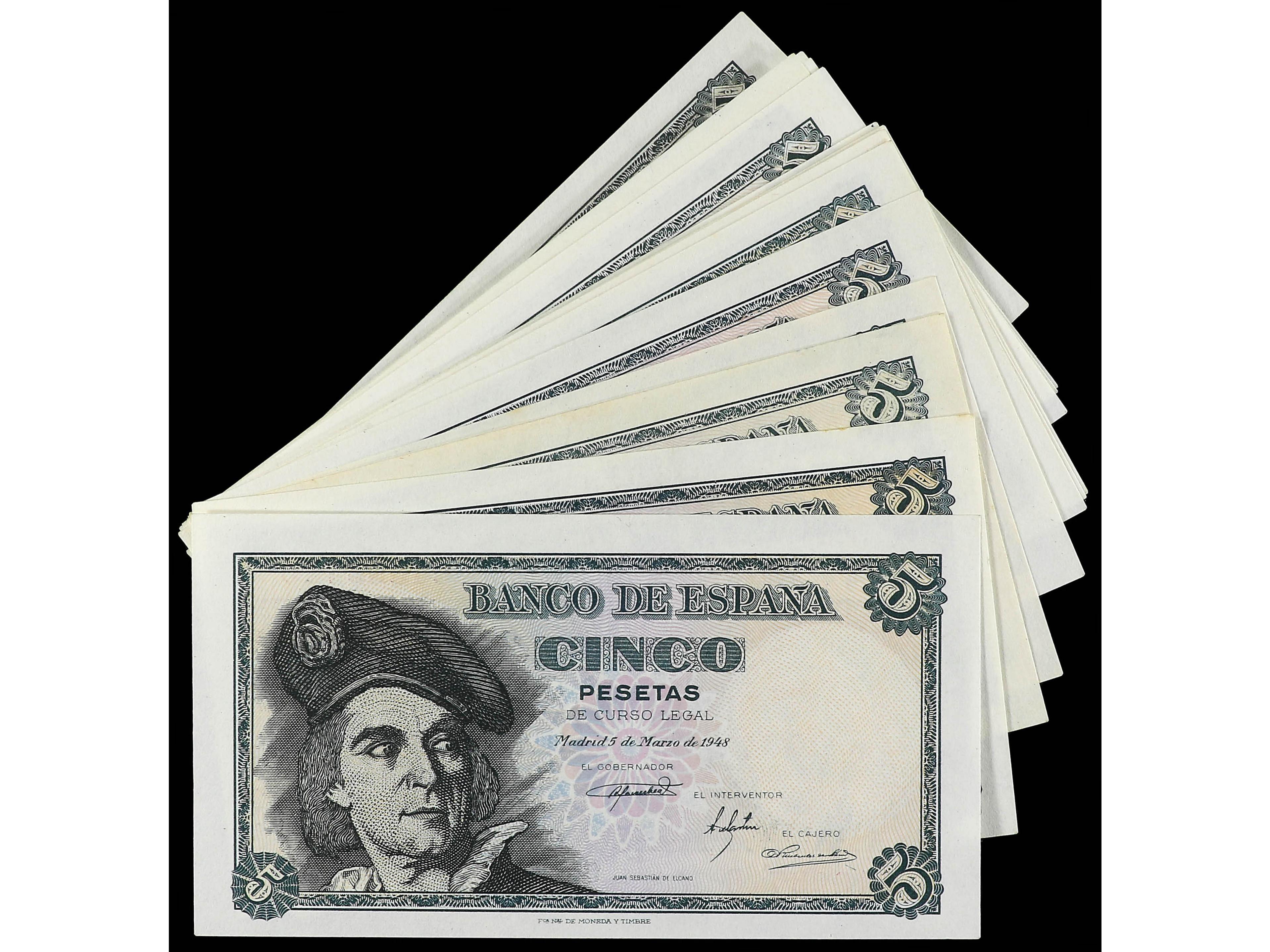 3131 imageLote 14 billetes 5 Pesetas. 15 Marzo 1948. Elcano. Sin Serie, Series A, B, C, D, E, F, G, H, I, J, K, L, M. A EXAMINAR. Ed-455, 455a. EBC a SC. (Image1)