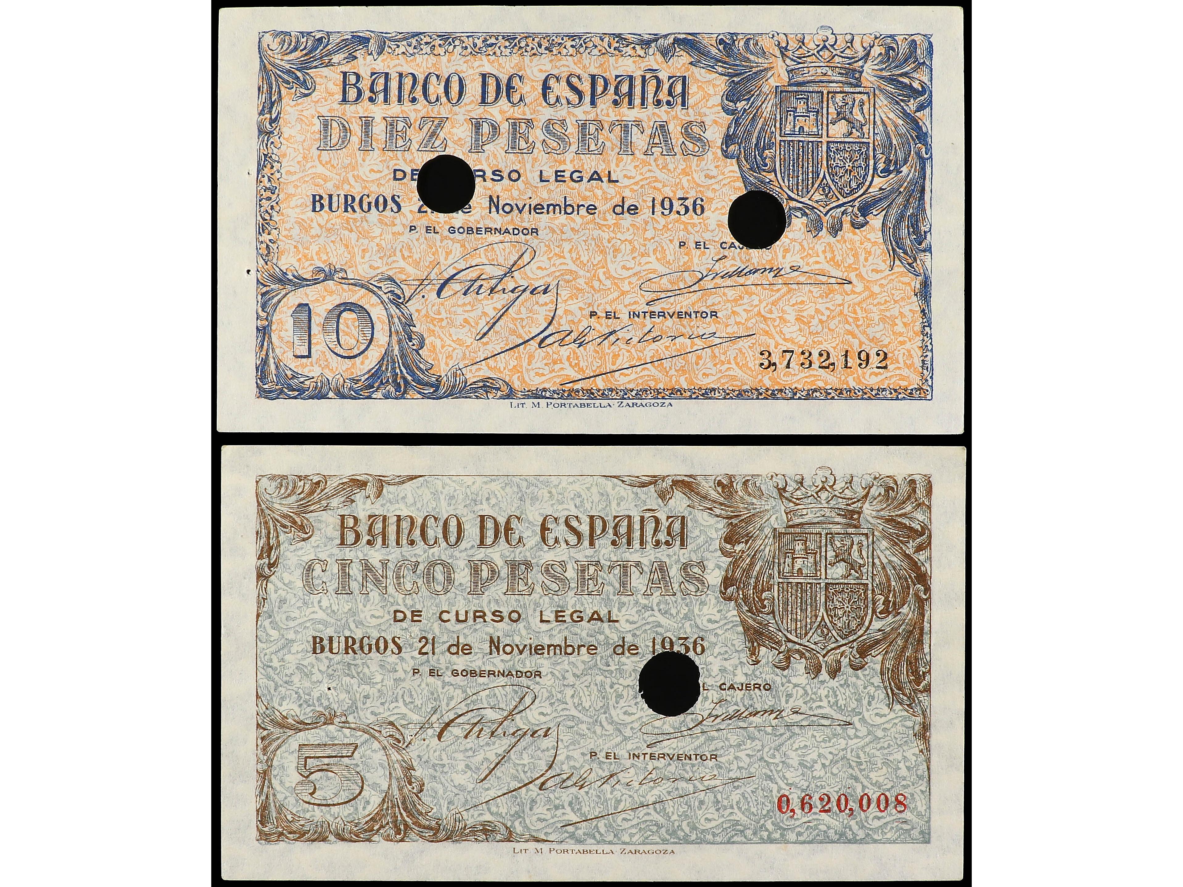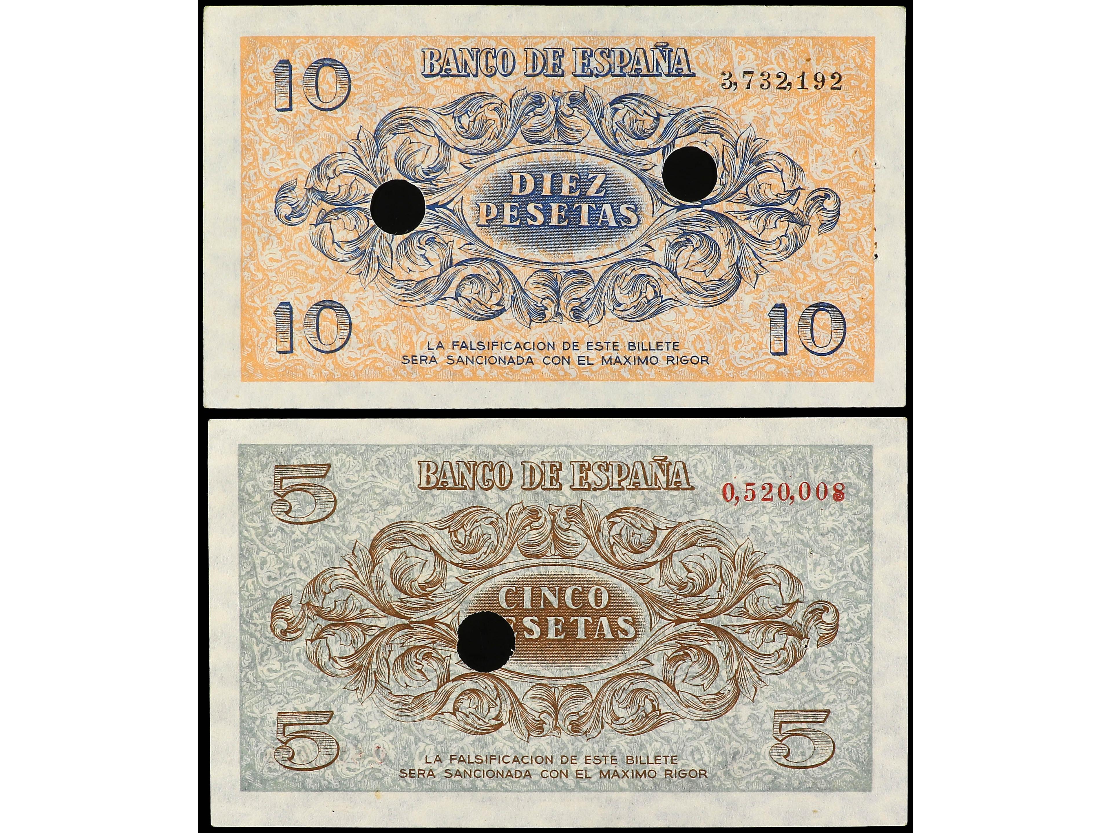 3135 imageLote 2 billetes 5 y 10 Pesetas. 21 Noviembre 1936. Con taladros de cancelación. (Puntos de grapa). Ed-417T y 418T. EBC. (Image1) (Image2)
