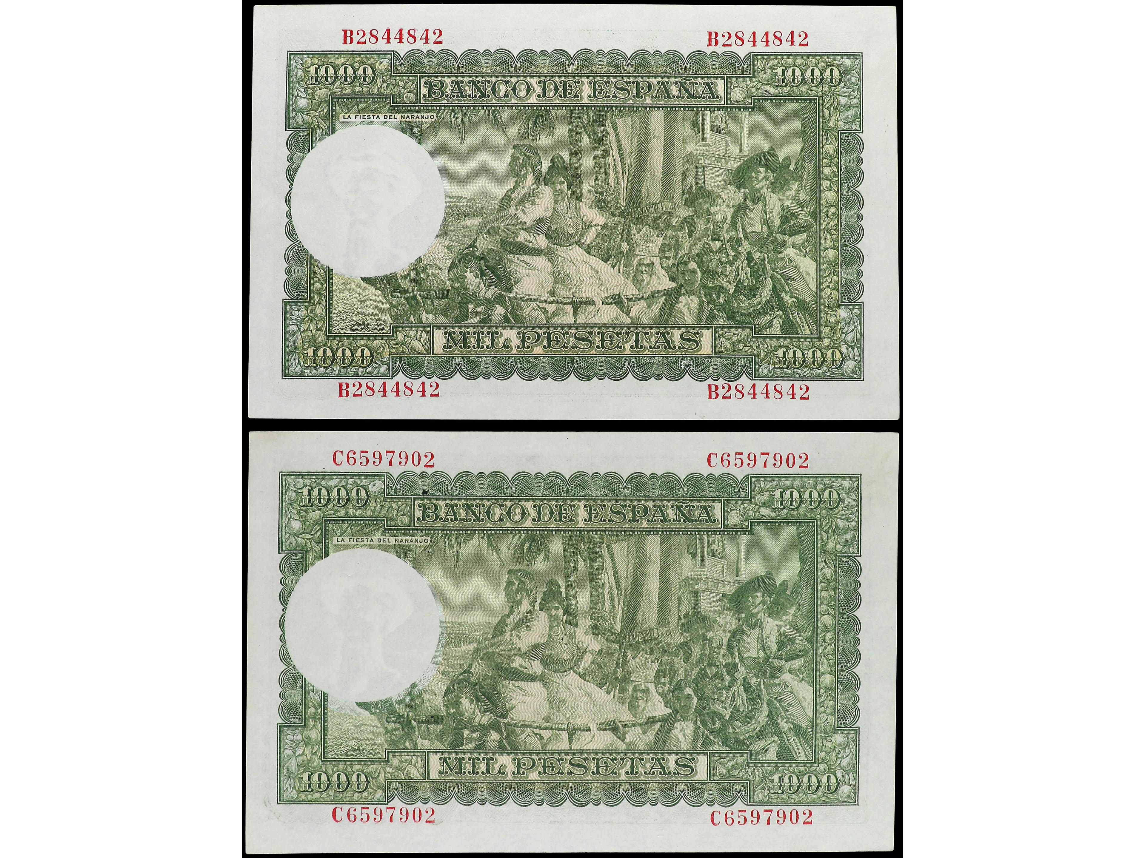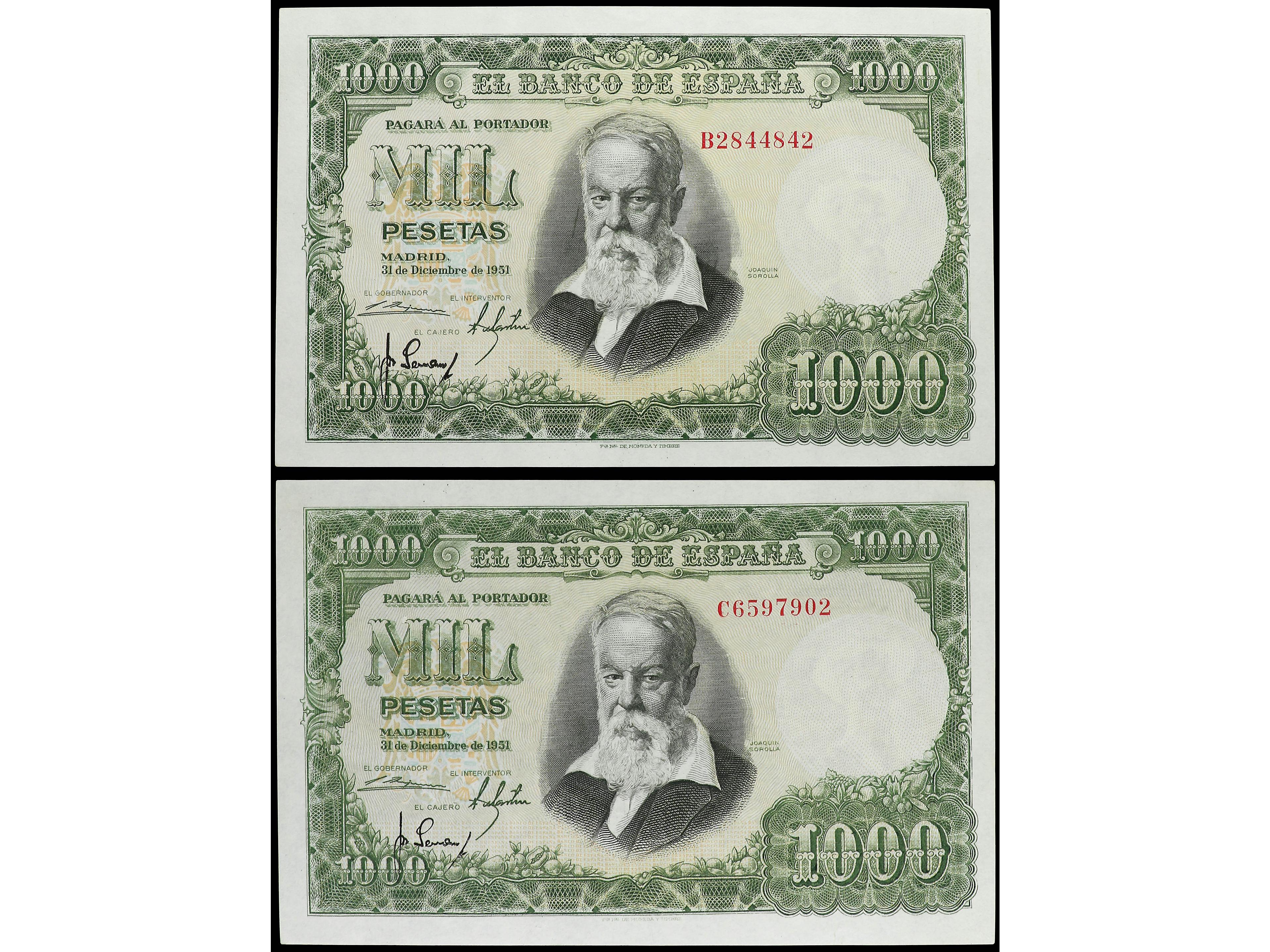 Lote 2 billetes 1.000 Pesetas. 31 Diciembre 1951. Sorolla. Serie B y C. (Arruguitas). Ed-463a, 463b. SC-. (Image1) (Image2)
