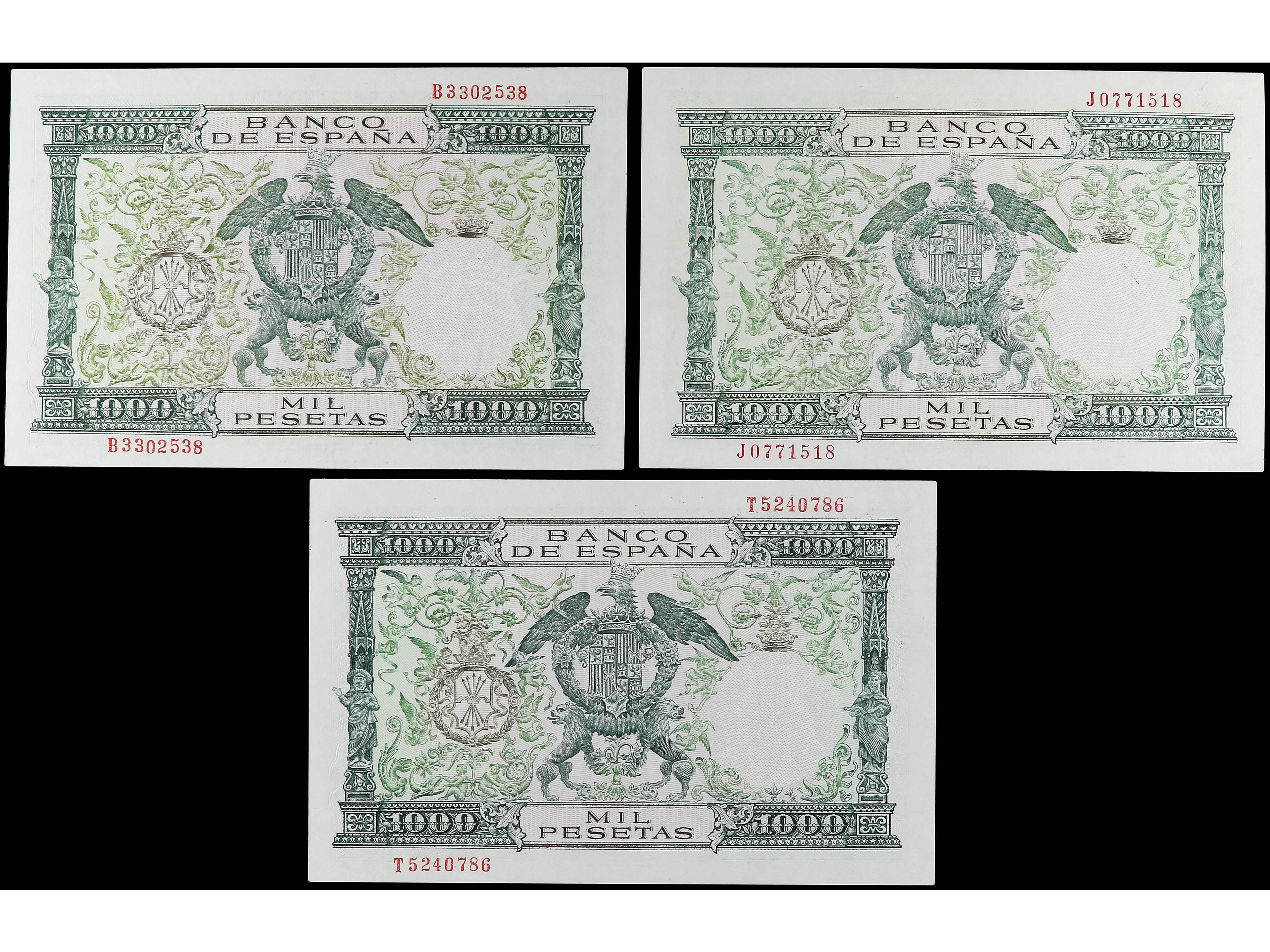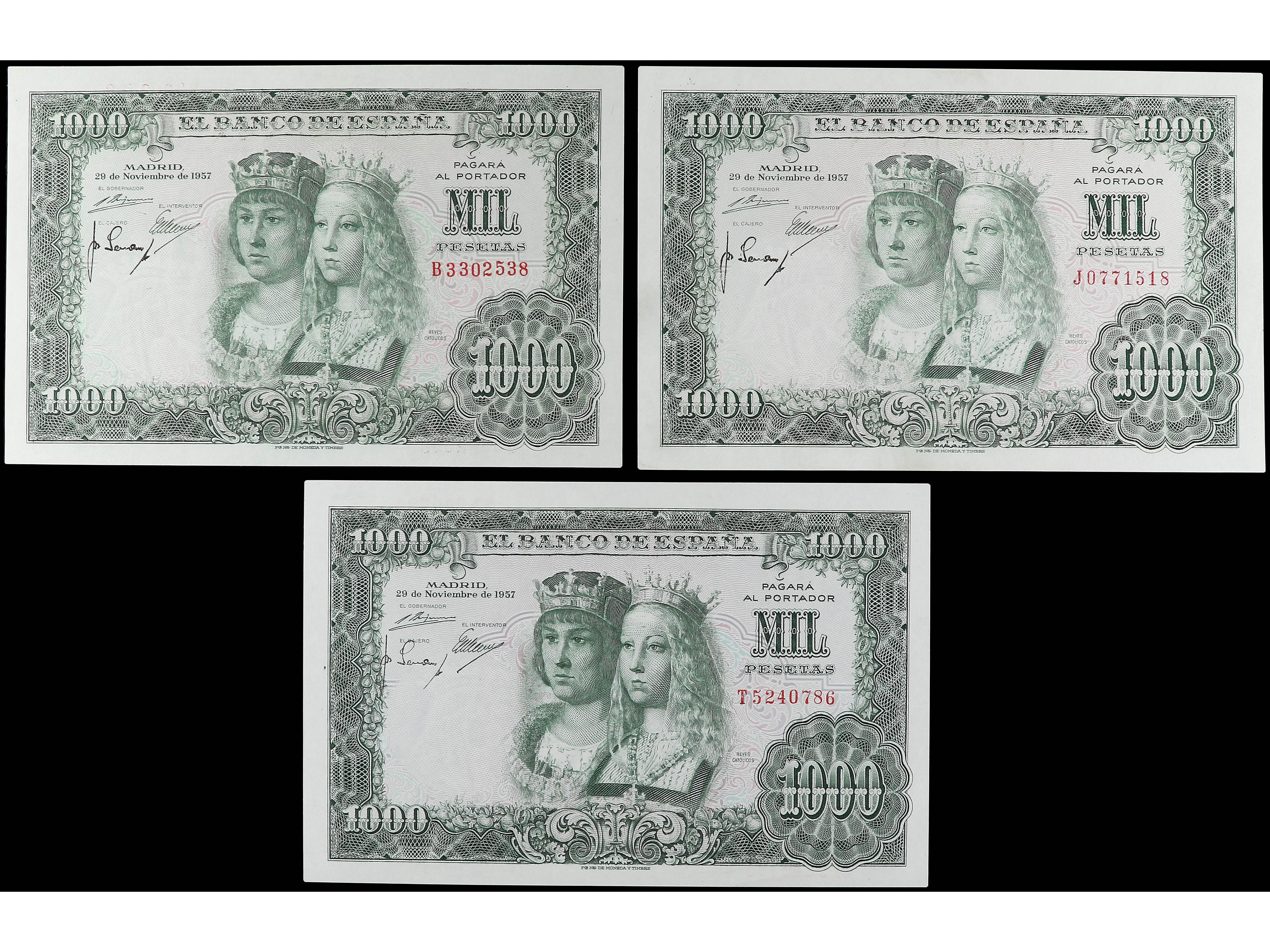 Lote 3 billetes 1.000 Pesetas. 29 Noviembre 1957. Reyes Católicos. Serie B, J y T. (Arrugas). Ed-469b. SC-. (Image1) (Image2)