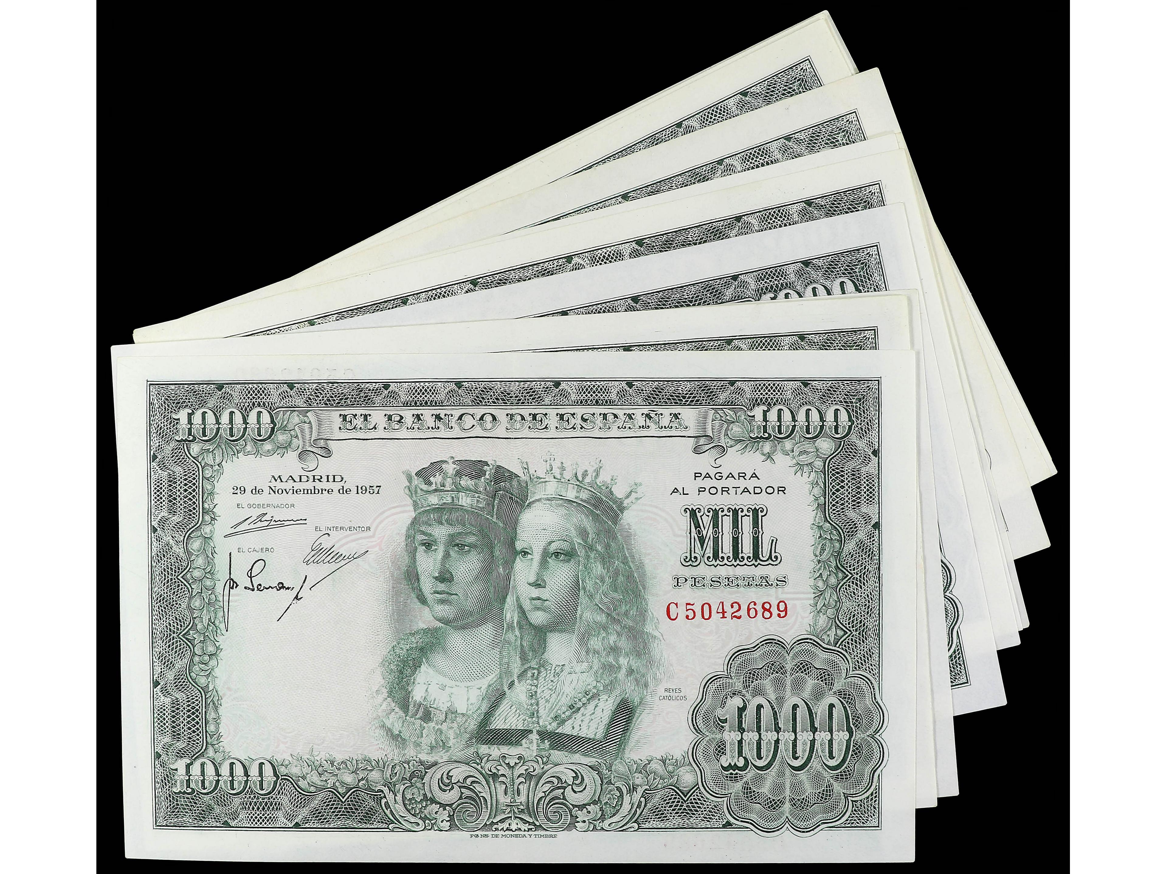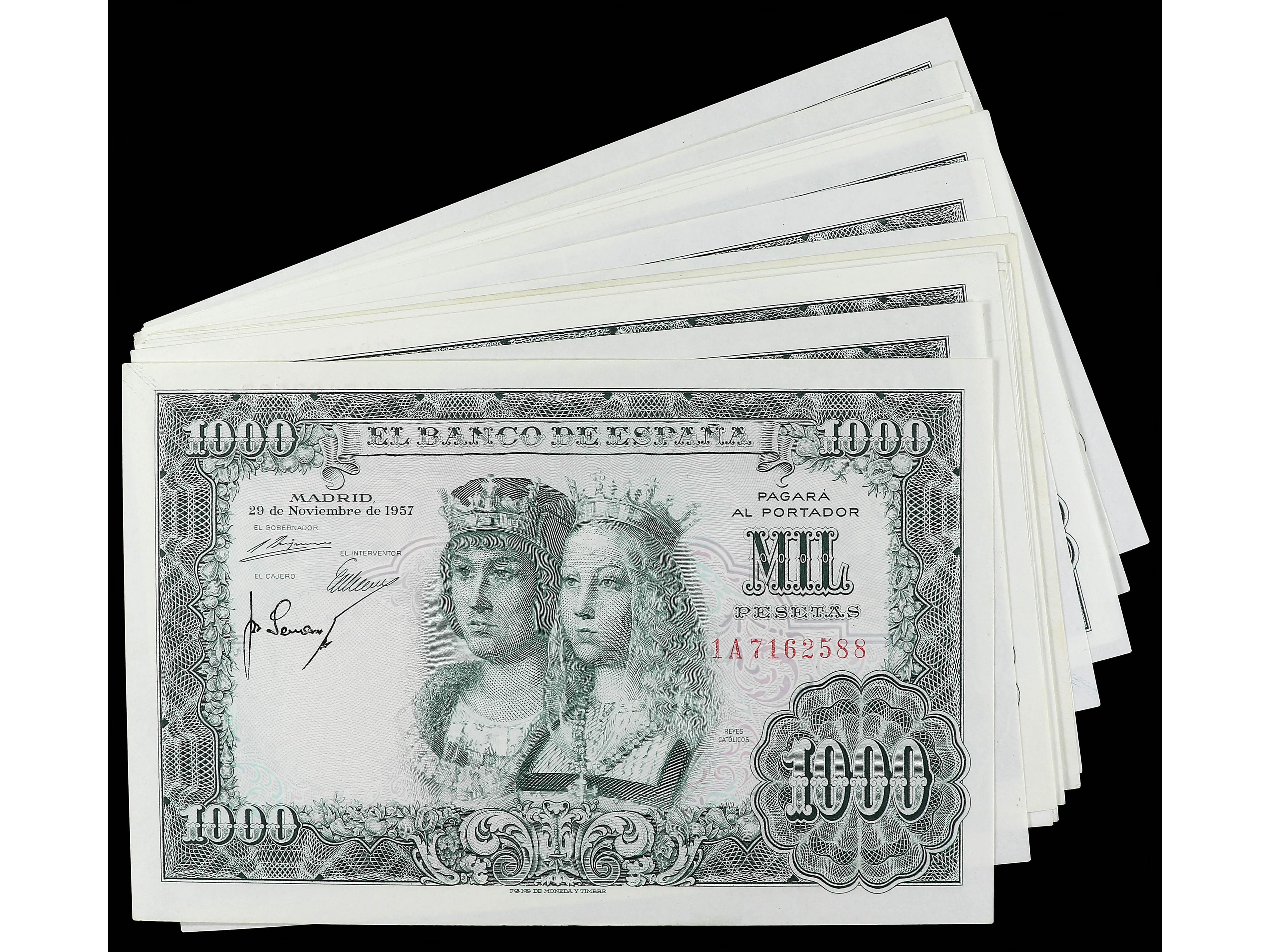Lote 18 billetes 1.000 Pesetas. 29 Noviembre 1957. Reyes Católicos. Serie 1A, 1B, 1C, 1D, 1E, 1G, 1H, 1J, 1N, 1R, 1S, 1T, 1U1V, 1W, 1X, 1Y. A EXAMINAR. EBC. (Image1)