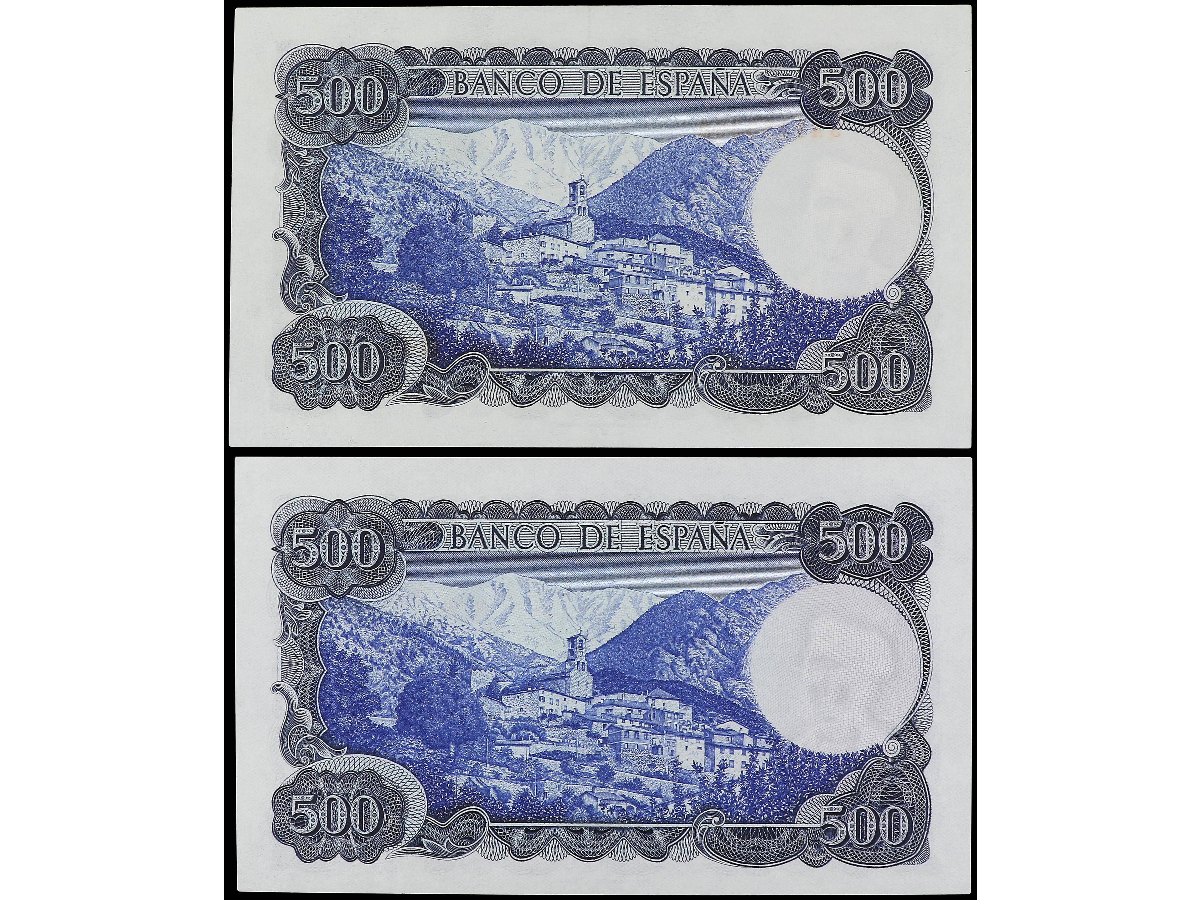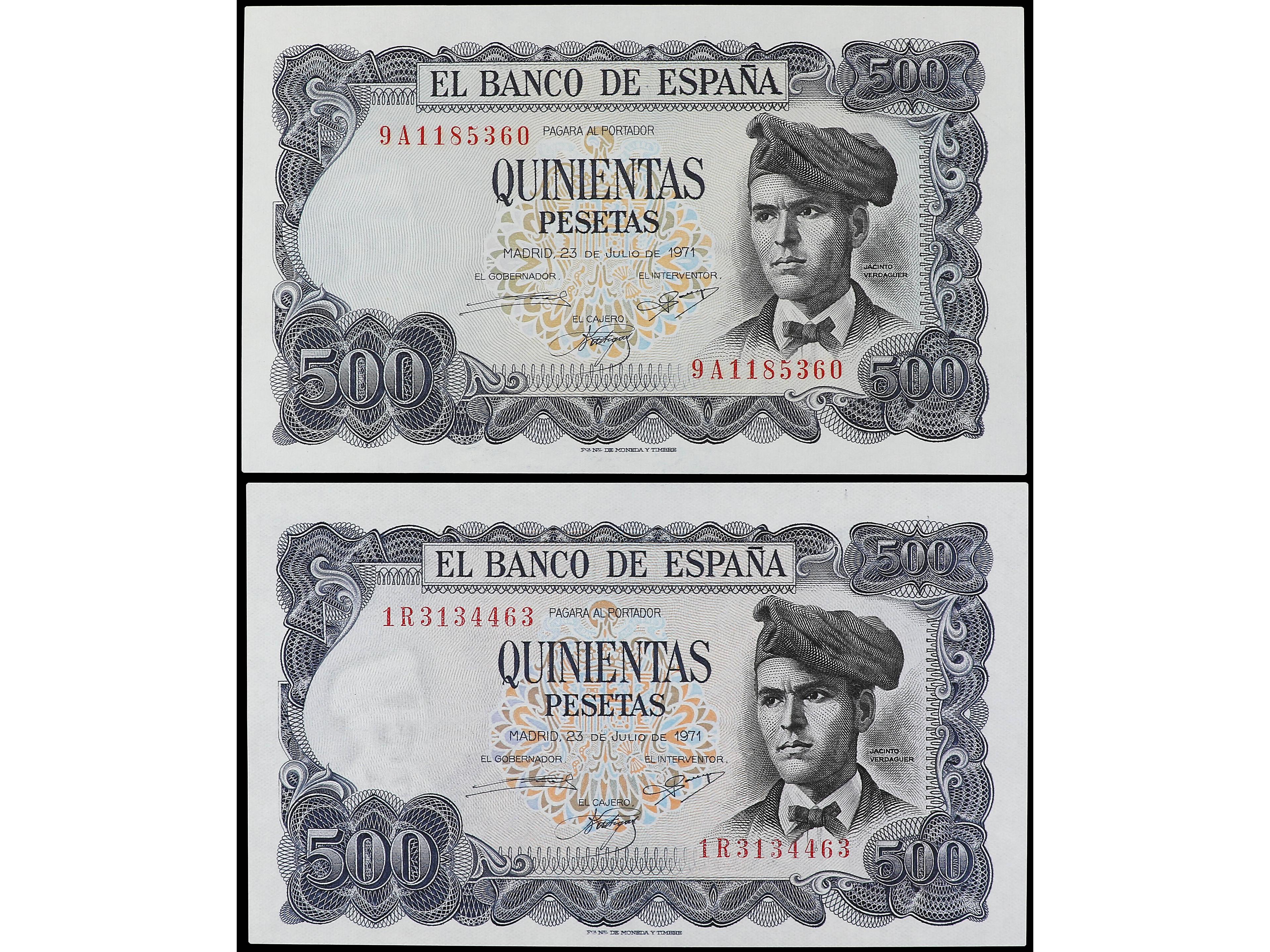 Lote 2 billetes 500 Pesetas. 23 Julio 1971. Verdaguer. Serie 1R y numeración especial 9A. Ed-473aa, 473b. EBC y SC-. (Image1) (Image2)