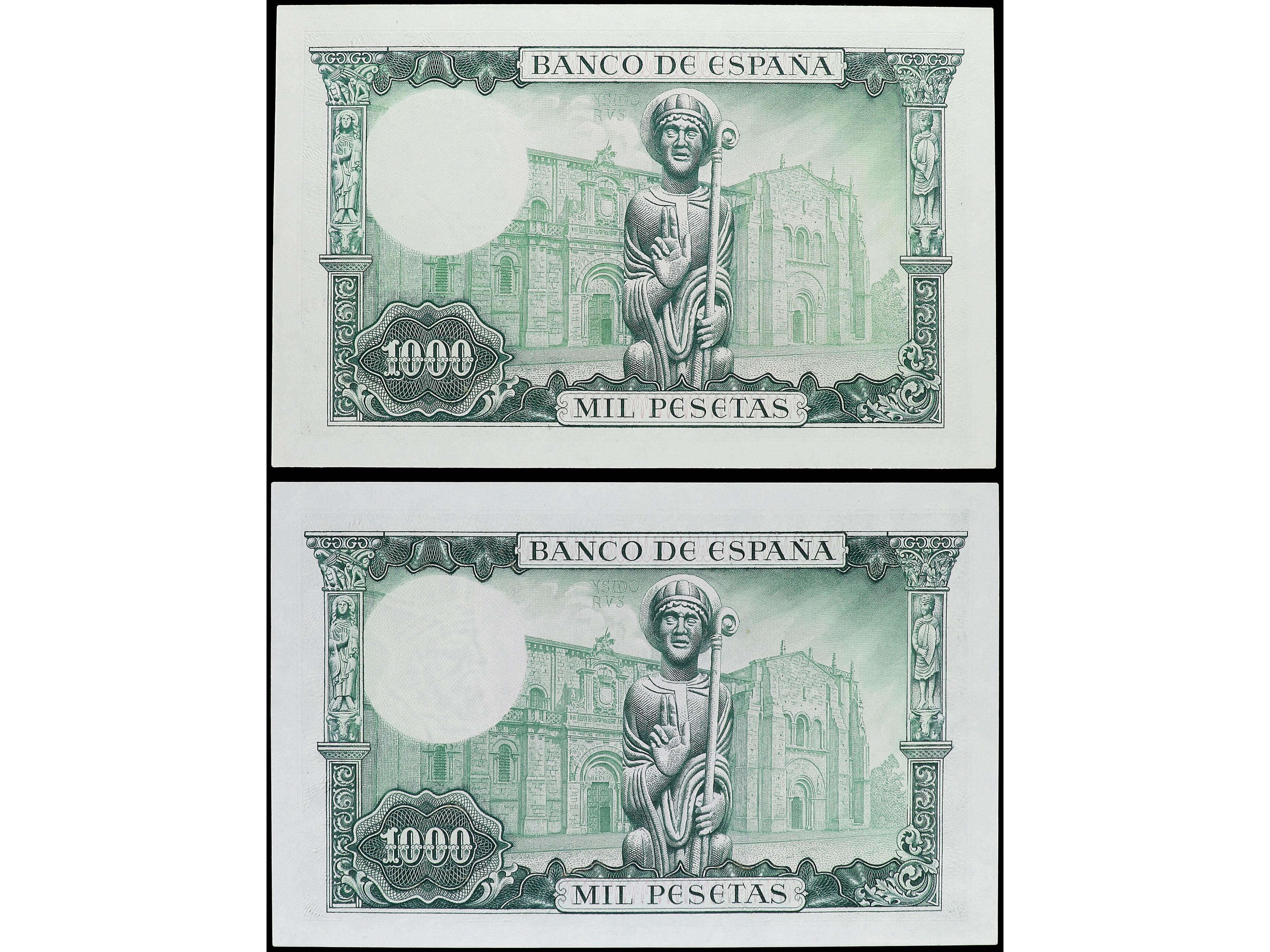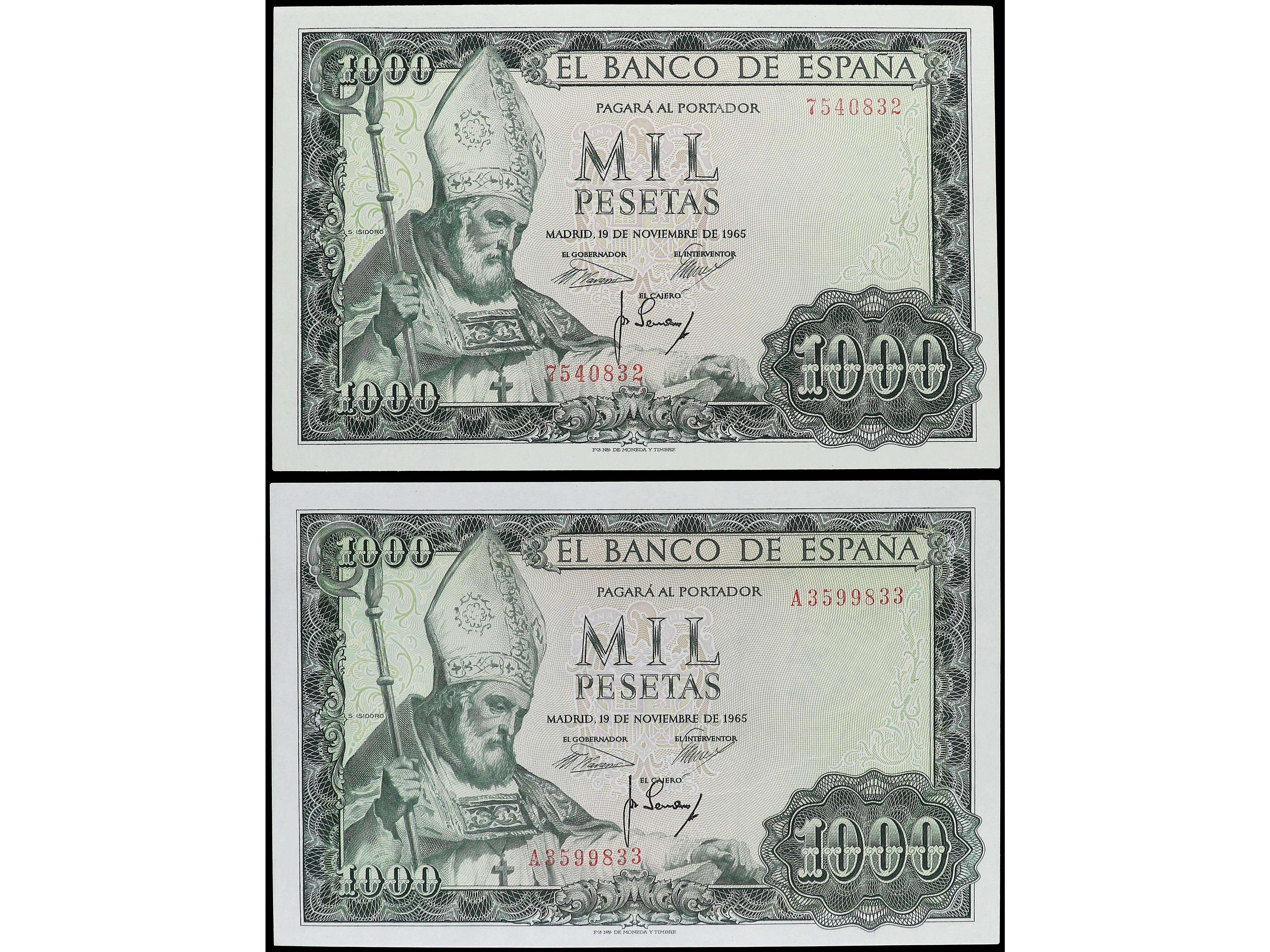 Lote 2 billetes 1.000 Pesetas. 19 Noviembre 1965. San Isidoro. Sin Serie y Serie A. Ed-471, 471a. EBC y SC-. (Image1) (Image2)