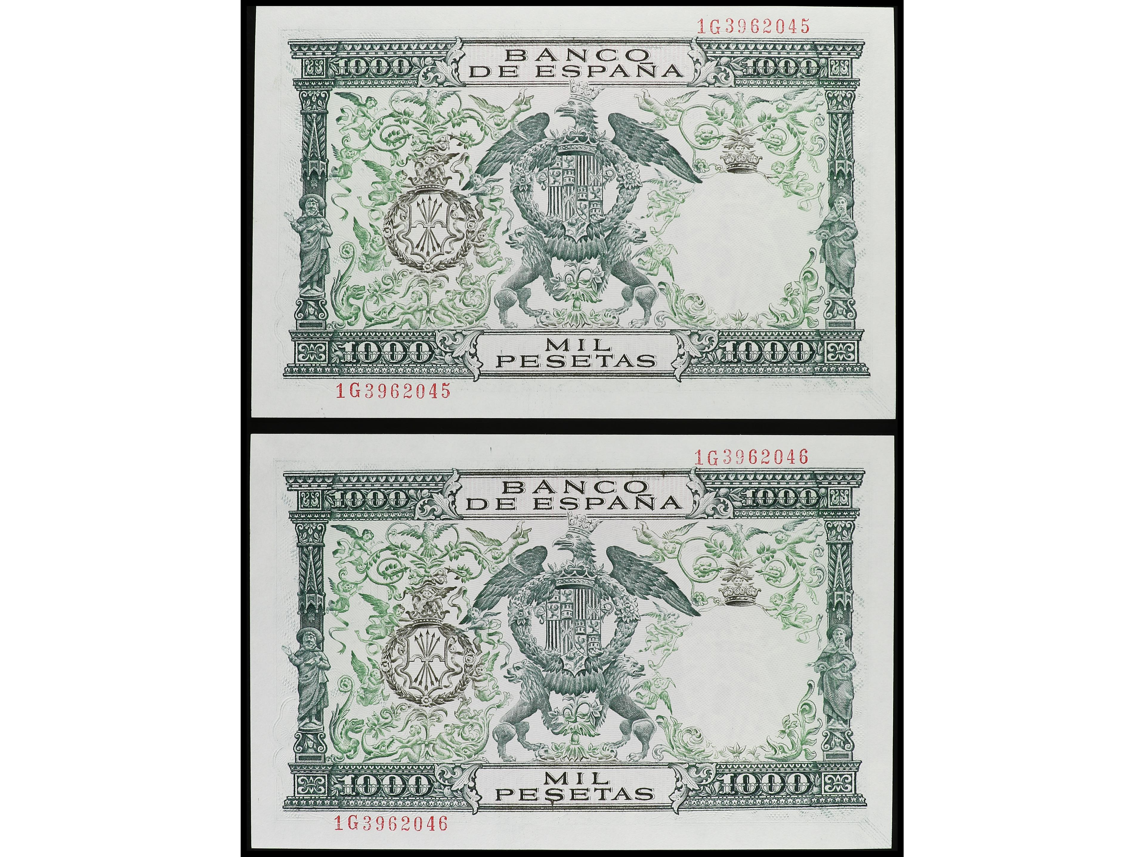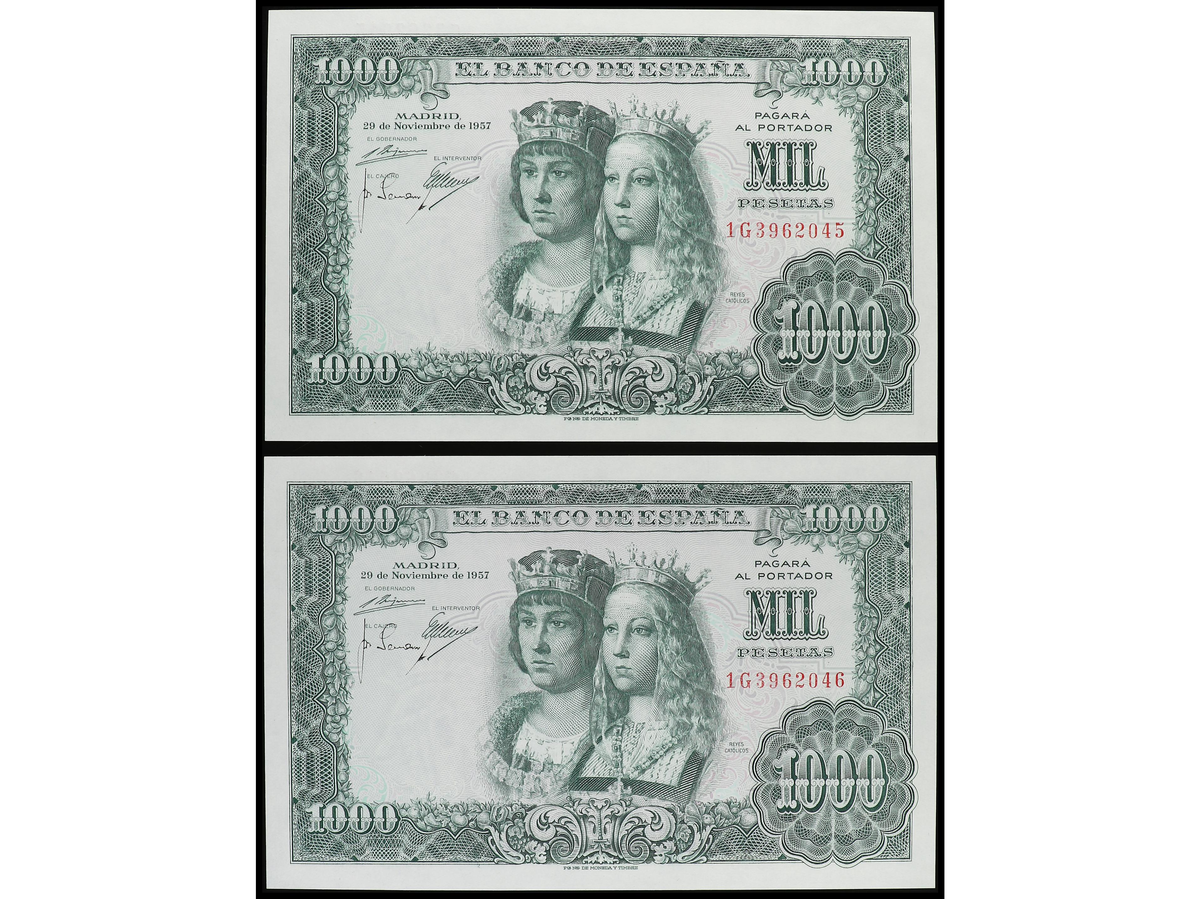 Lote 2 billetes 1.000 Pesetas. 29 Noviembre 1957. Reyes Católicos. Serie 1G. Pareja correlativa. Ed-469b. SC-. (Image1) (Image2)