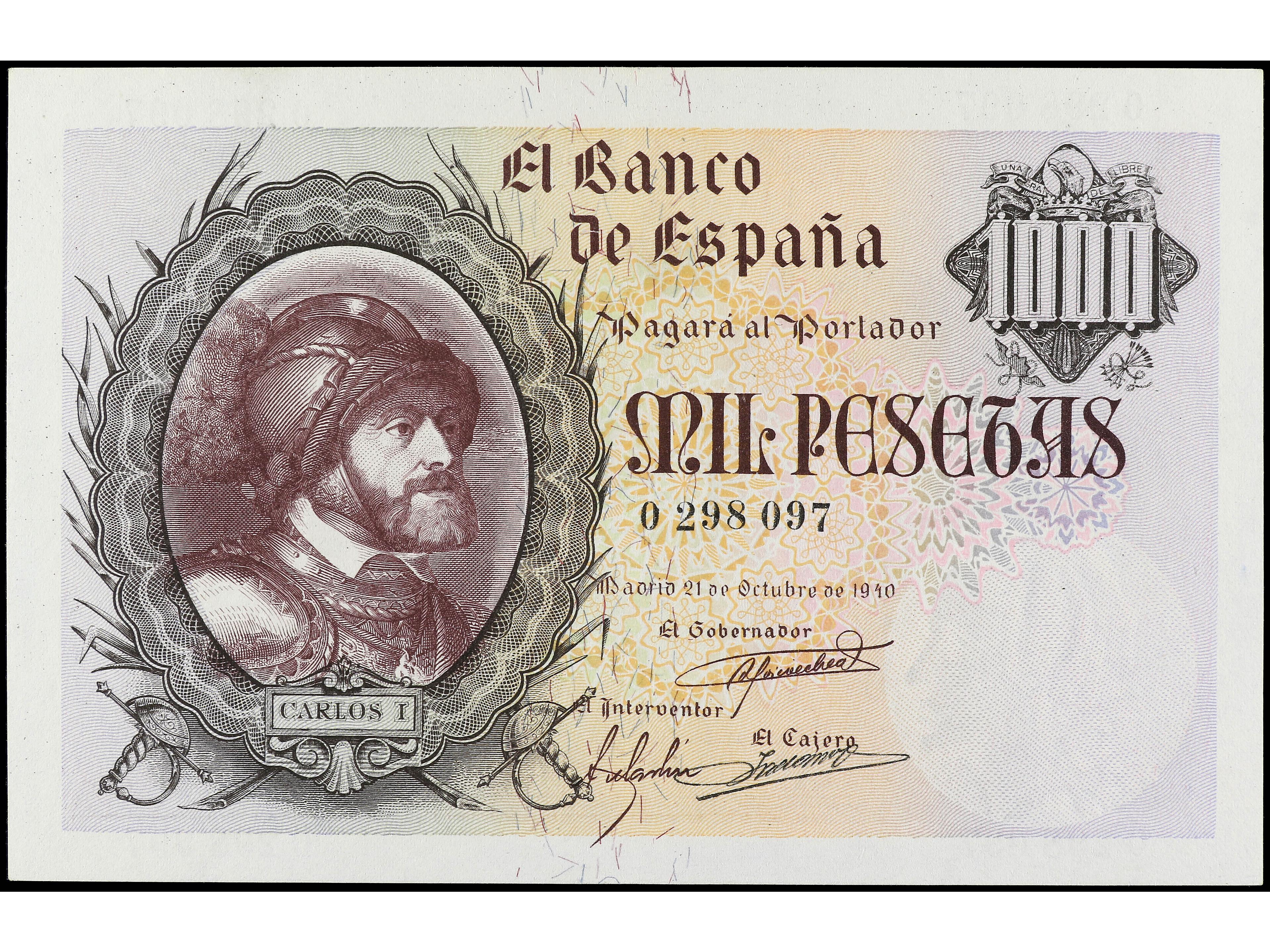 1.000 Pesetas. 21 octubre 1940. Carlos I. (3 Leves rayas verticales). Ed-445. EBC-. (Image1) (Image2)