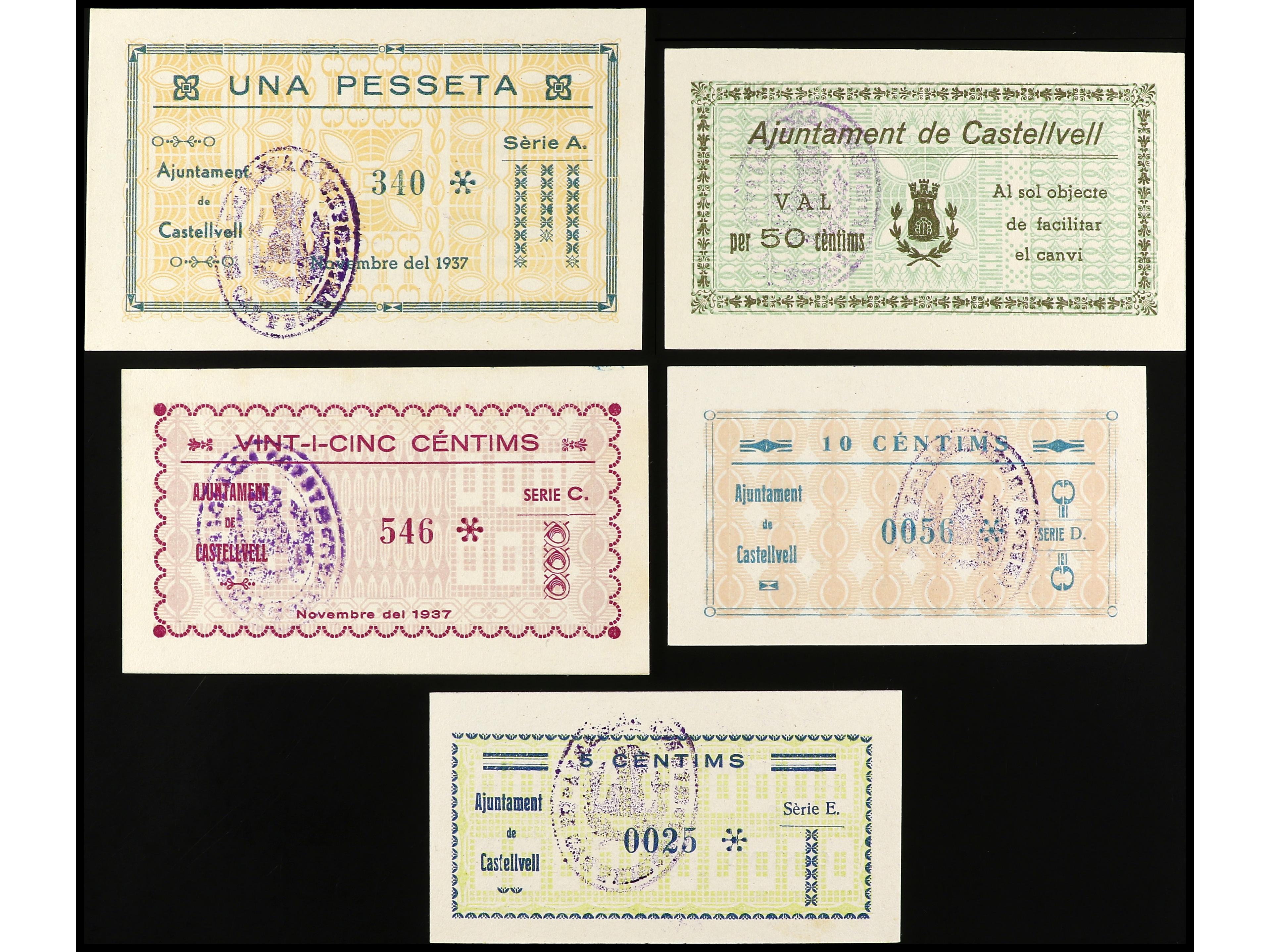 Serie 5 billetes 5, 10, 25, 50 Cèntims y 1 Pesseta. Aj. de CASTELLVELL. Serie completa. AT-775/79. SC. (Image1)