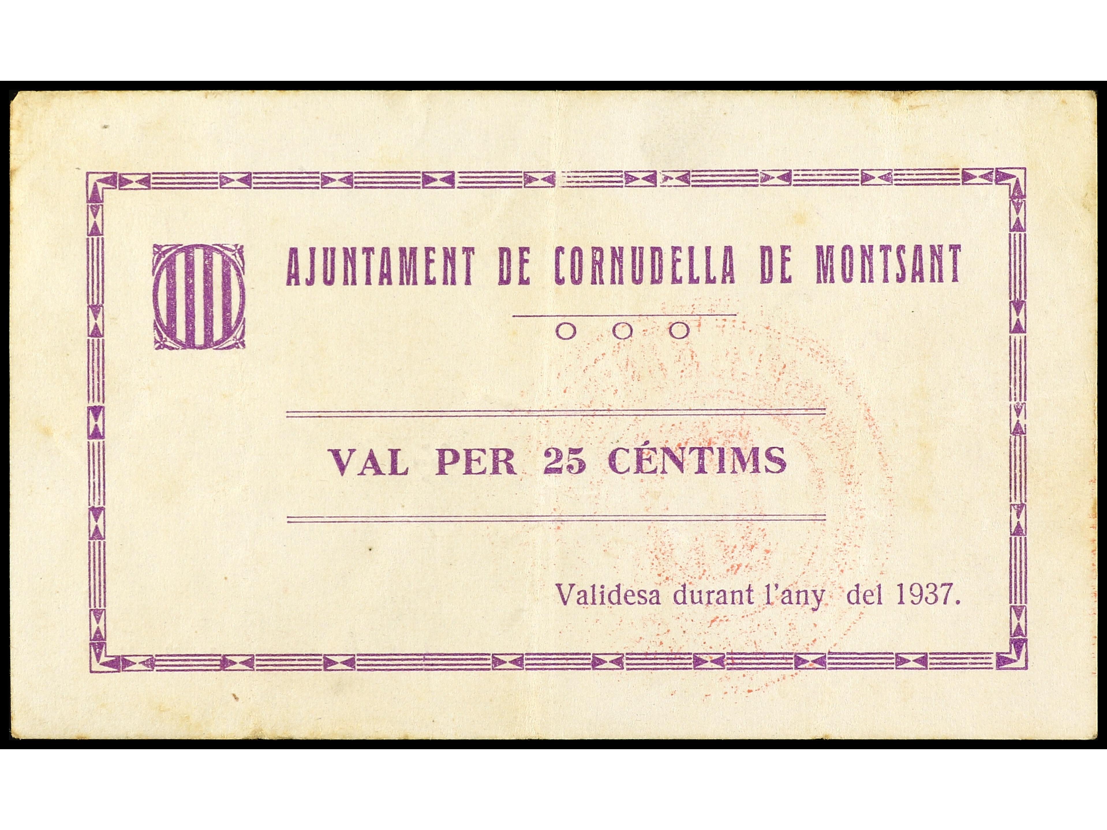 25 Cèntims. 1937. Aj. de CORNUDELLA DE MONTSANT. Tampón del Ayuntamiento al dorso. MUY RARO. AT-891. MBC. (Image1) (Image2)