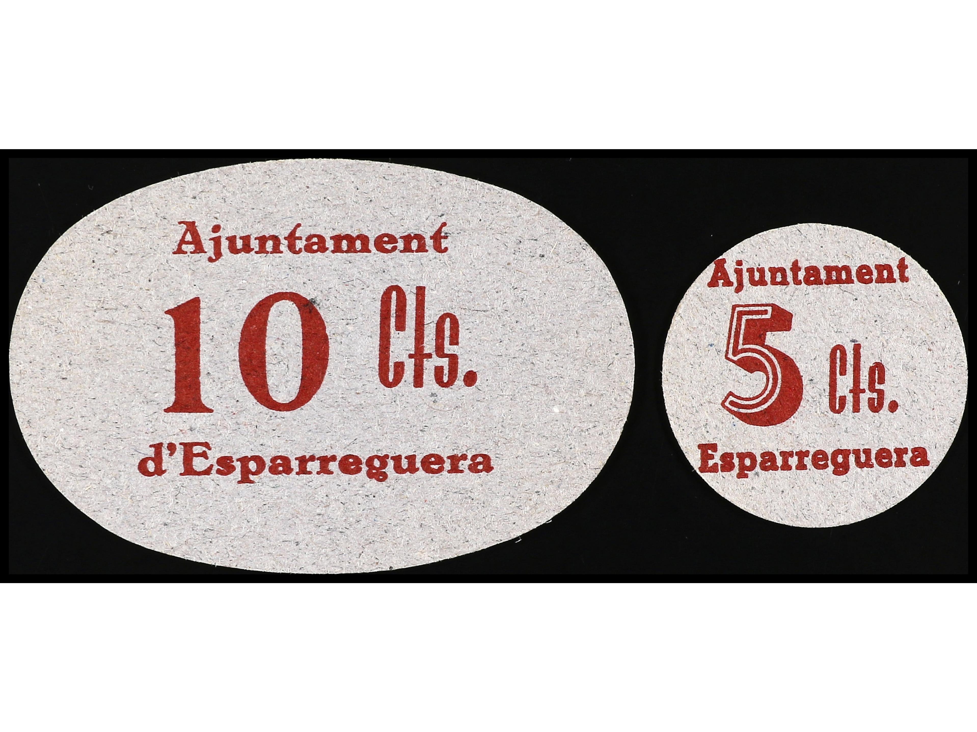 Lote 2 billetes 5 y 10 Cèntims. Aj. d´ ESPARRAGUERA. Cartón. RAROS. AT-943/44. SC-. (Image1) (Image2)
