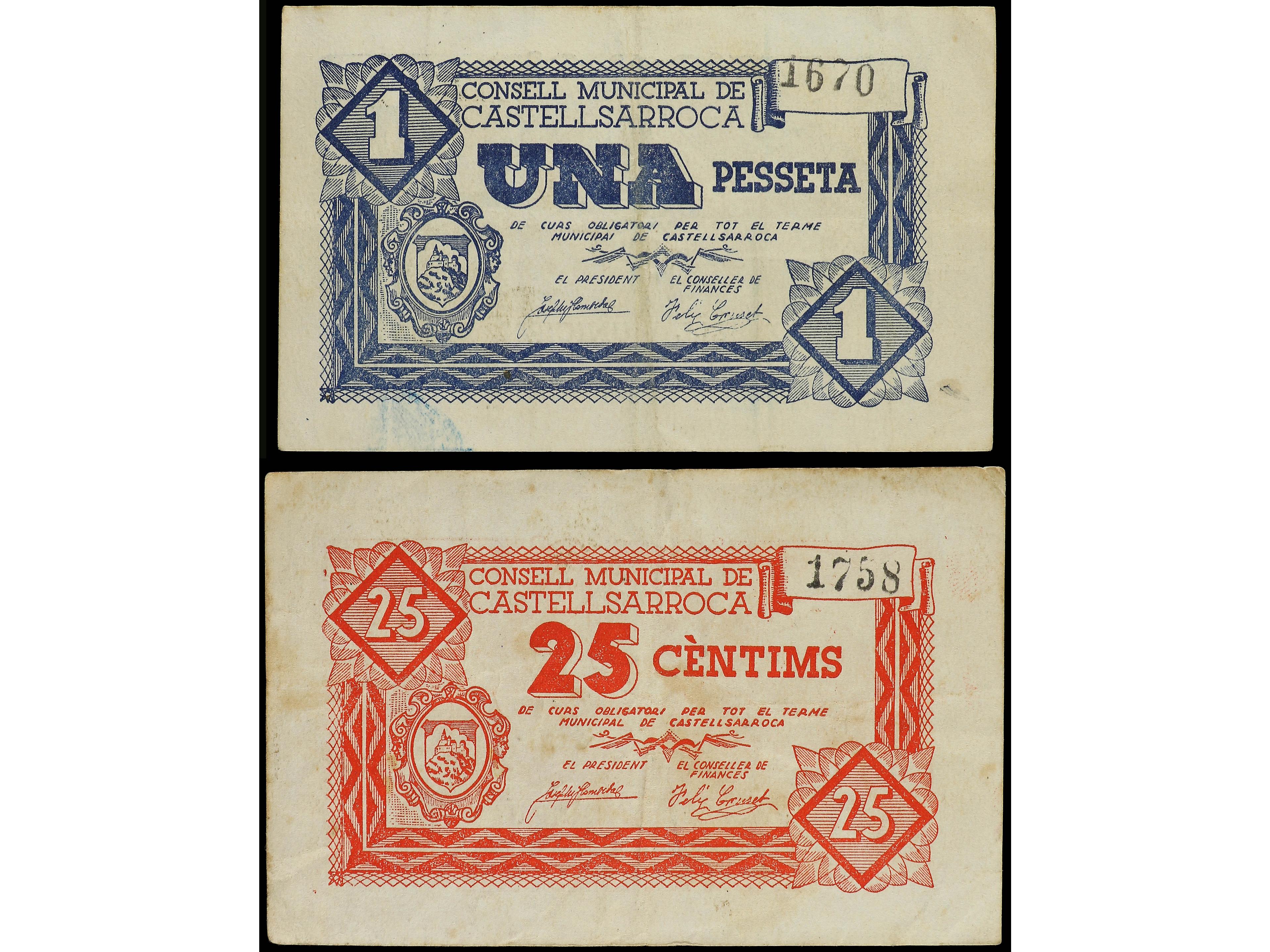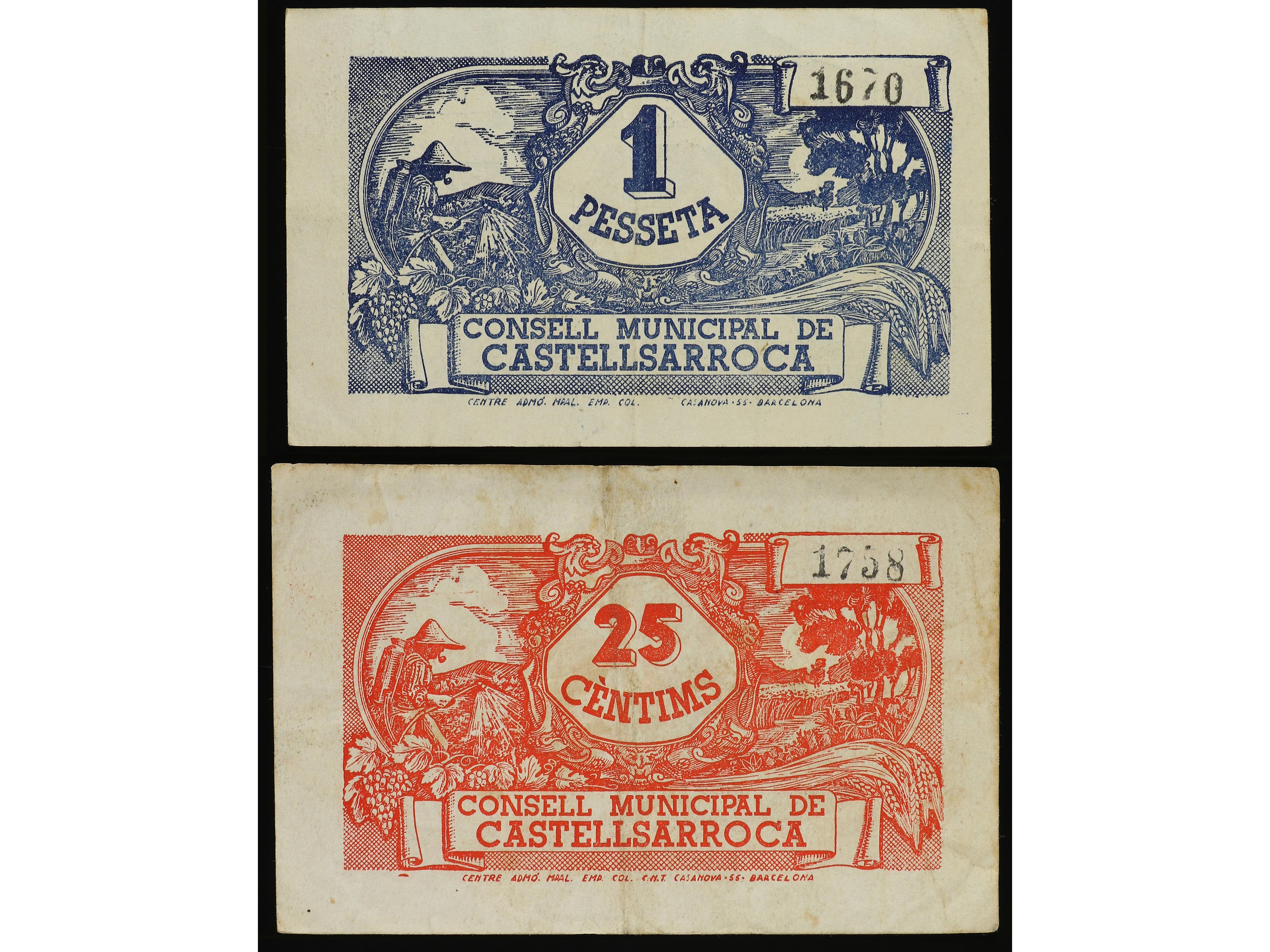 Lote 2 billetes 25 Cèntims y 1 Pesseta. C.M. de CASTELLSARROCA. AT-761/62. MBC. (Image1) (Image2)